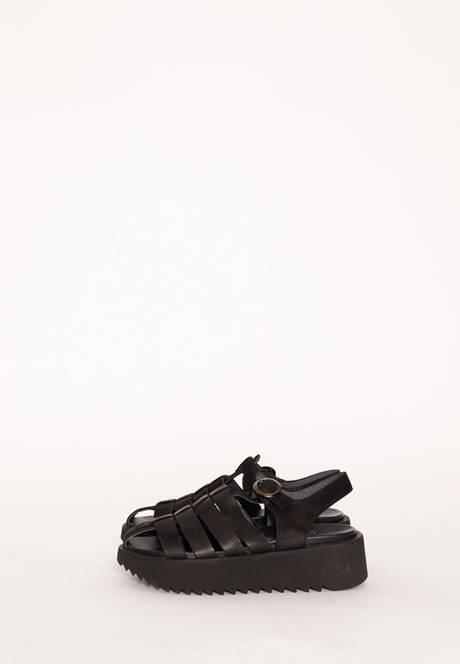 Lofina shoe in black. This model is made with velcro straps and a micro sole. This model is really cool it is made straps and closed with a small buckle.