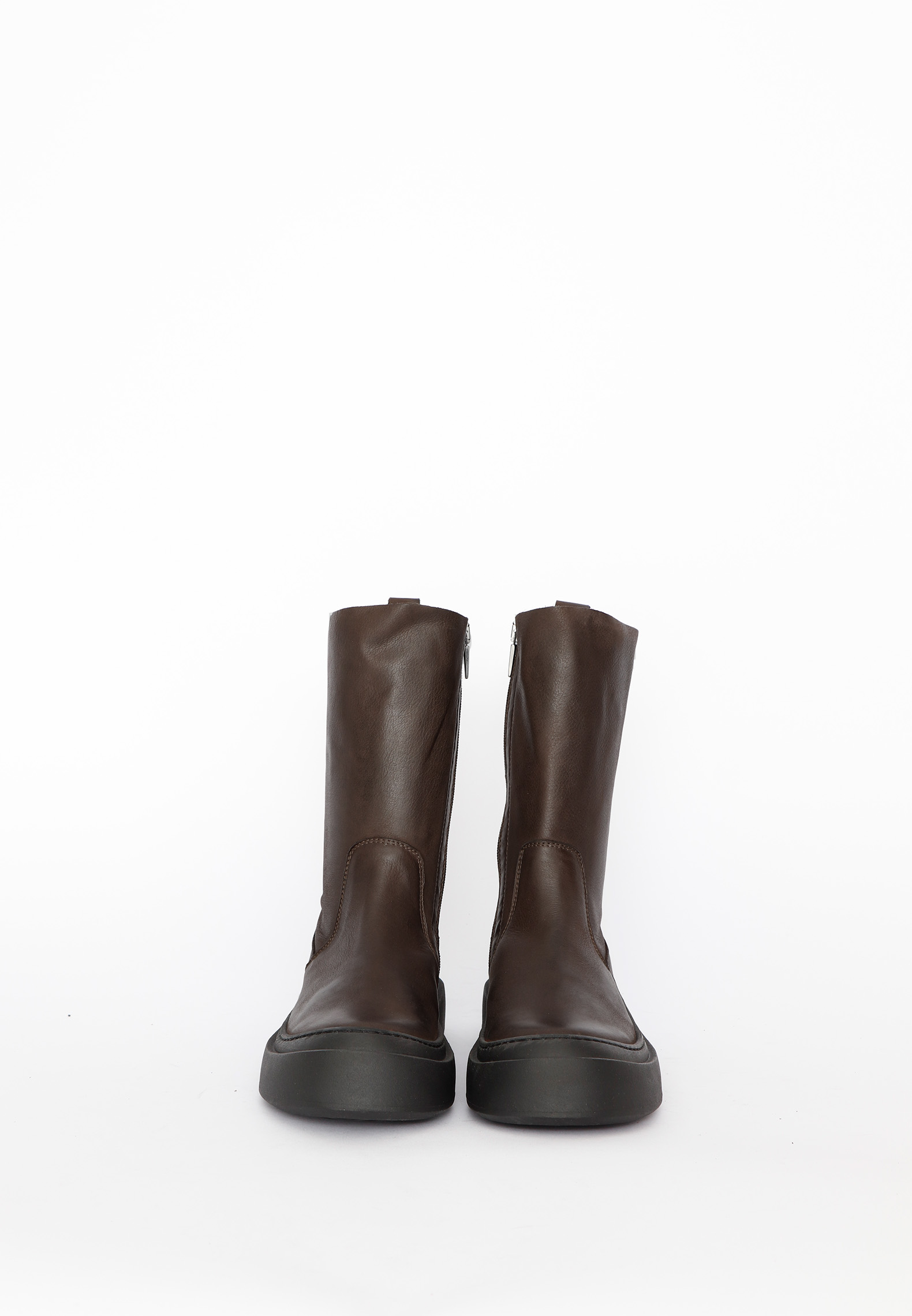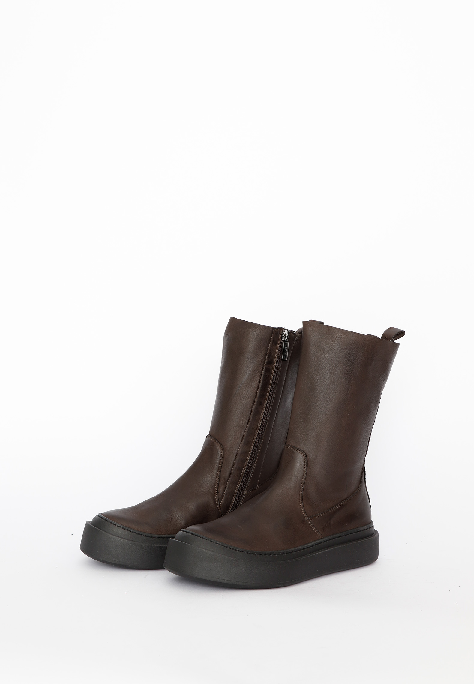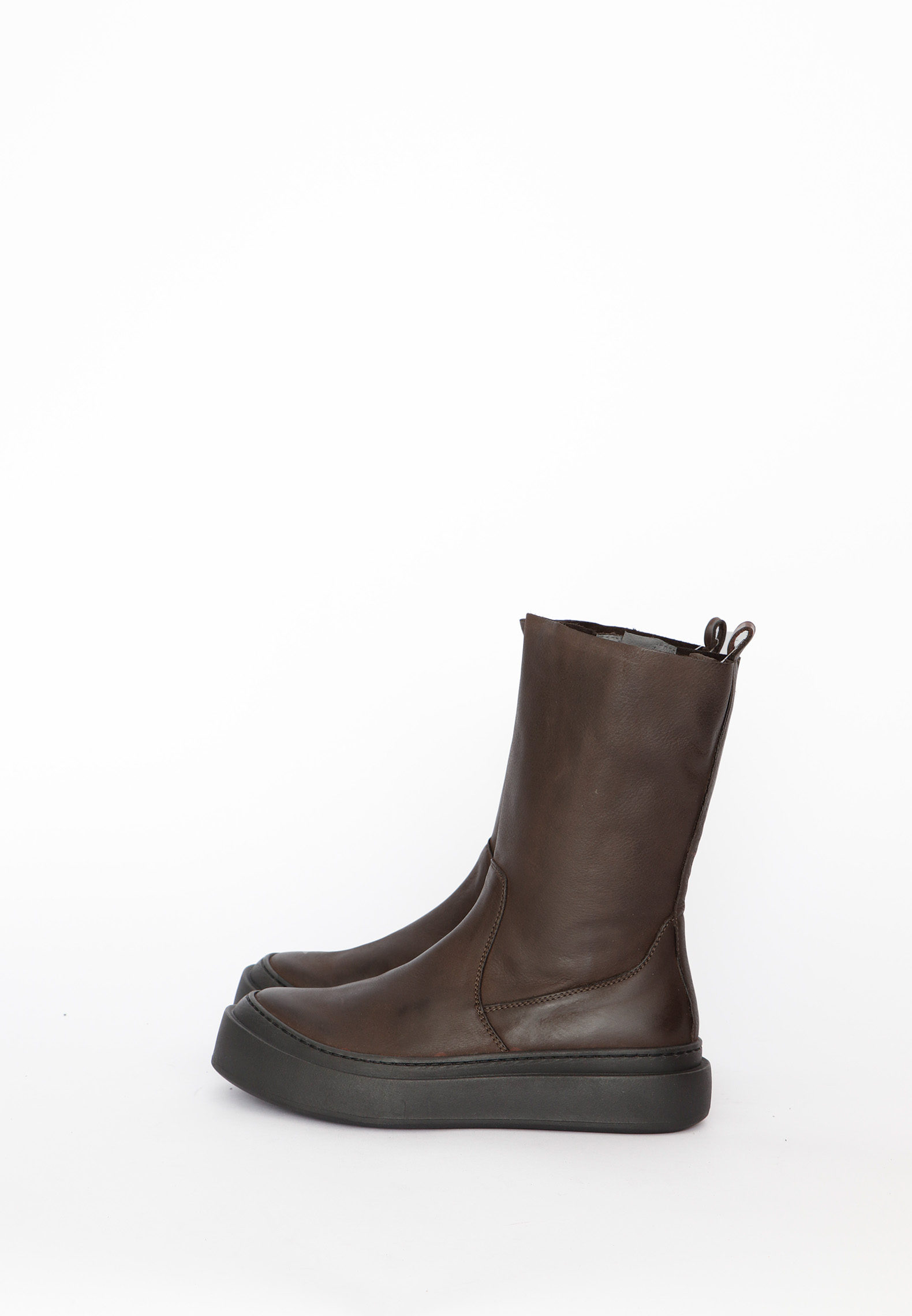Moderne og minimalistisk støvle med et fleksibelt uforet tubeskaft af mørkebrunt kalveskind. Det glatte skind og det enkle design giver støvlen et elegant og tidløst udtryk, mens materialet sikrer en god pasform og komfort. En lynlås i siden gør støvlen let at tage af og på, og den diskrete strop bagpå understøtter funktionaliteten. En alsidig støvle, der kombinerer komfort, enkelthed og et raffineret look. Dertil kommer støvlen med en enkel og super behagelig sål.