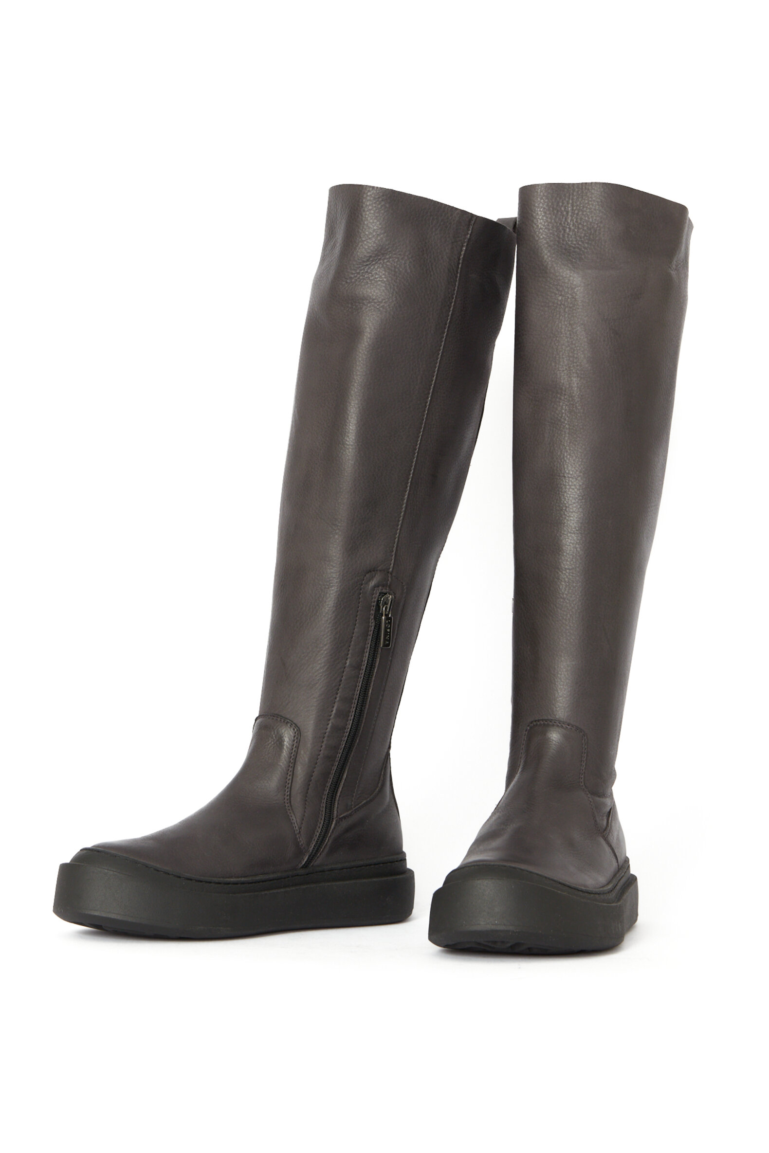 Moderne og minimalistisk lang støvle i gråt glat kalveskind med et uforet tubeskaft. Støvlen kommer med lynlås så den er nem at få af og på. Sålen er fast men meget behagelig at gå på.Materiale