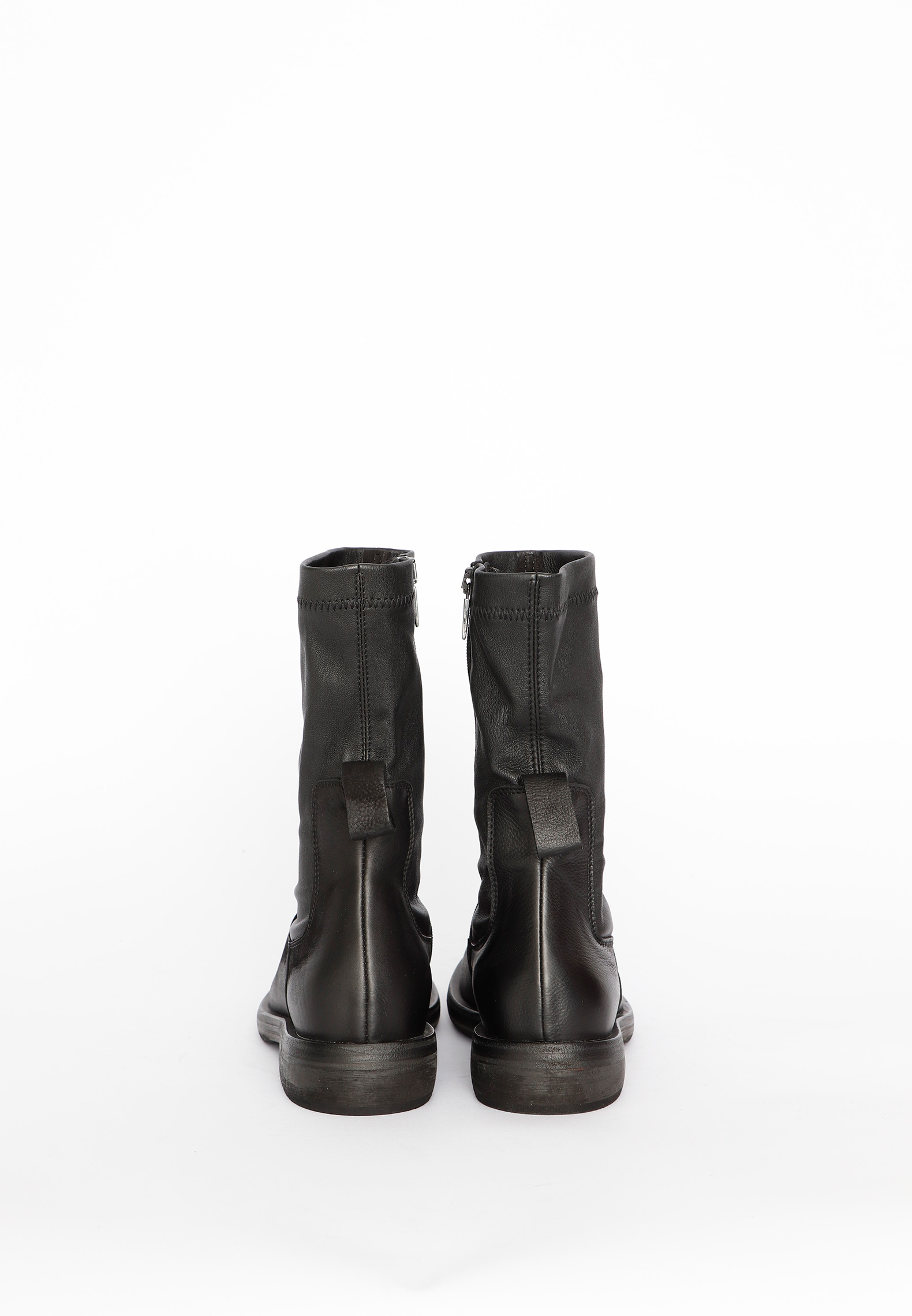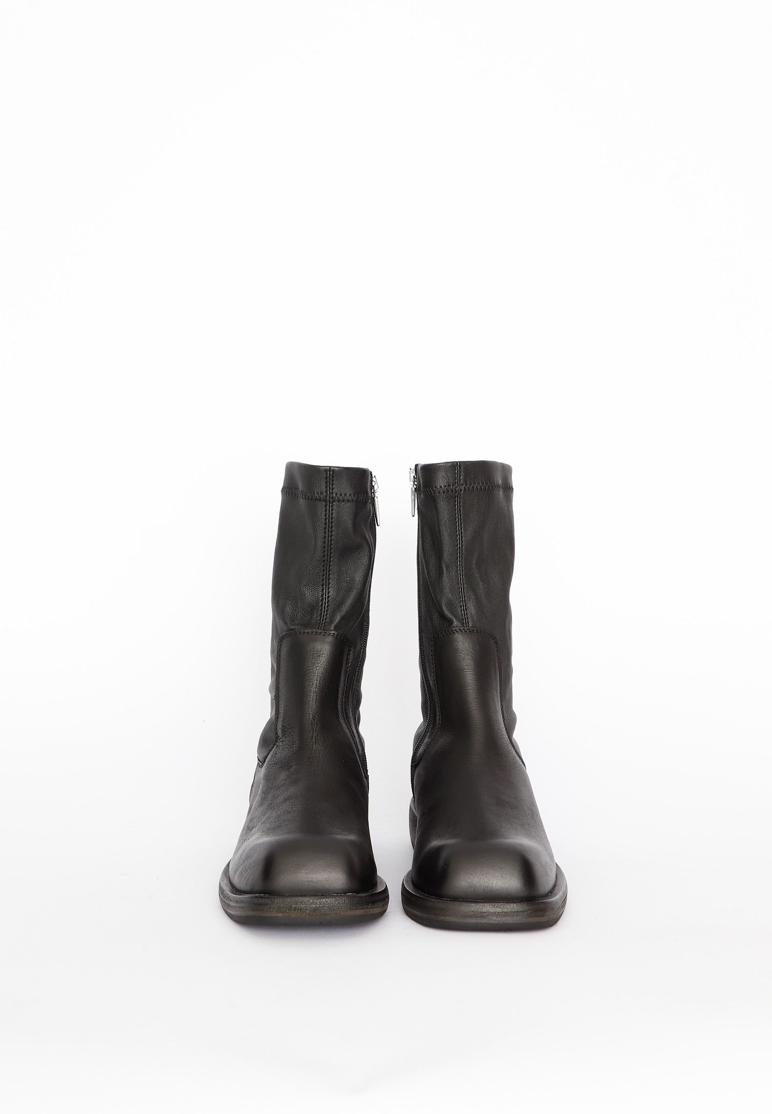 Støvle i blødt kalveskind med et skaft af strækskind. Støvlen har lynlås samt en strop for nem adgang. Bemærk desuden den kantet snude fortil. Lædersålen gør støvlen ekstra behagelig at have på. Stor i størrelsen.