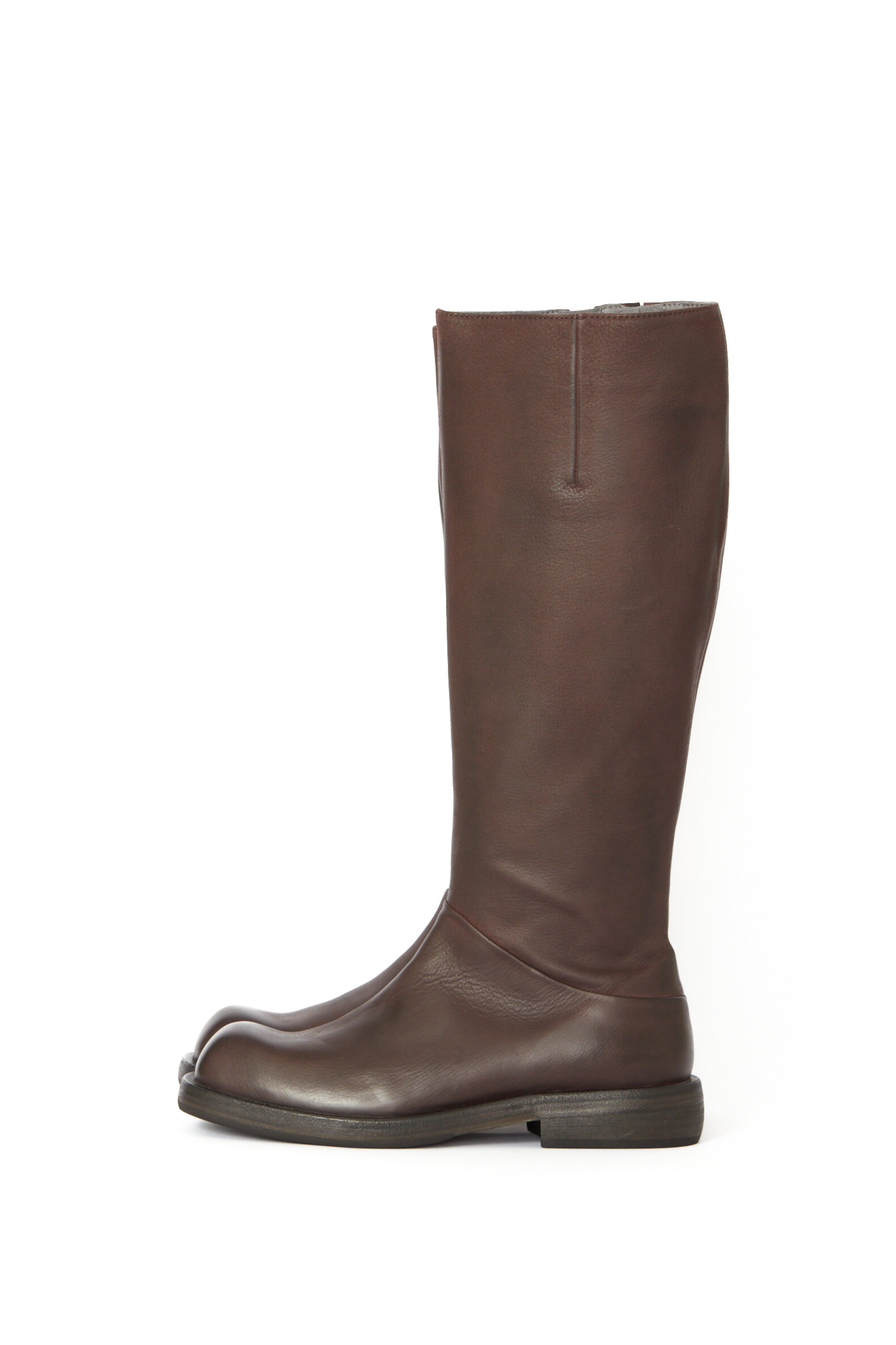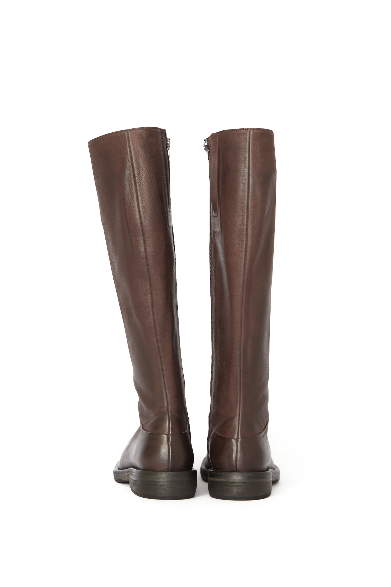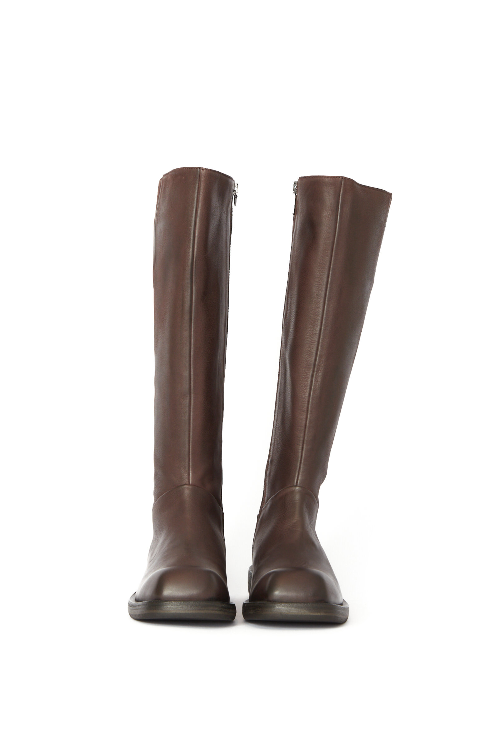 Lang flot støvle i blødt brunt kalveskind som er foret med svineskind for ekstra comfort. Støvlen har lynlås på indersiden så den er nem at få på og af. Lædersålen har en lille feminin hæl samt en kantet snude. Normal til stor i størrelsen.