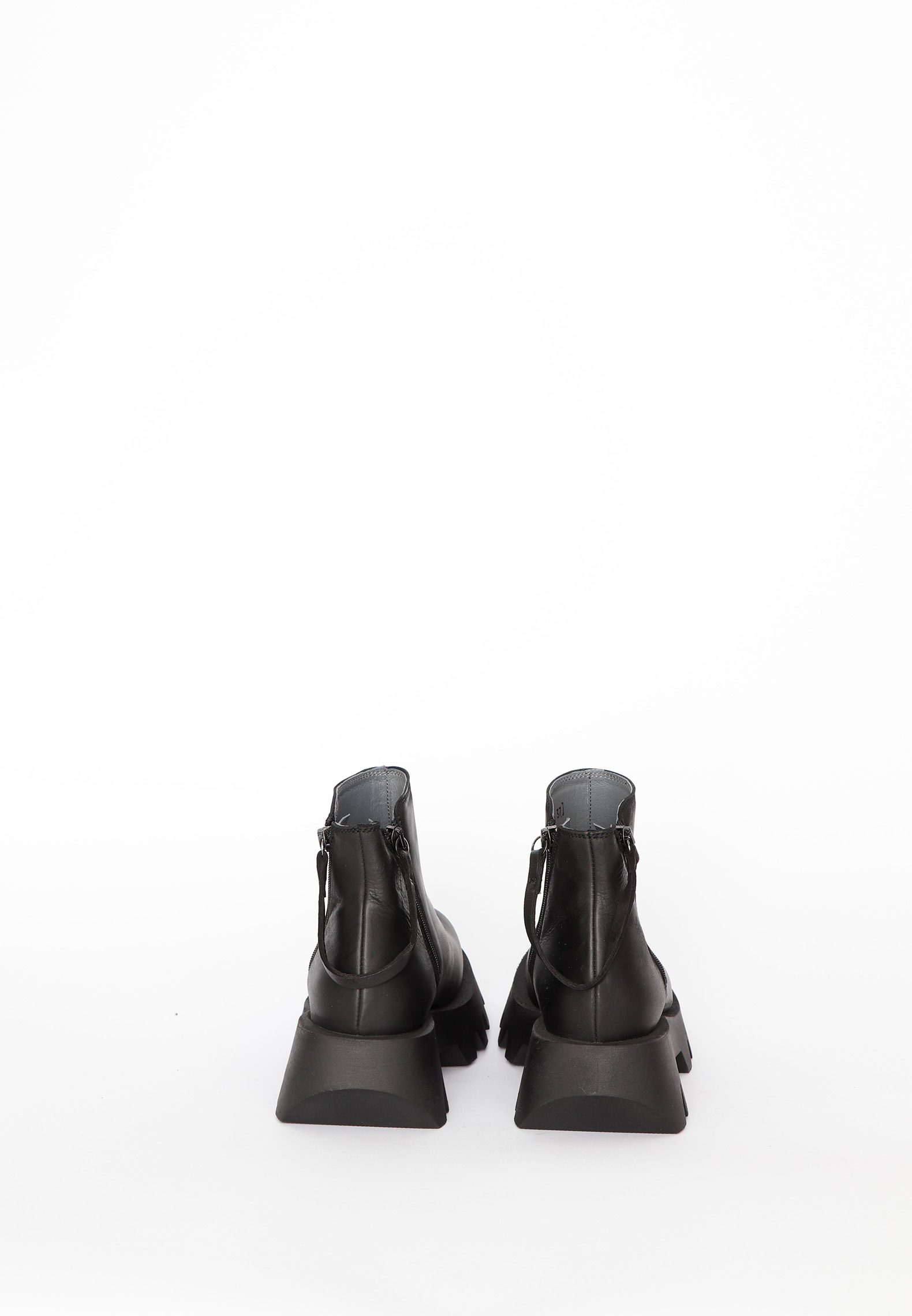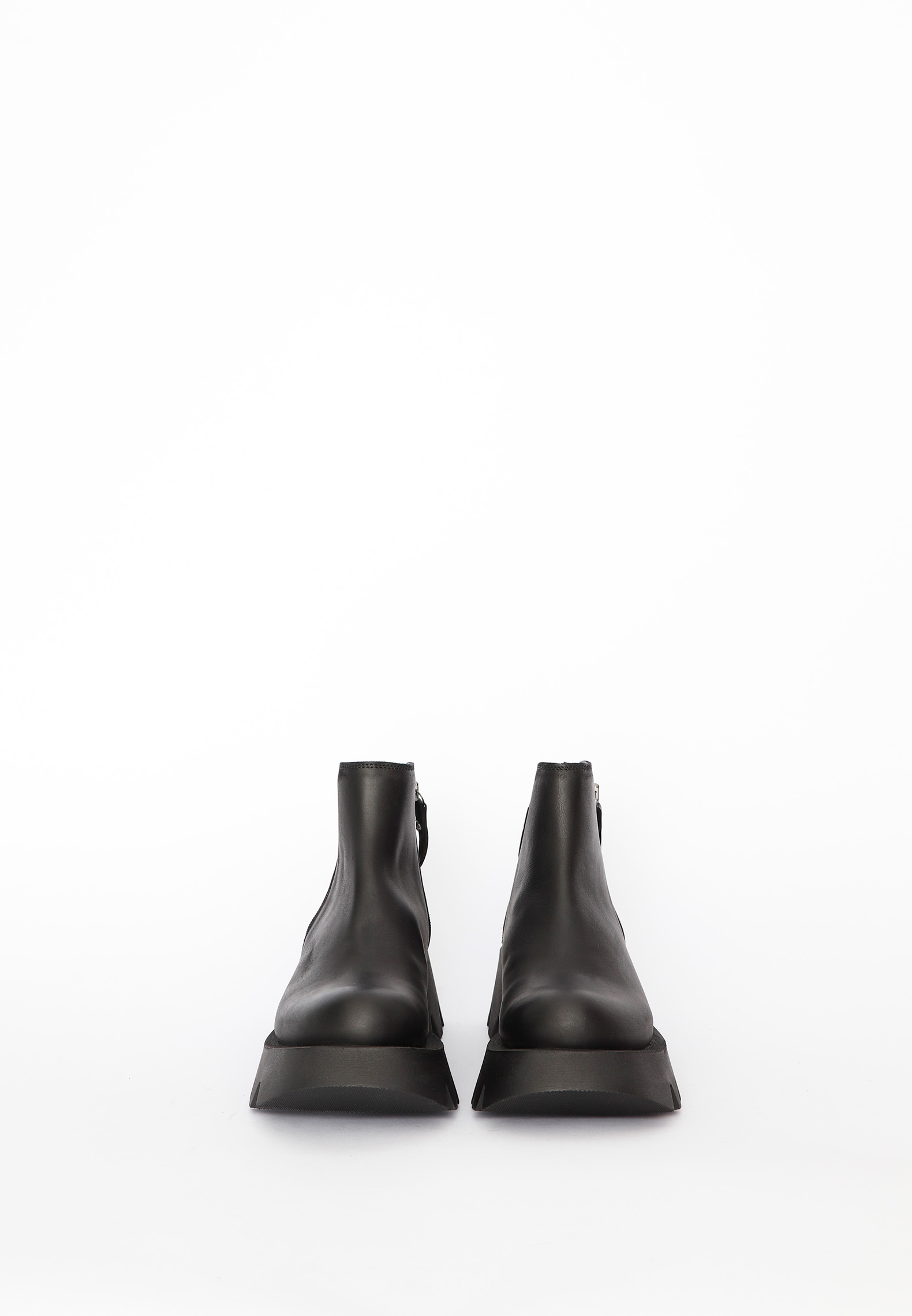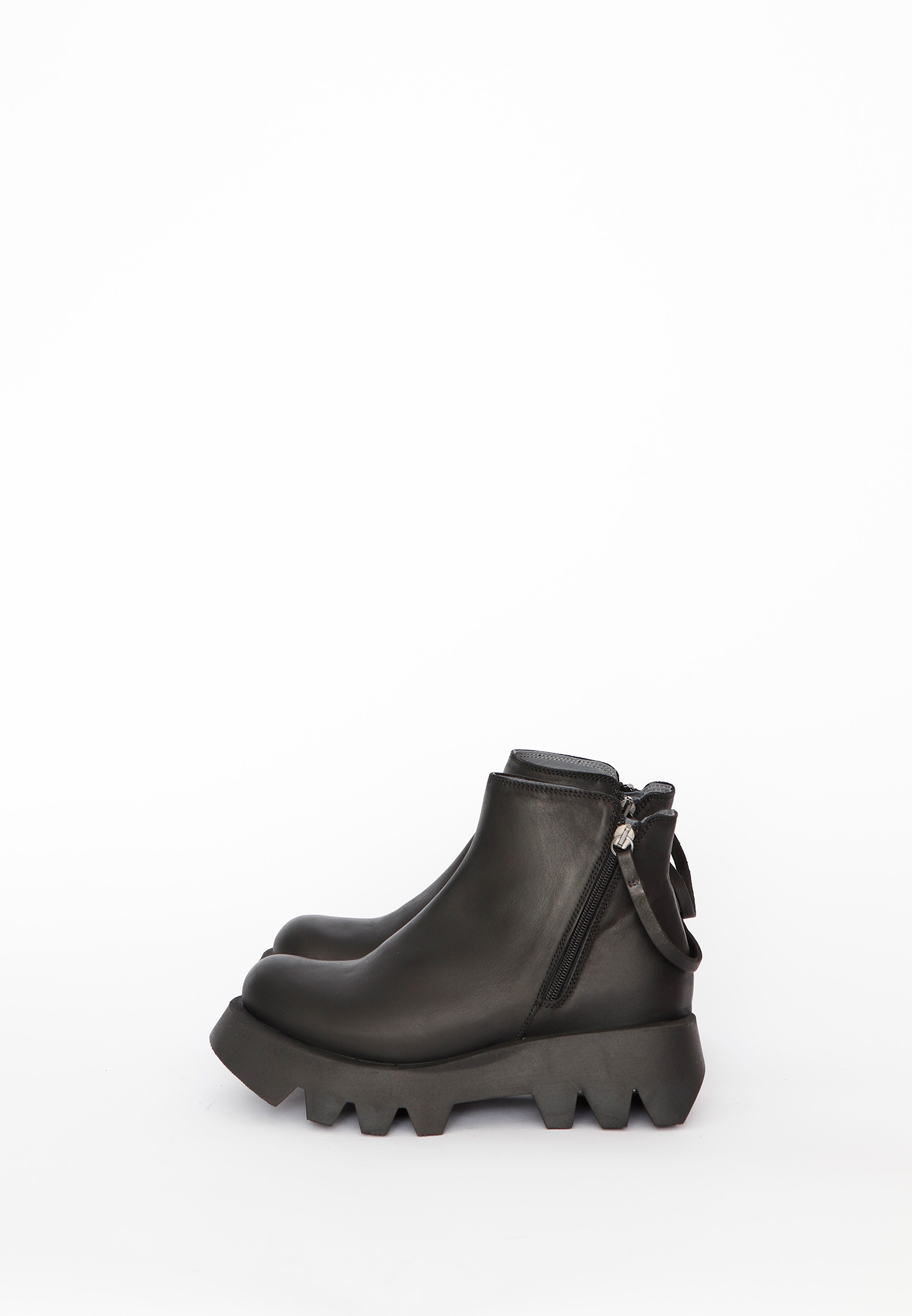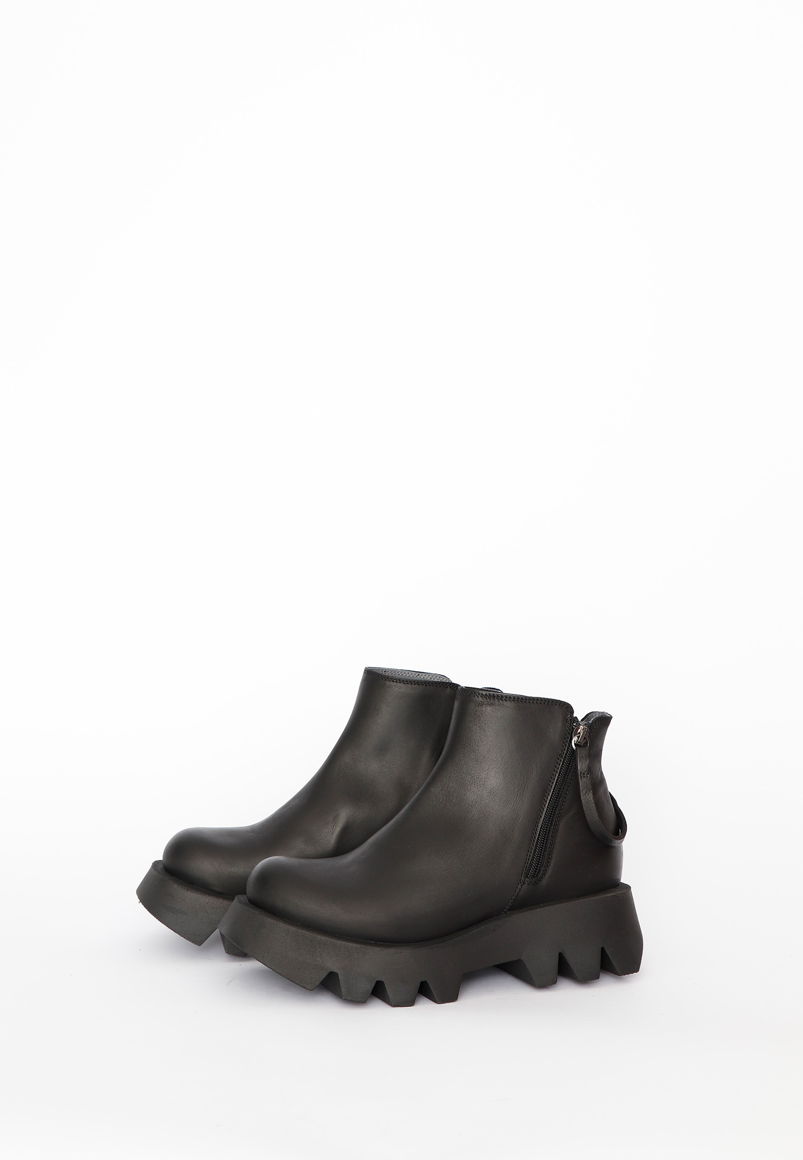 Kort støvle lavet i sort glat kalveskind og med en overraskende let sål. Det glatte skind og det enkle design giver støvlen et elegant og tidløst udtryk, mens den indvendige foring med svineskind sikrer en god pasform og komfort. Lynlåsen i begge sider og en strop af kalveskind, gør støvlen nem at få på og tage af, Her får du en alsidig støvle, der kombinerer komfort, enkelthed og et raffineret look. Desuden er sålen en letvægtssål på trods af sit chunky udseende.