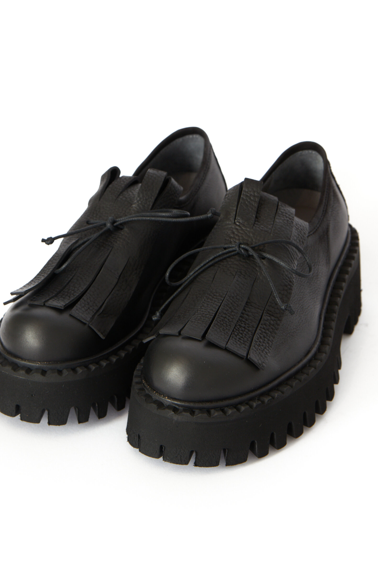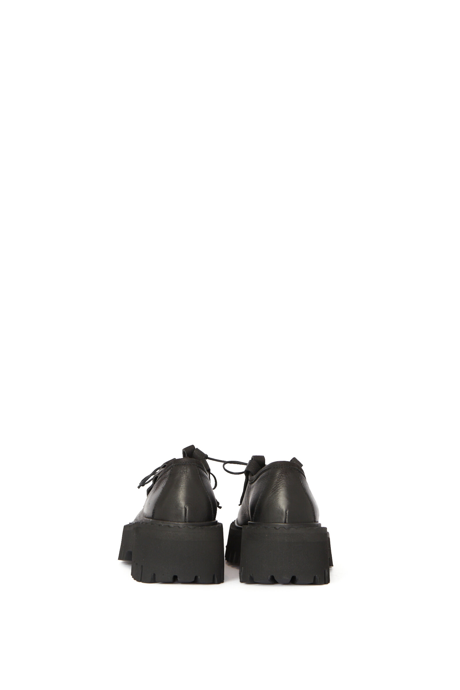 Sej sko i sort glat kalveskind, som er foret med svineskind for god åndbarhed og komfort. Skoen er med de sejeste fryser og en snøre. Den rå og lidt chunky sål giver skoen et smart udtryk samt en meget behagelig følelse at gå på. Normal i størreslsen.Materiale
