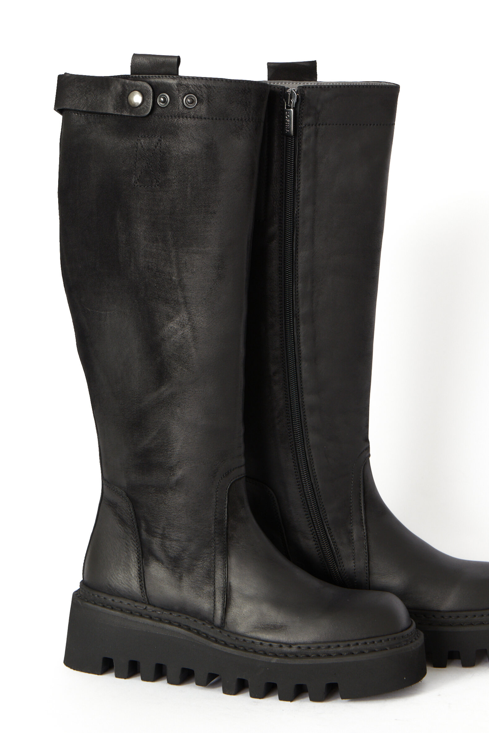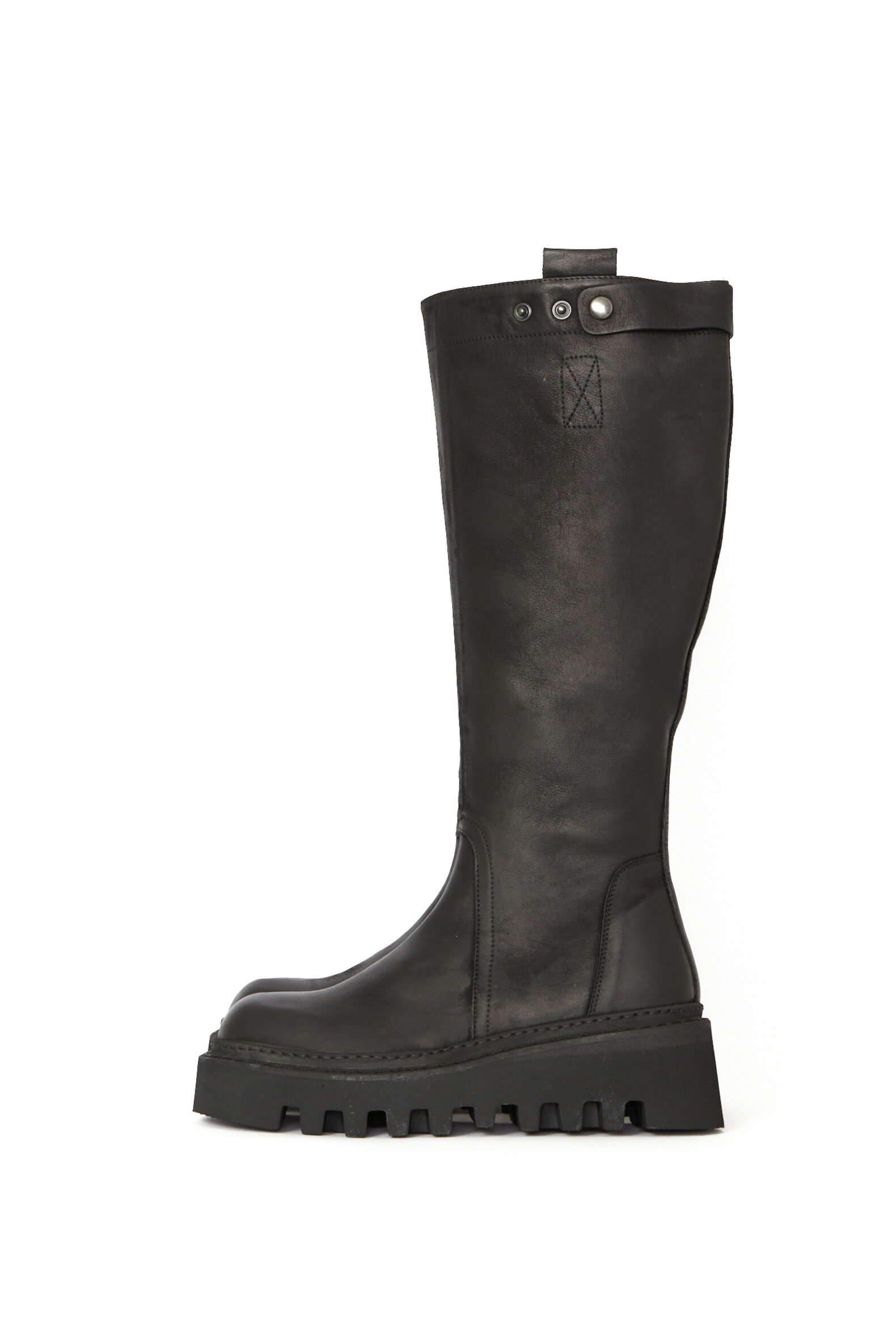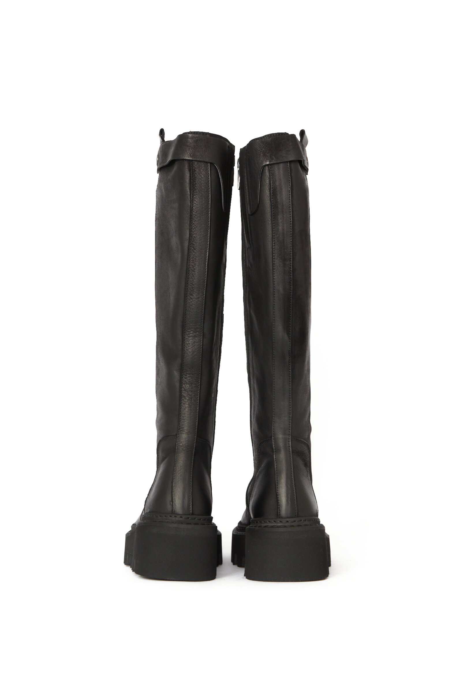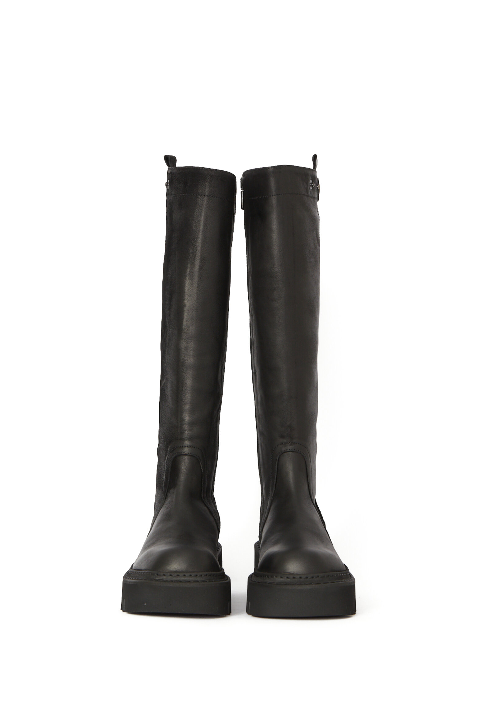 Lang støvle lavet af eksklusivt kalveskind og foret med blødt svineskind, der sikrer naturlig åndbarhed og høj komfort. Støvlen har lynlås på indersiden for nem adgang, samt justérbar knaplukning foroven, så støvlens skaft sidder optimalt omkring dit ben. Den chunky men lette sål giver støvlen et råt og moderne udtryk kombineret med en overraskende behagelig pasform. Normal i størrelsen.Materiale