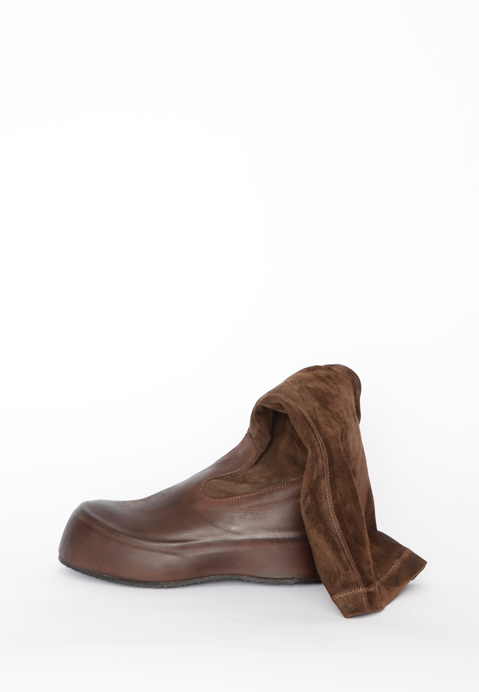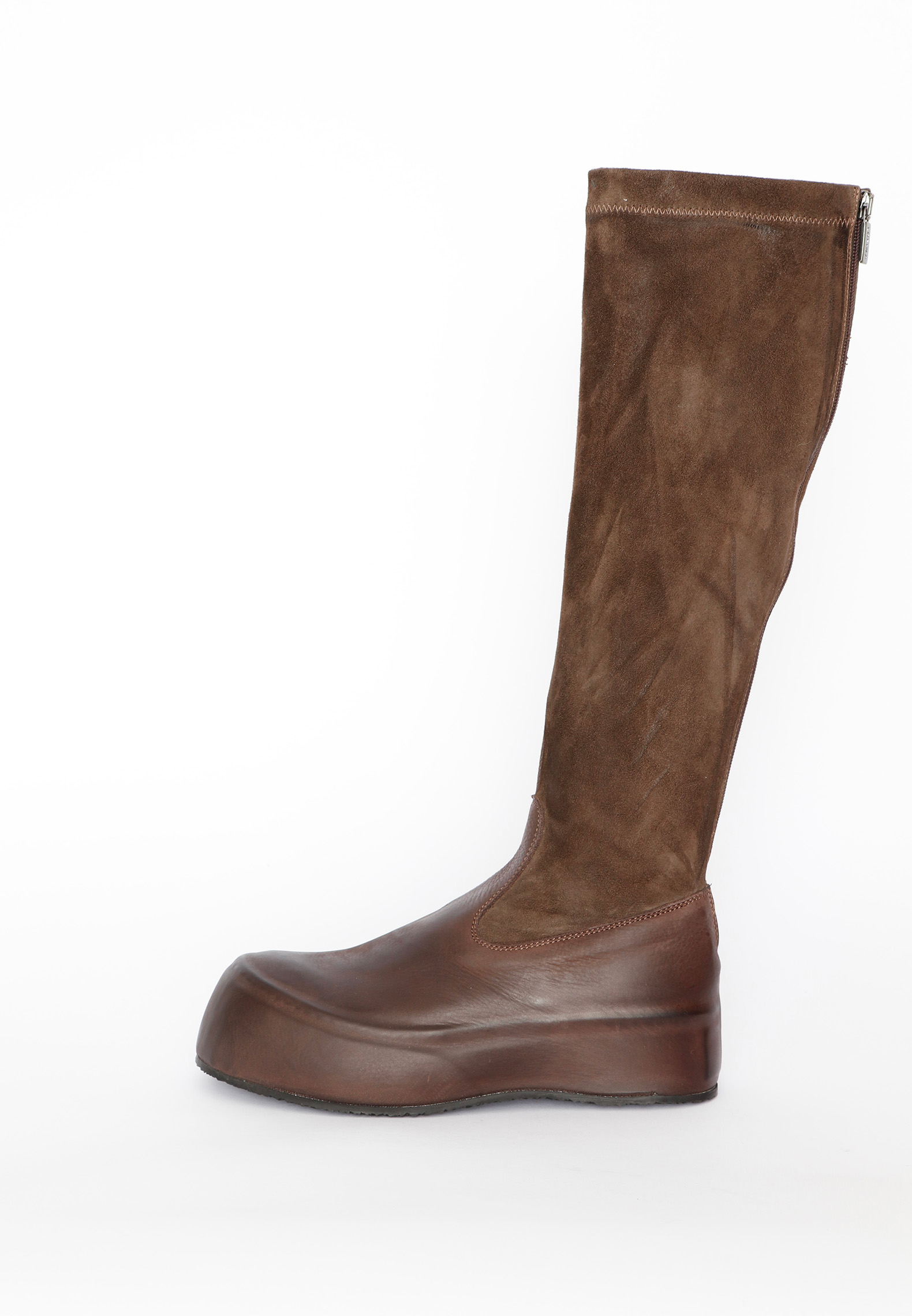 Lang strækskindsstøvle i mørkebrunt ruskind med lynlås. Støvlen kommer også på lager i andre farver, dog ikke til pre order. Style eksempelvis støvlen med et par 3/4 skindbukser som vist på billedet.