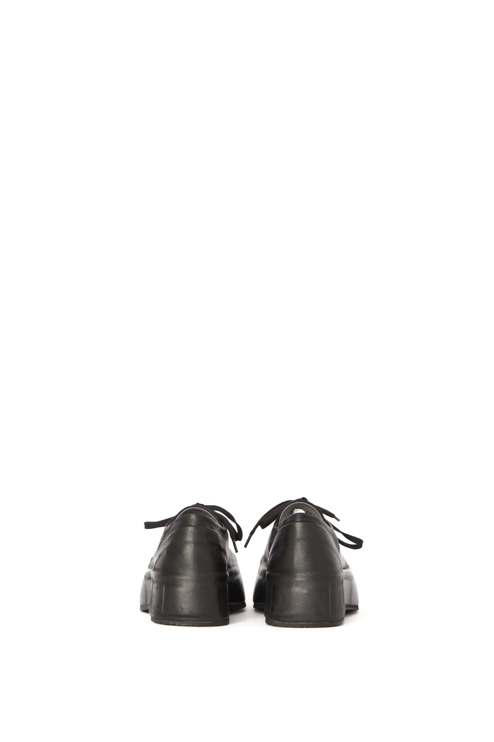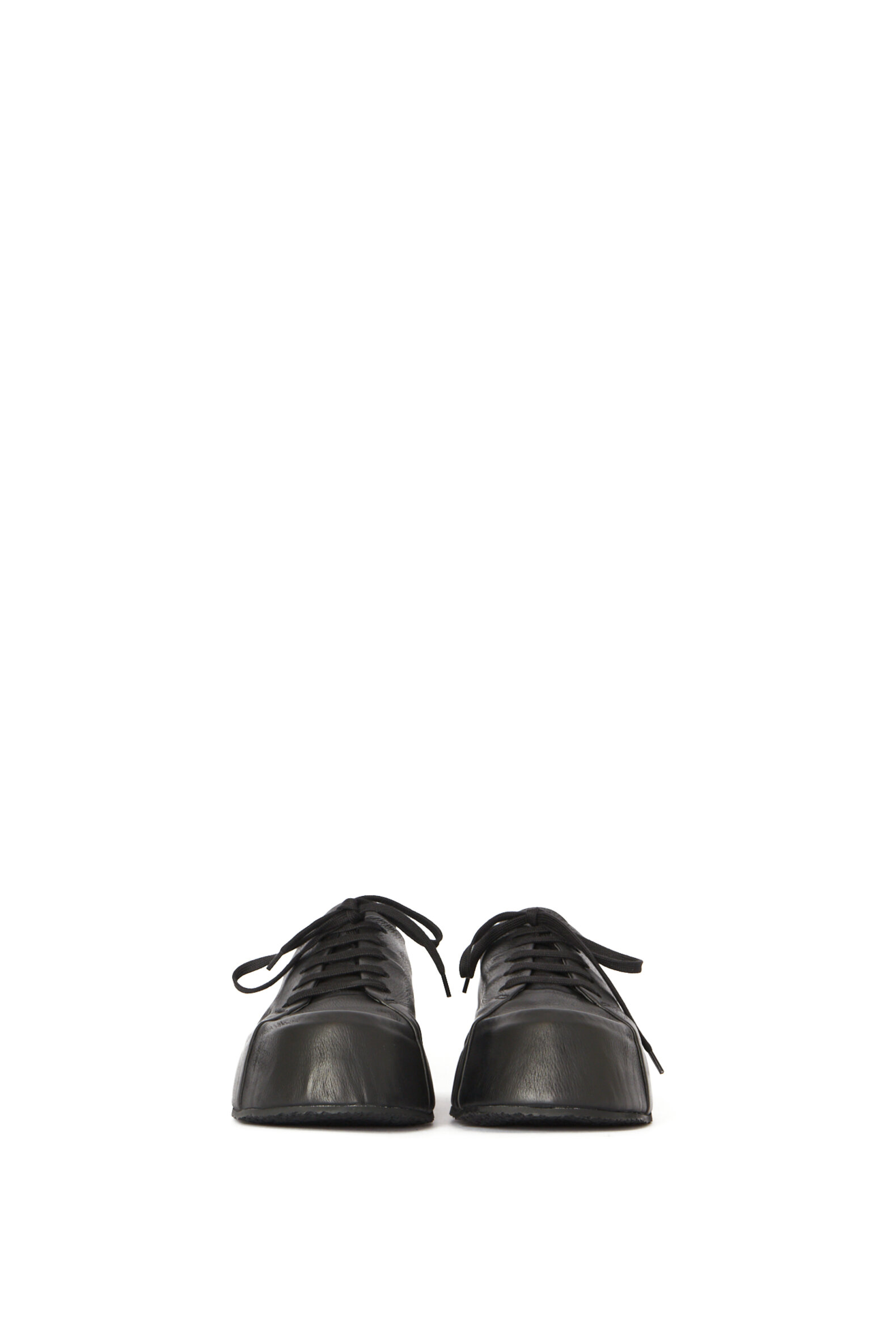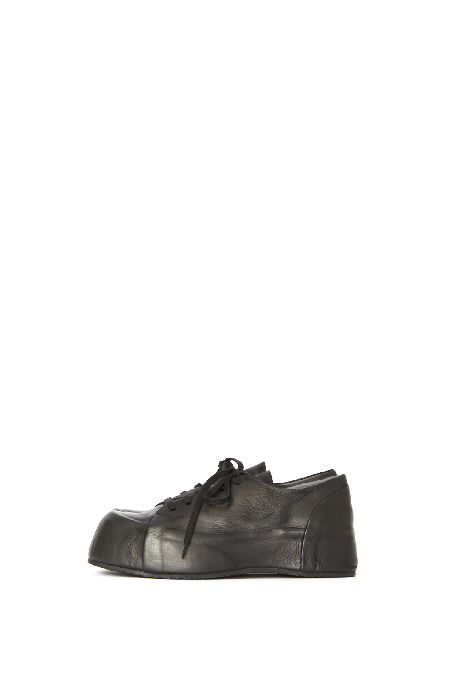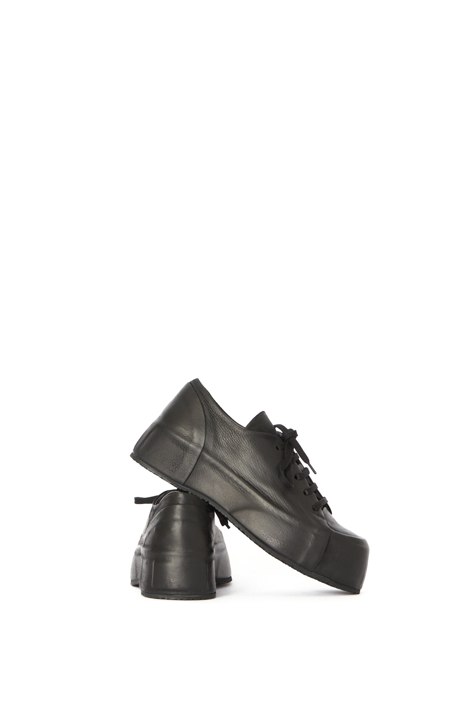 Sko i sort kalveskind foret med svineskind for ekstra god åndbarhed og komfort. Skoen har snøre. Læg særligt mærke til detaljen med kalveskindet som går ned over sålen - Et nyt og super gennemført look. Sålen er chunky men overraskende let. Skoen er stor i størrelsen.Materiale