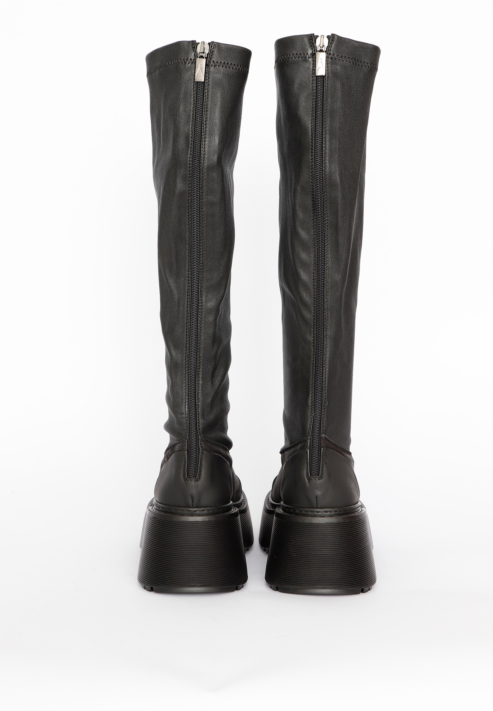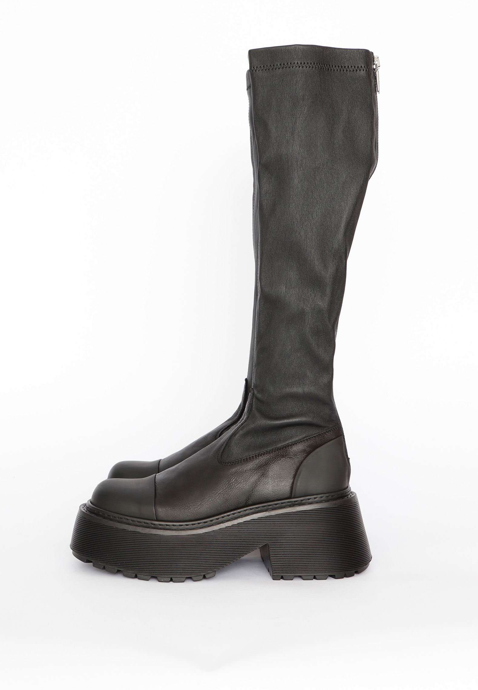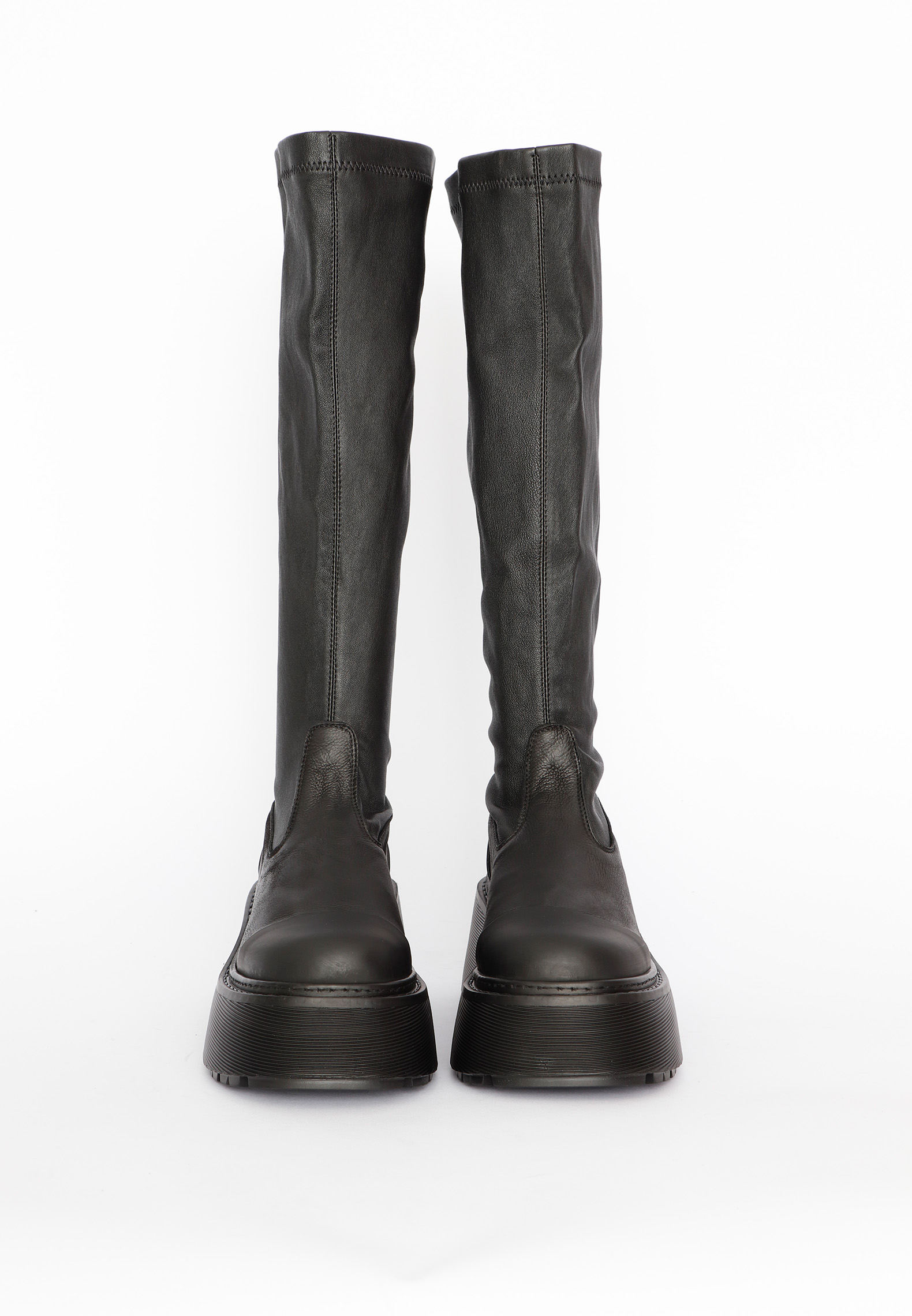 Long boot in soft calfskin with a shaft of stretch leather. The boot comes with a zipper for easy on and off. A cool and chunky sole with great comfort. A well known Sort Aarhus look.