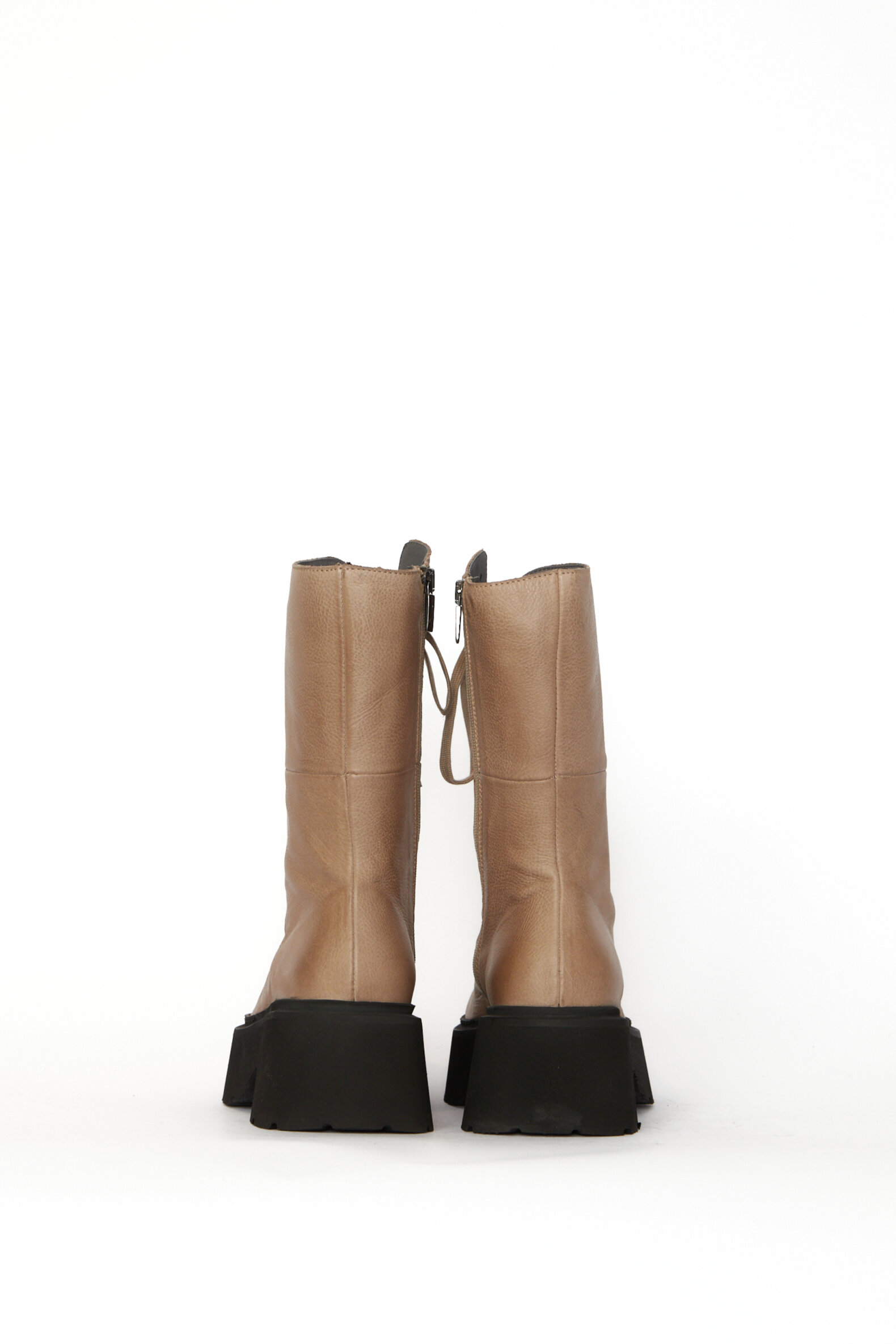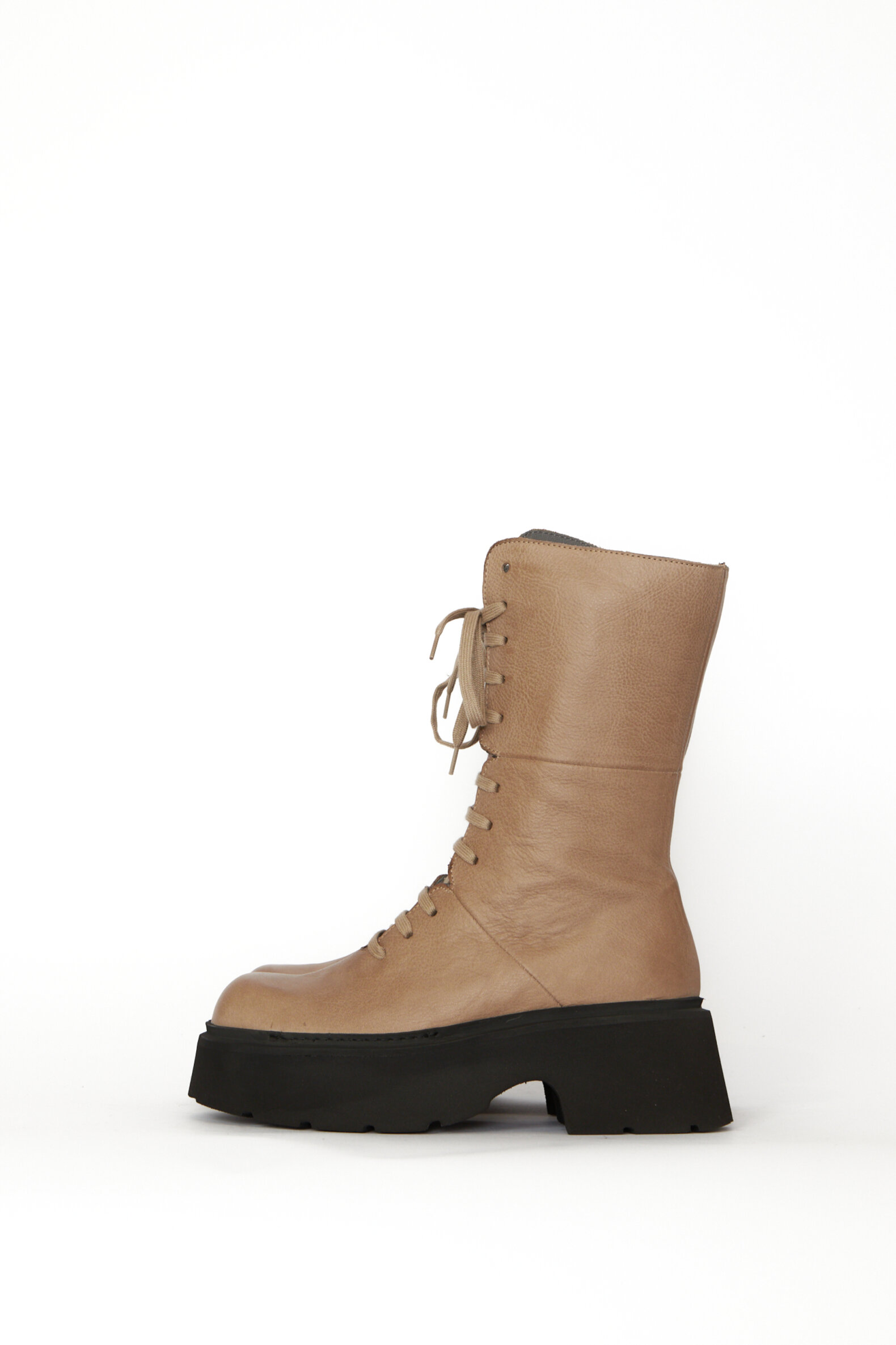 Støvle fra Sort Aarhus i blødt kalveskind lavet på en lille familieejet fabrik i det centrale Italien. Støvlen har foring af svineskind indeni for ekstra god åndbarhed og komfort. Modellen er med snørebånd i matchende tone (sorte snørebånd er vedlagt i skoæsken så du kan skifte farve), og på indersiden er en lynlås som gør støvlen nem at få på og af. Kommer med en feminin sål som måler 6 cm bagtil. Sålen er i øvrigt overraskende let. Normal i størrelsen.Materiale