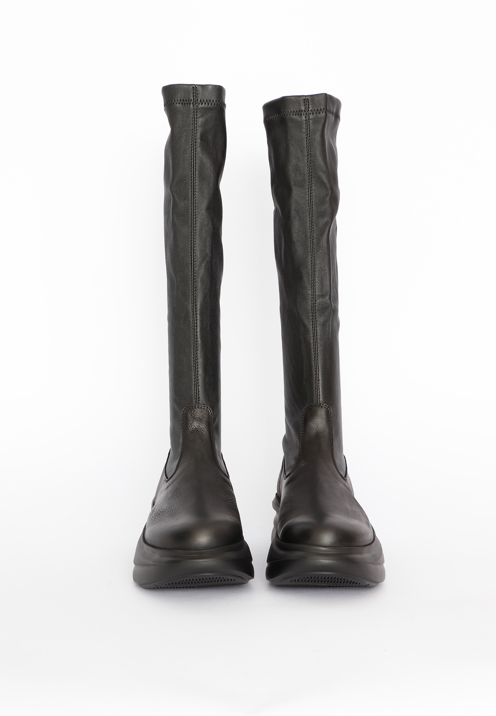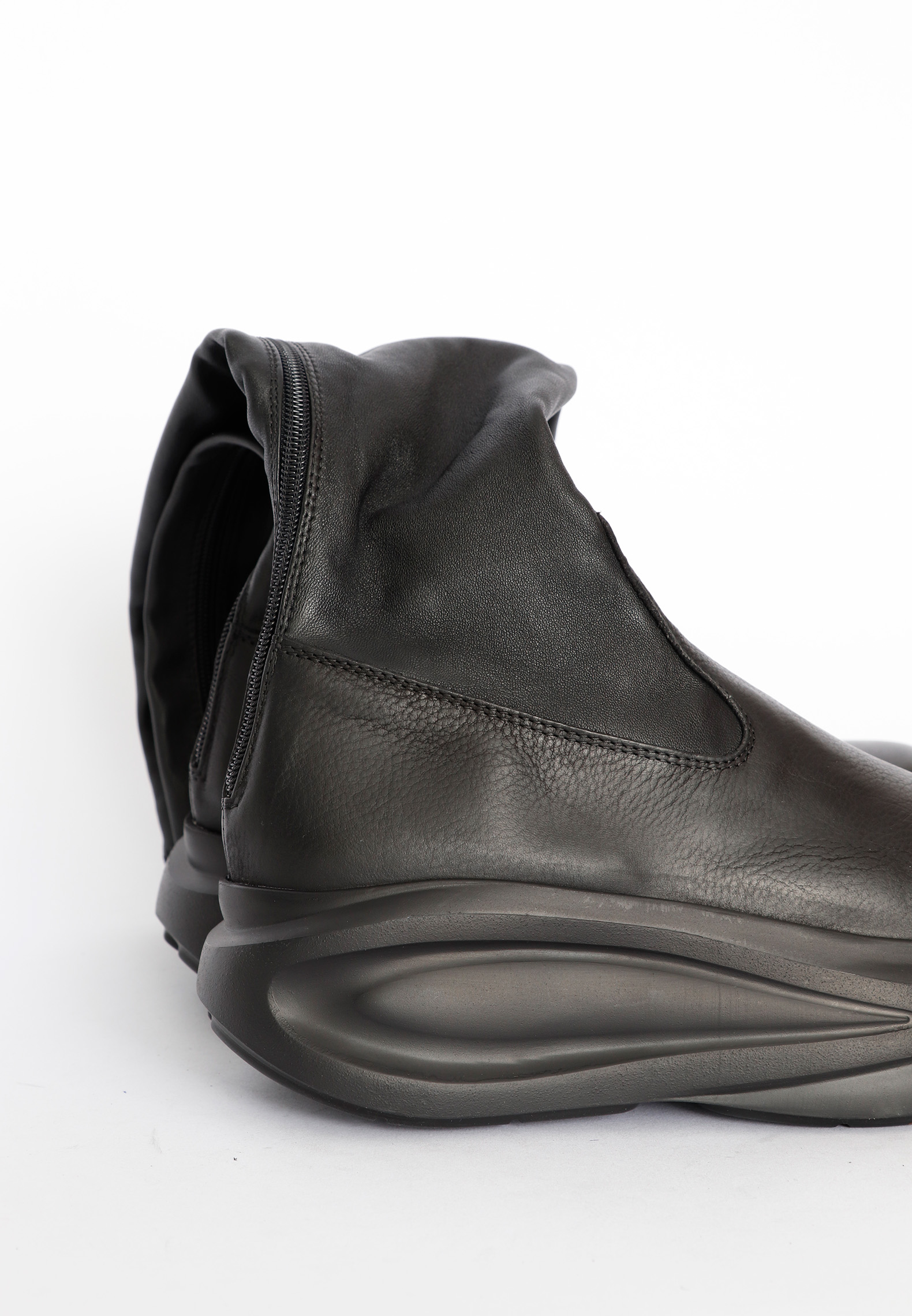 Long boot made in soft calfskin with a shaft of tight stretch leather. Inside the boot comes with a pigskin lining for extra breathability and comfort all day. The chunky sole in synthetic rubber adds a futuristic and almost spacious look. The combination of high quality materials and design makes the boot a statement piece, lifting any outfit to a higher level.