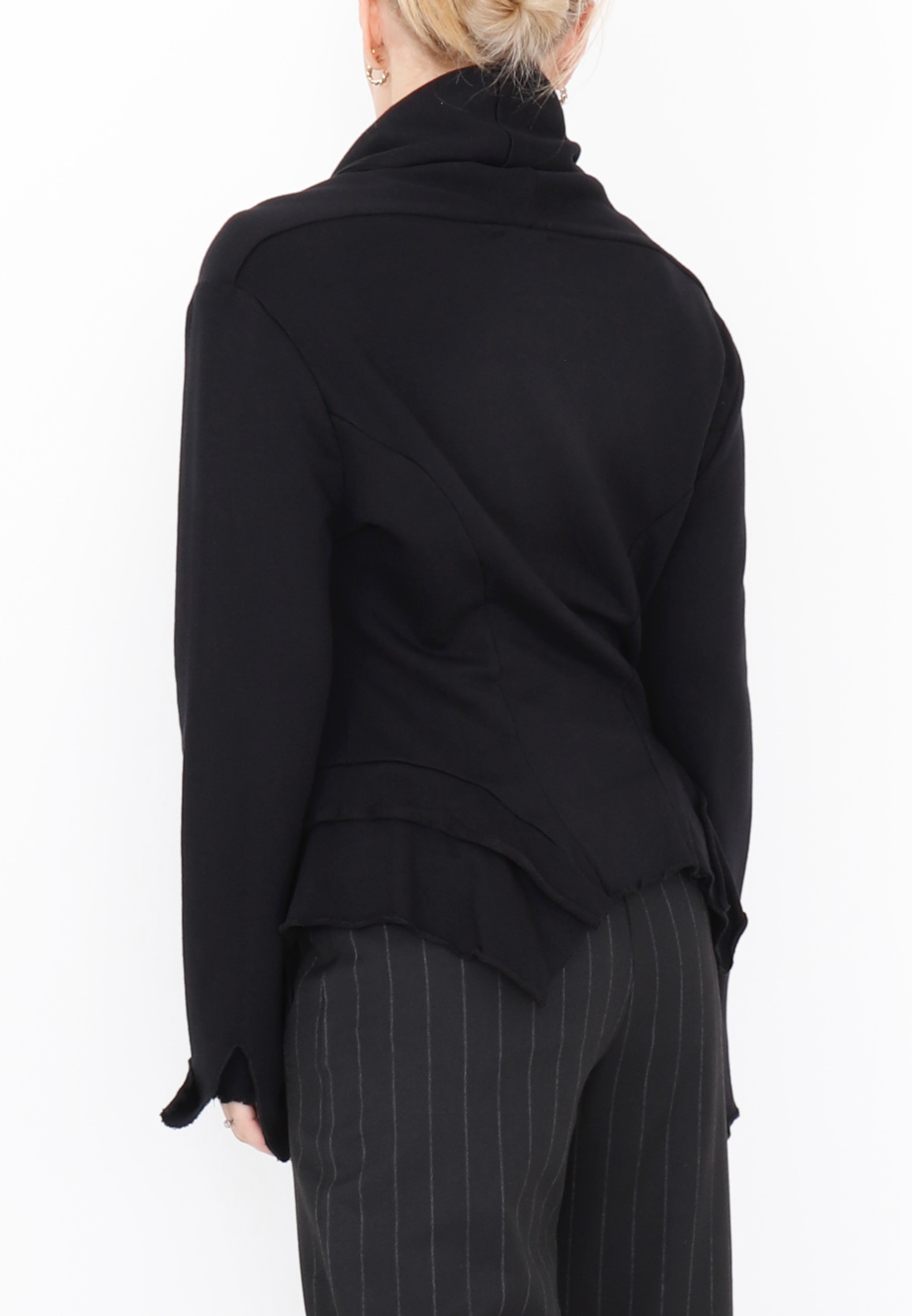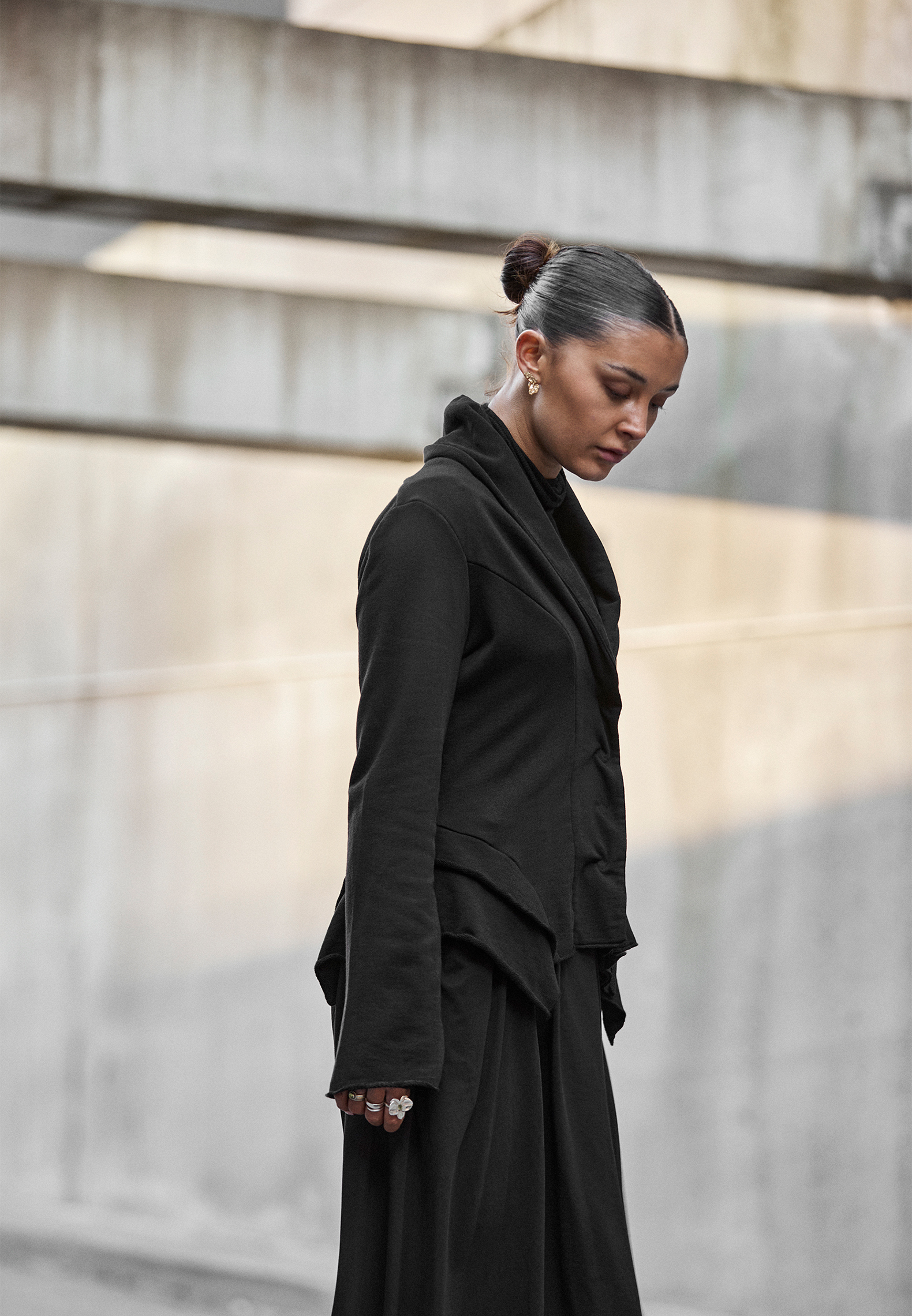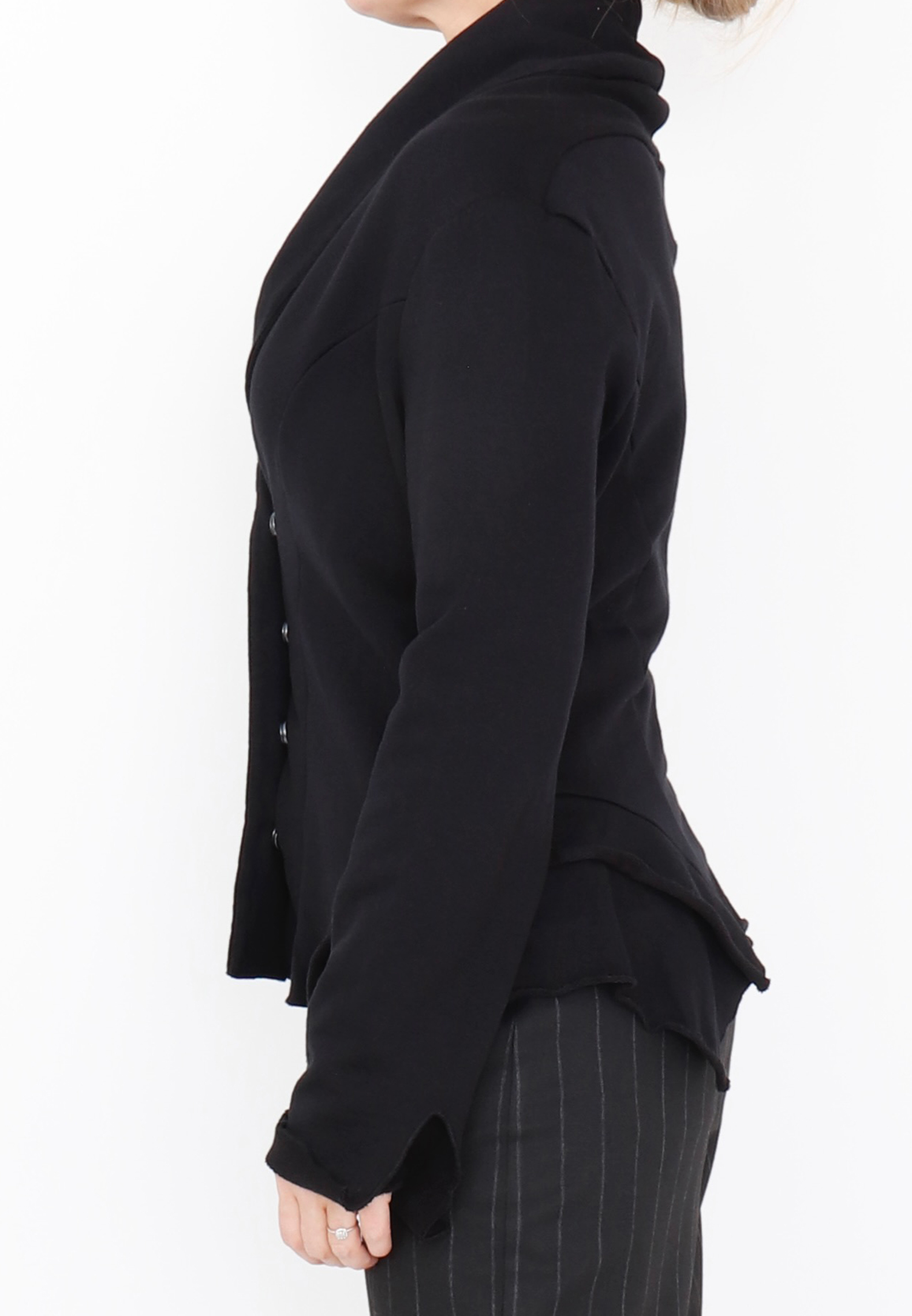 Blazer i en eksklusiv sweatkvalitet, designet med knaplukning og rå kanter. Den bløde krave og feminine snit giver et afslappet og elegant look – ideel til både hverdagsbrug og mere sofistikerede anledninger. Alt Sort Aarhus tøj er produceret i Portugal af nøje udvalgte lokale materialer og kvaliteter med fokus på design og pasform.