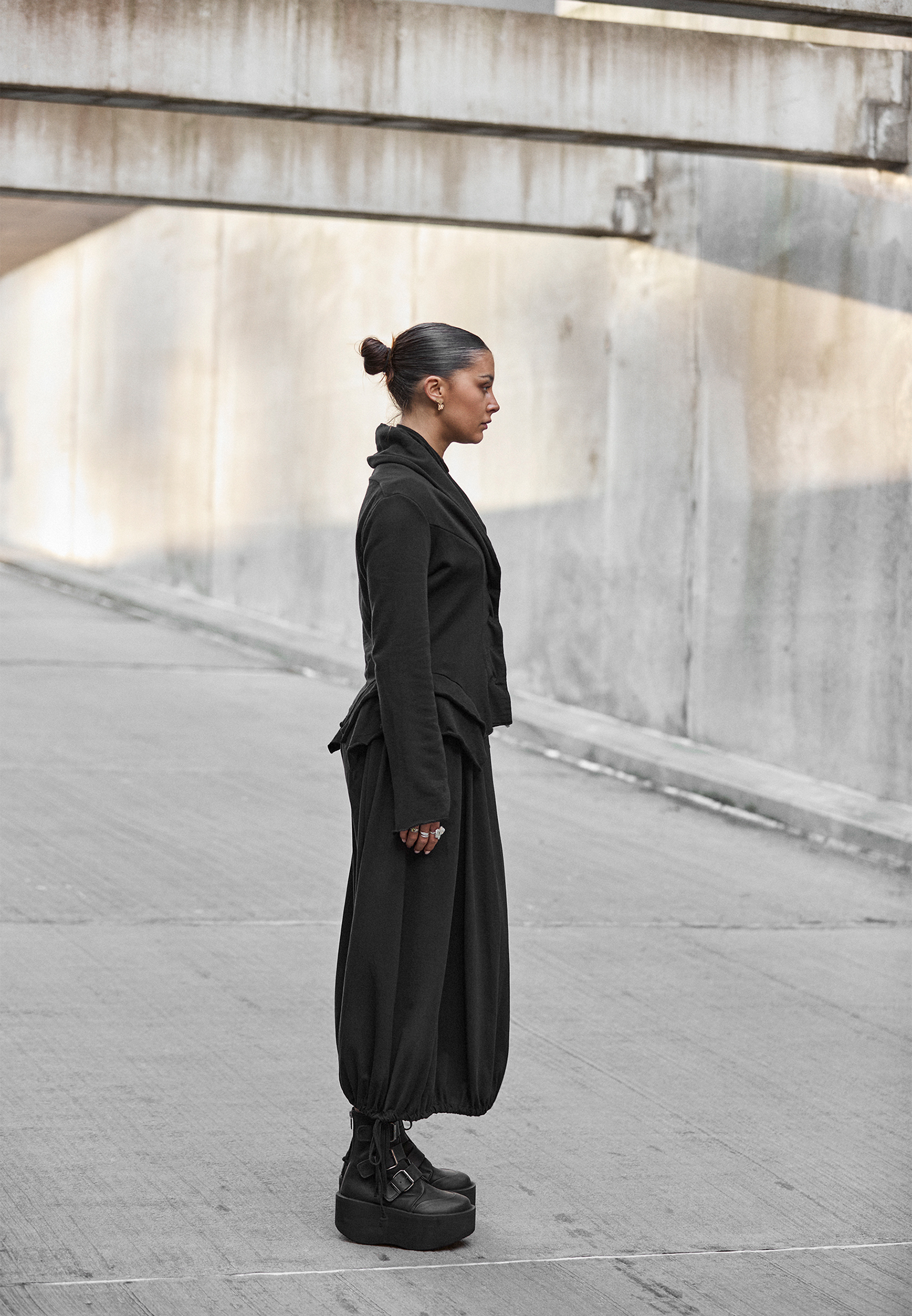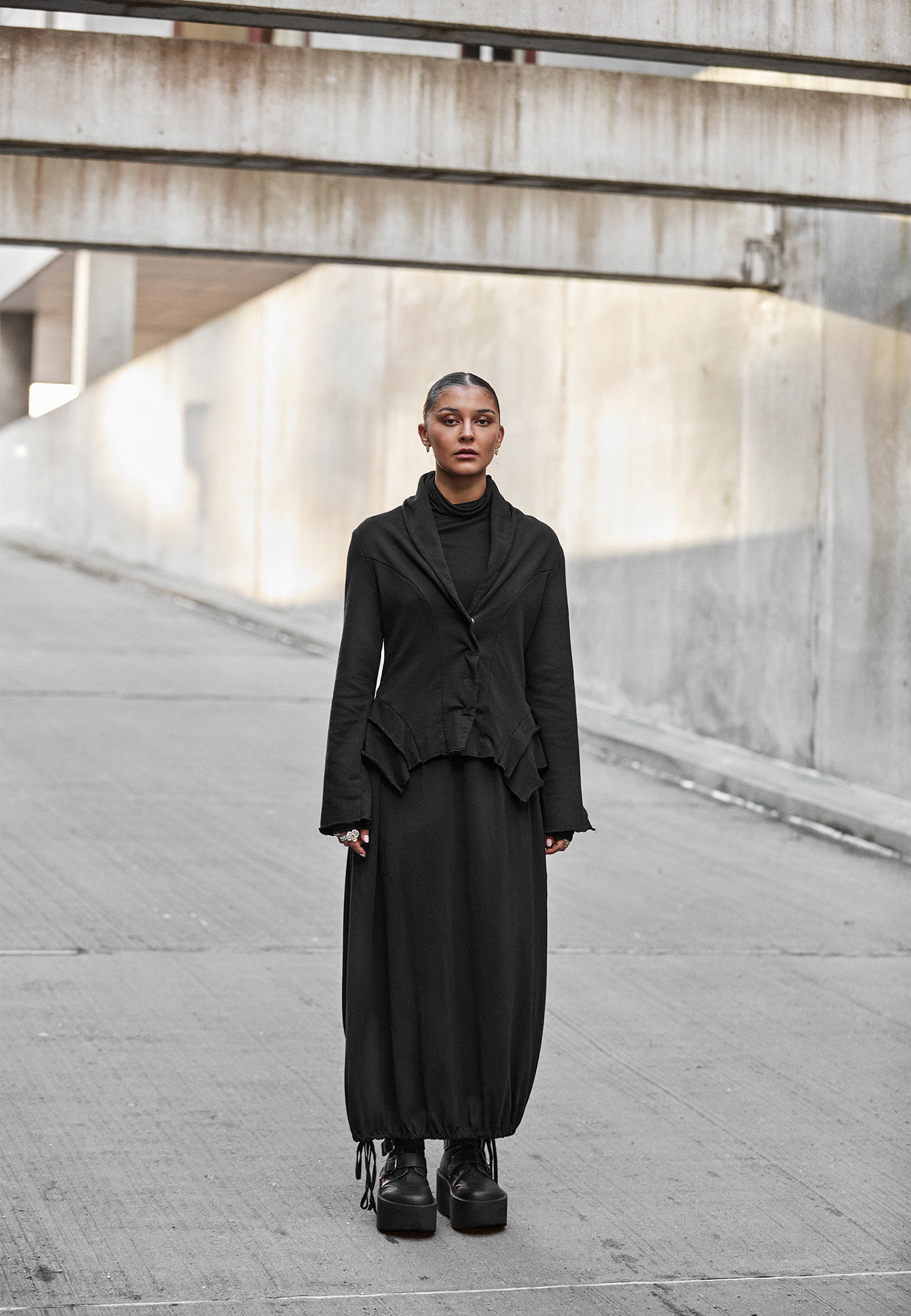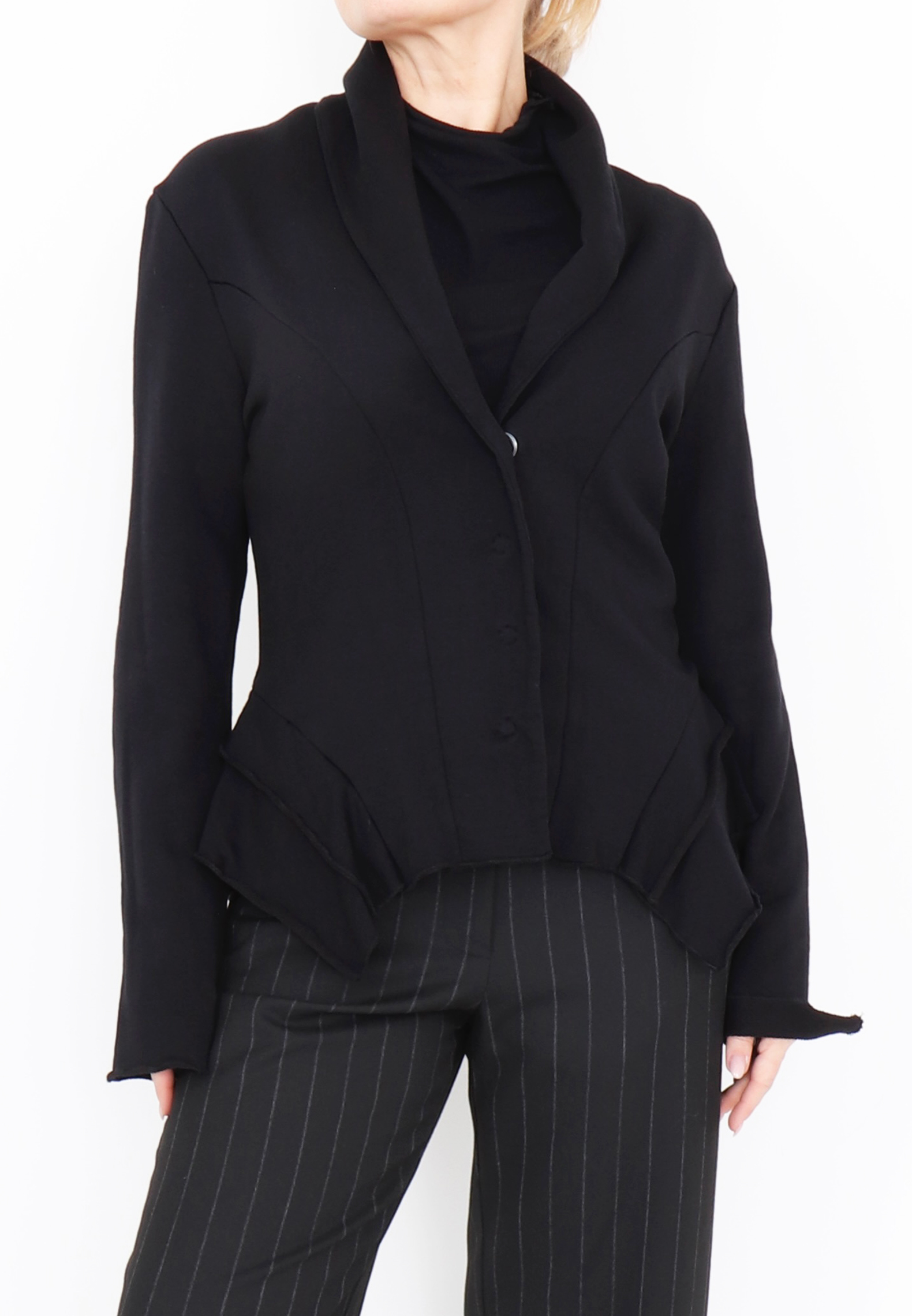 Blazer i en eksklusiv sweatkvalitet, designet med knaplukning og rå kanter. Den bløde krave og feminine snit giver et afslappet og elegant look – ideel til både hverdagsbrug og mere sofistikerede anledninger. Alt Sort Aarhus tøj er produceret i Portugal af nøje udvalgte lokale materialer og kvaliteter med fokus på design og pasform.