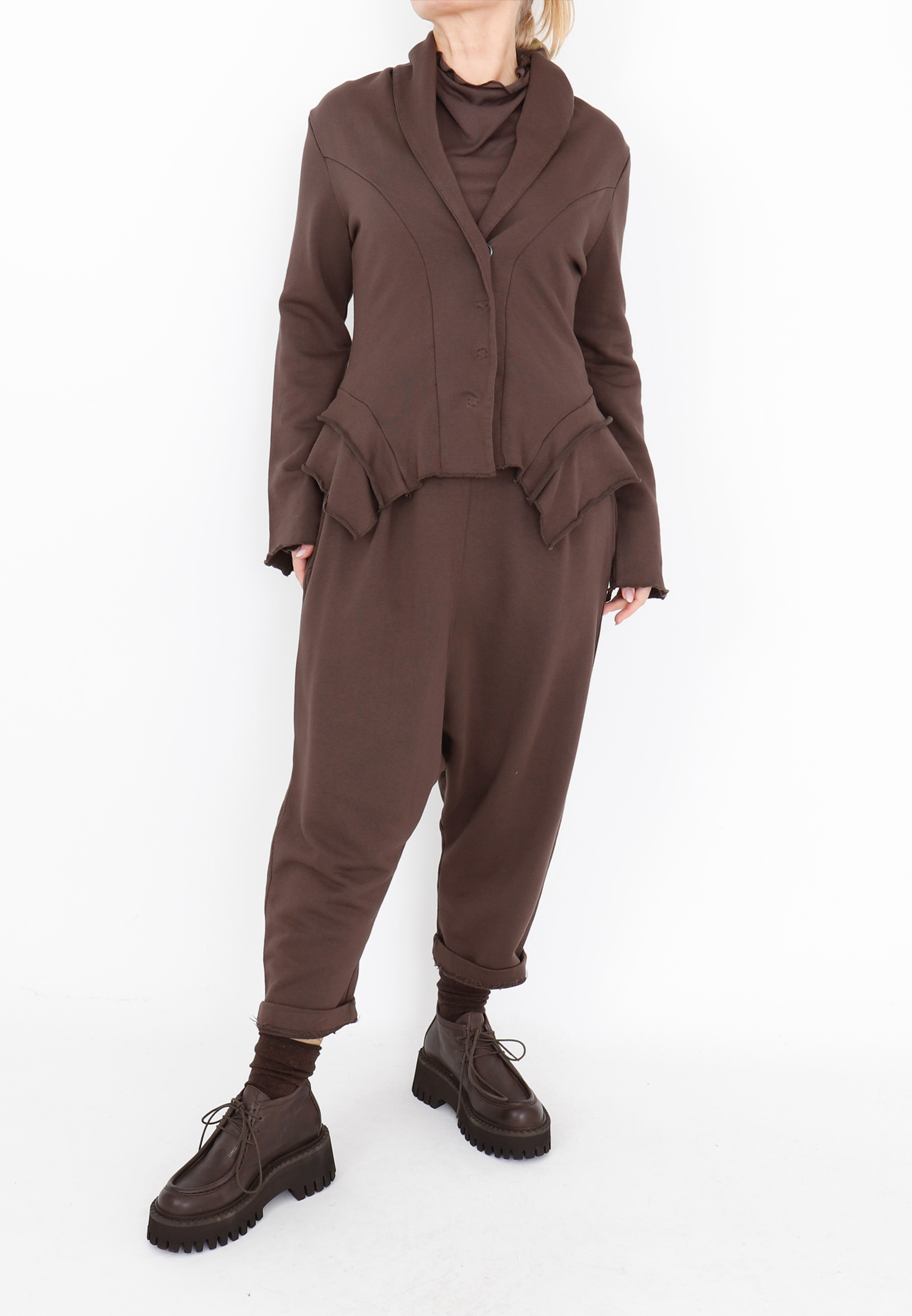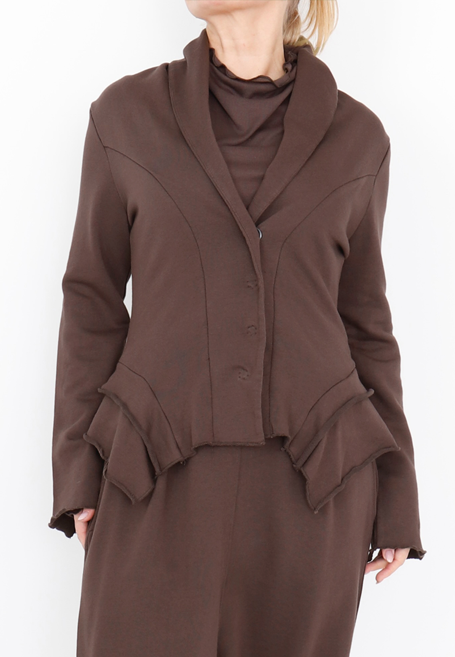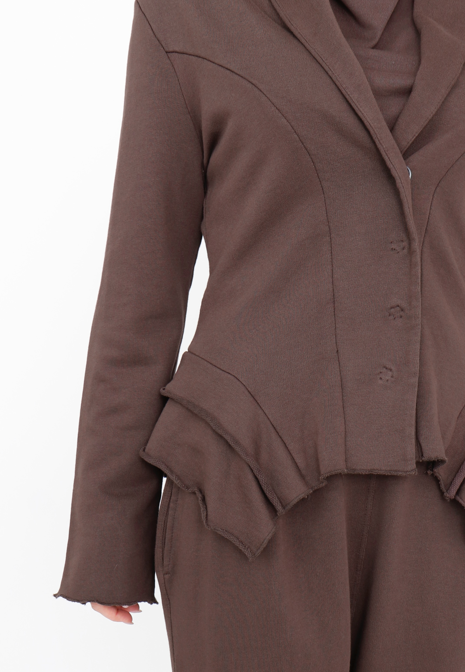 Blazer in an exclusive sweat fabric, designed with button closure and raw edges. The soft collar and feminine cut create a relaxed yet elegant look – ideal for both everyday wear and more sophisticated occasions. All Sort Aarhus clothing is produced in Portugal using carefully selected local materials and qualities, with a strong focus on design and fit.