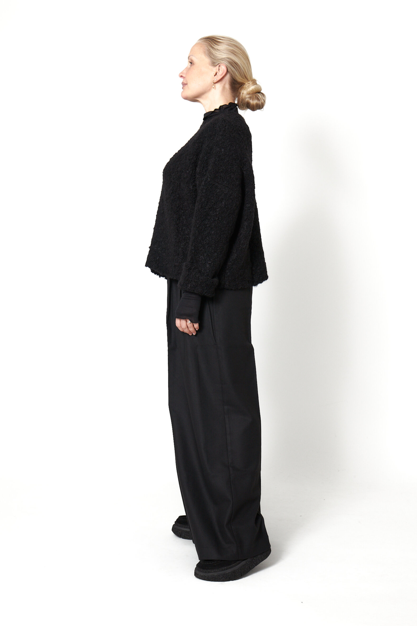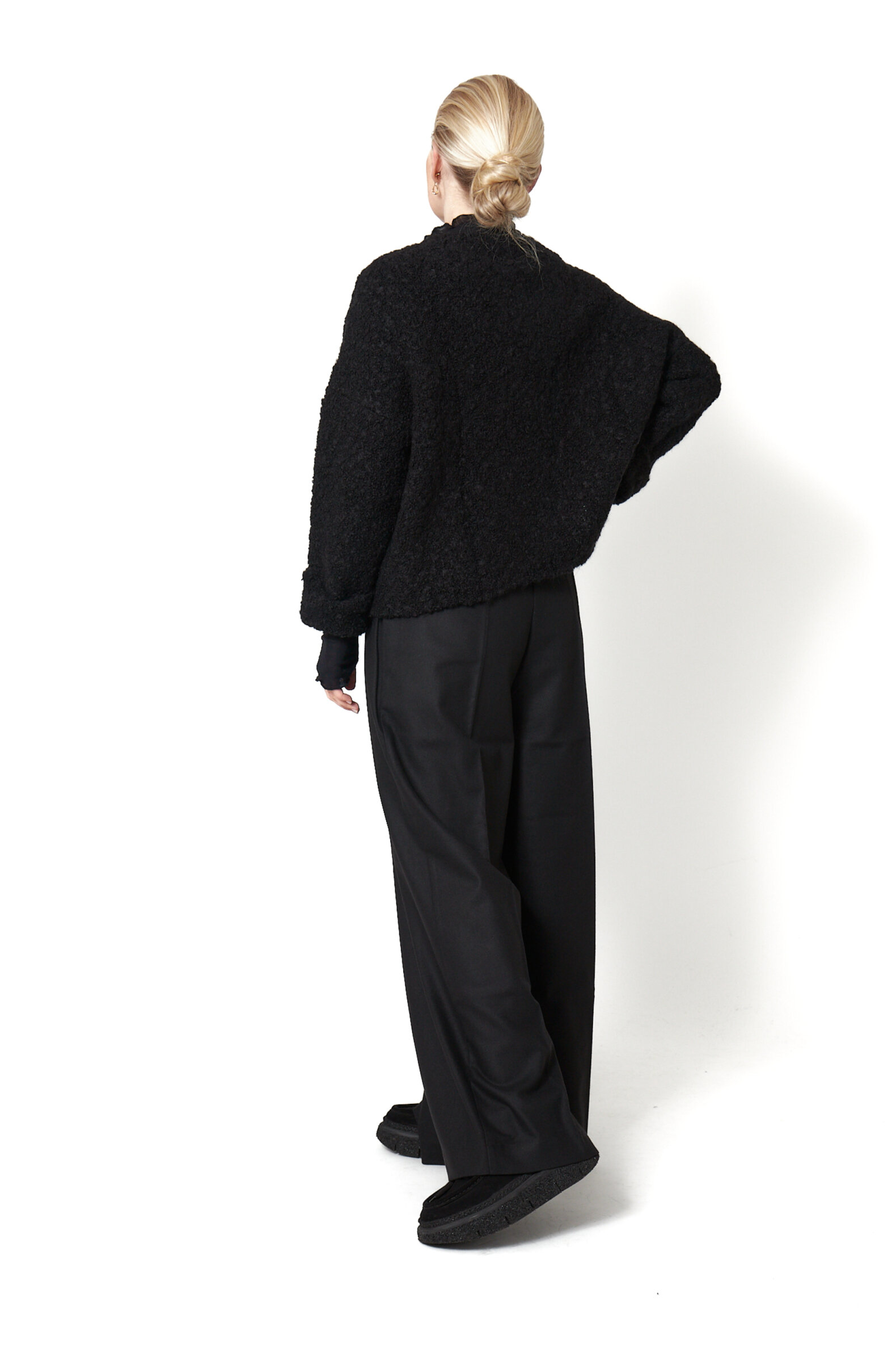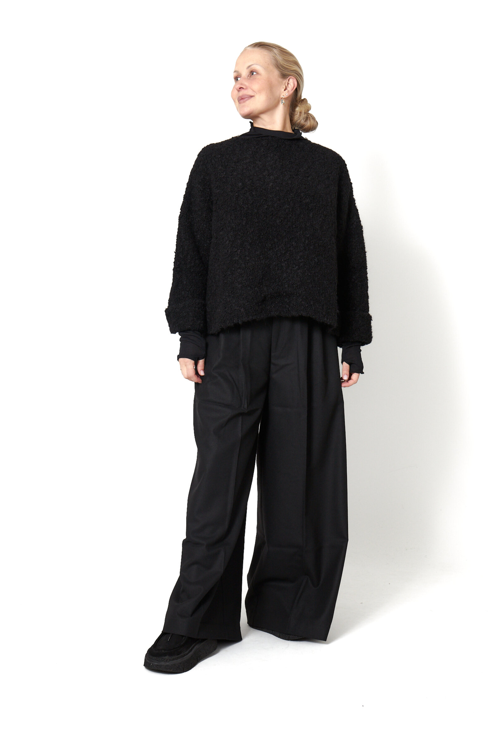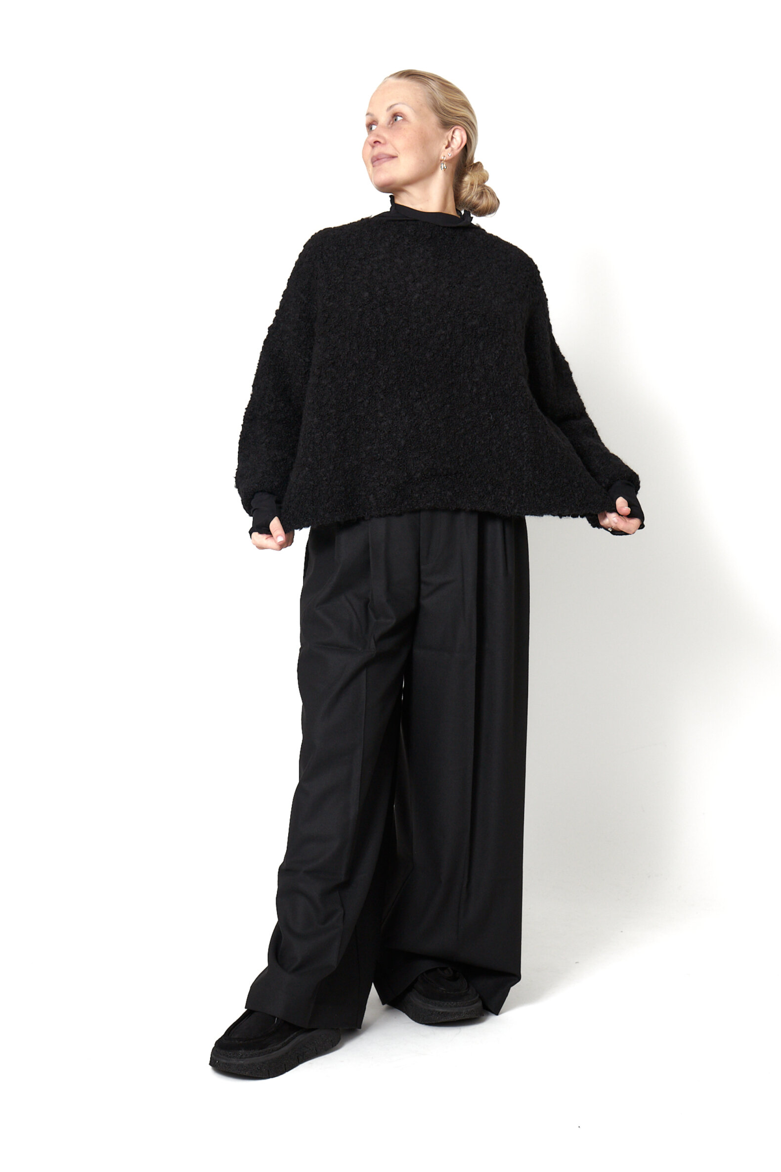 Løstsiddende strikbluse i bouclé som giver en ekstra lækker struktur. Blusen er med lange ærmer, og lavet i en blød og lækker Alpaca-uldblanding. Alpacauld er holdbart og varmere end almindeligt uld fra får, og finere i kvaliteten.