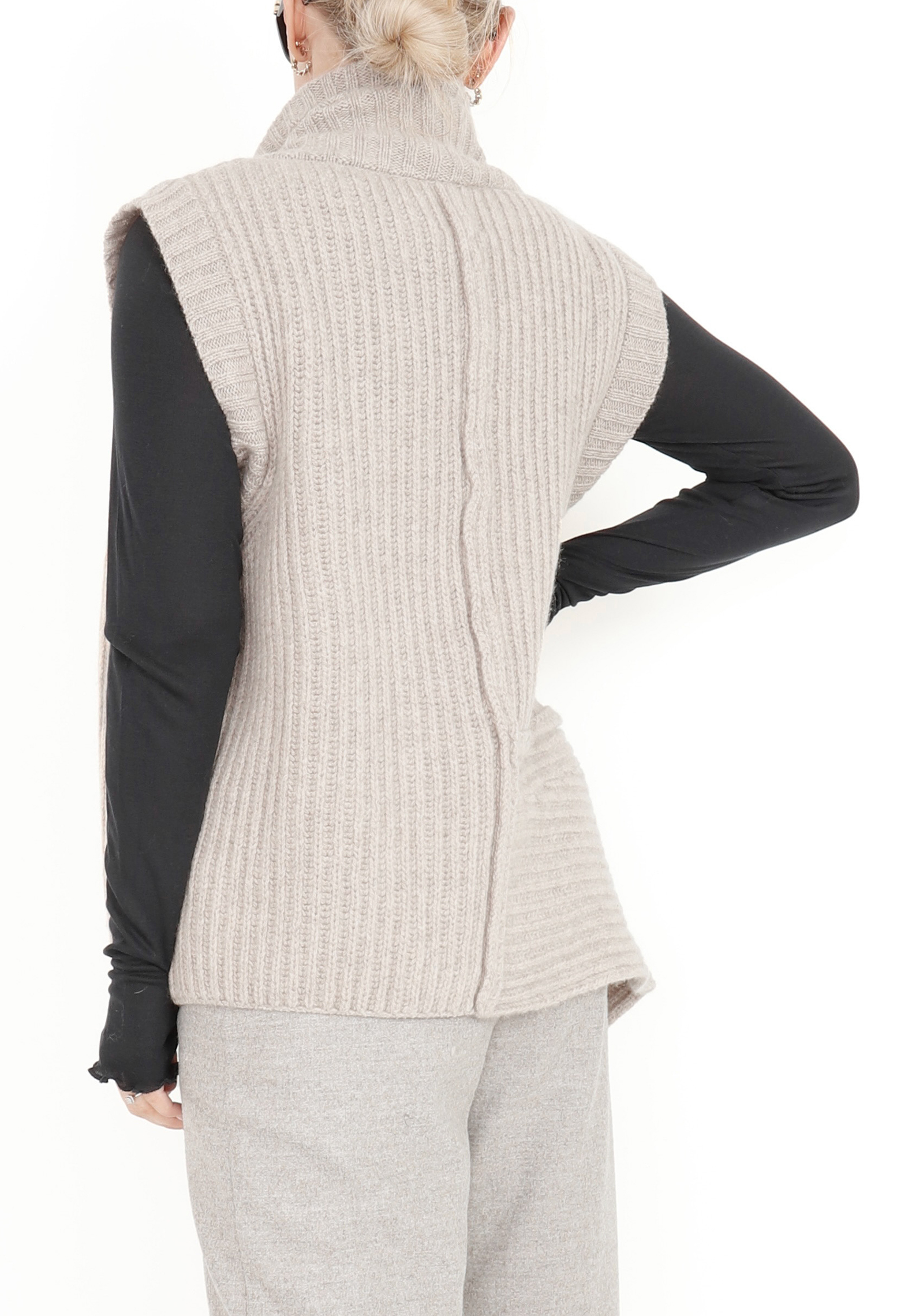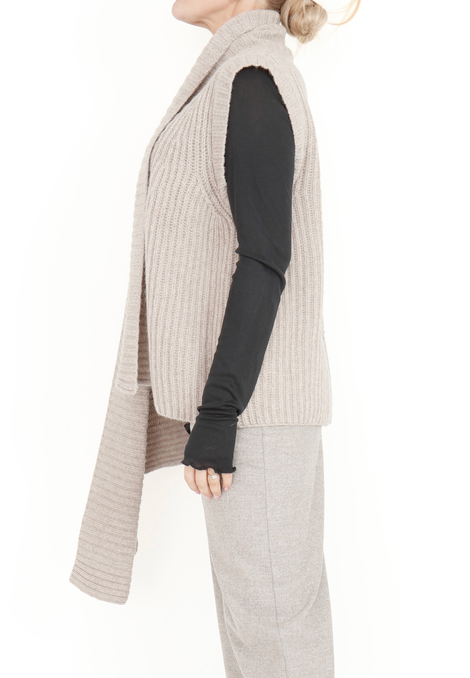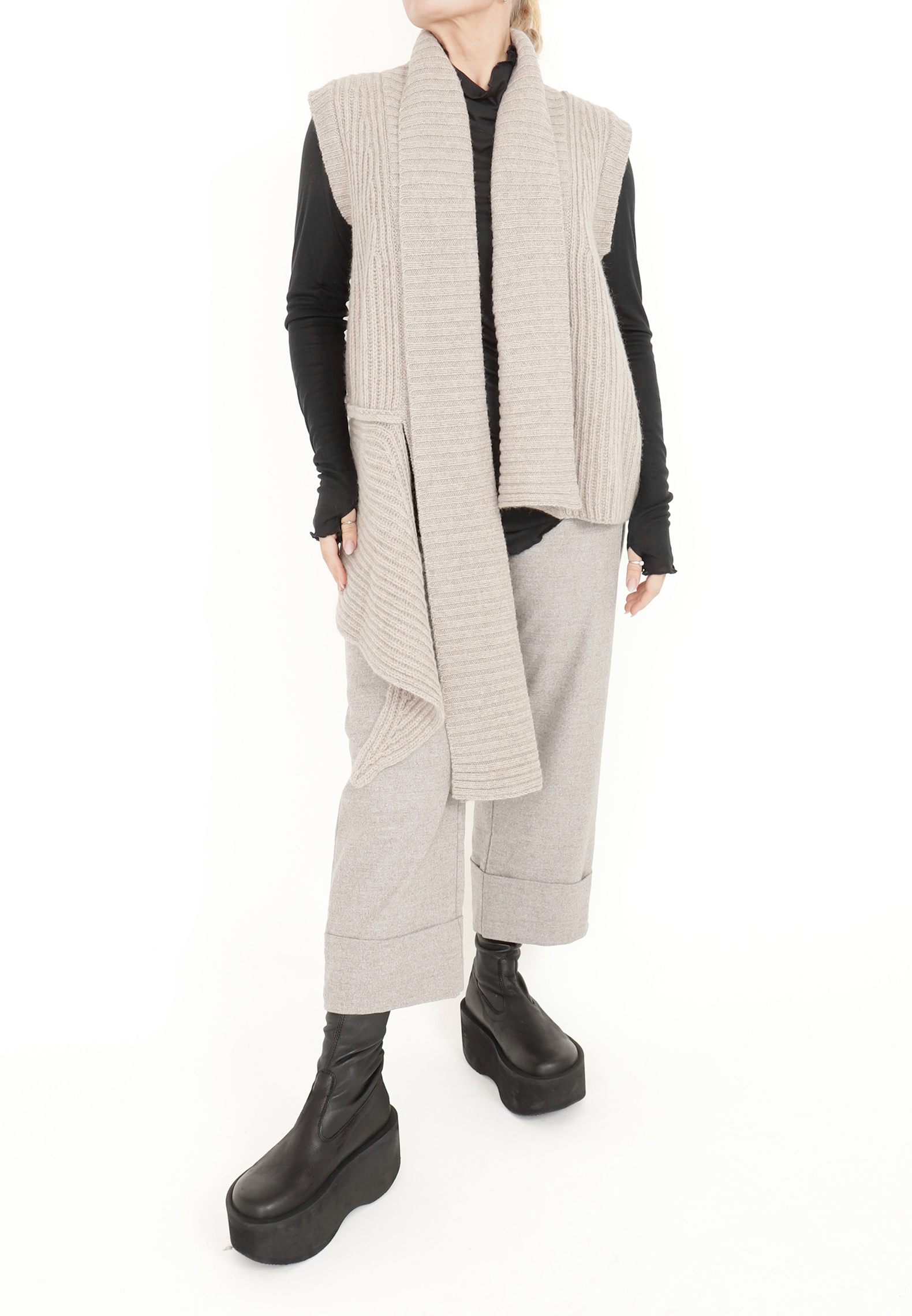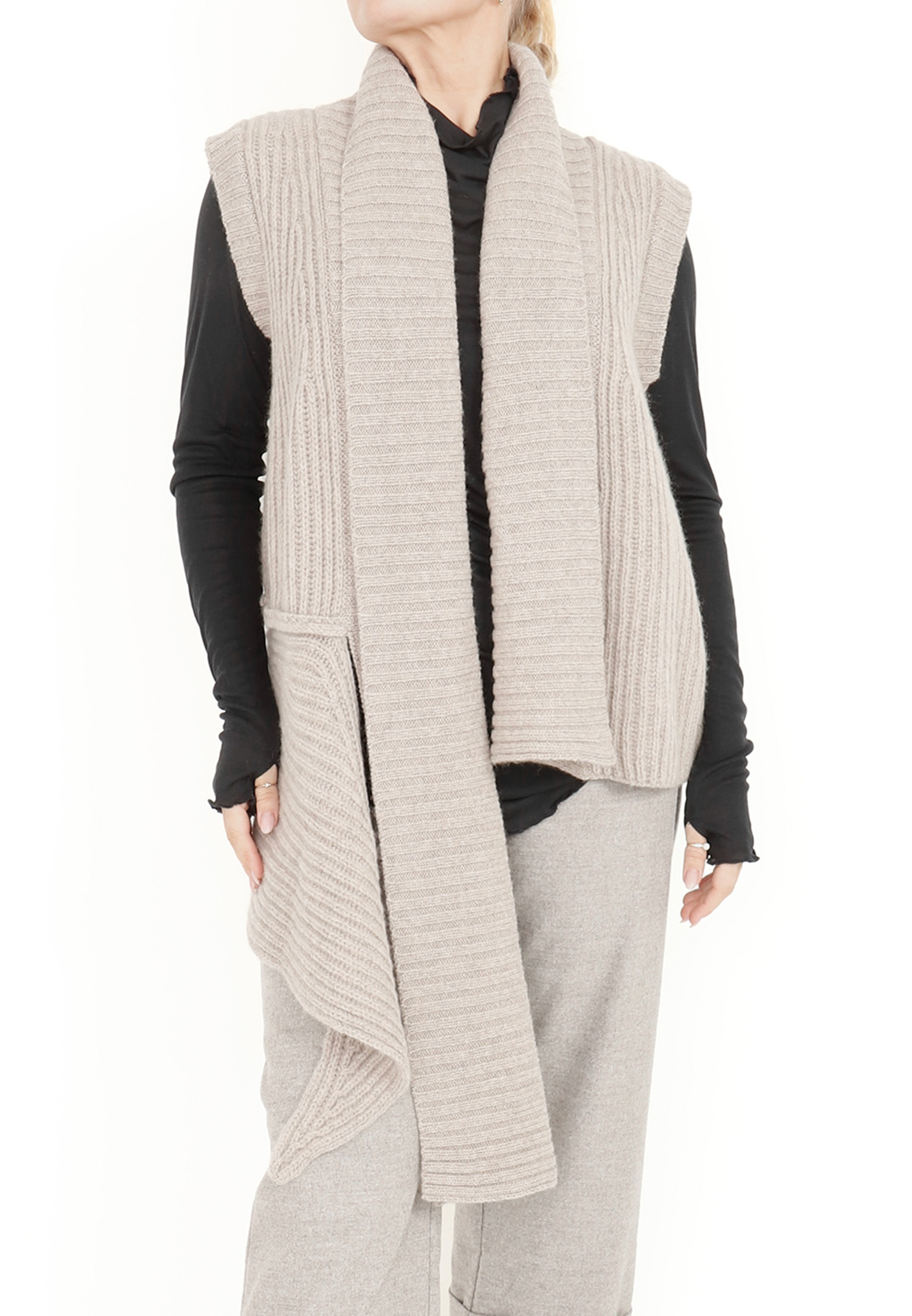 A luxurious and timeless knitted vest, crafted from 100% soft merino wool. The vest features a beautiful ribbed structure that adds a refined touch, while the asymmetrical cut gives it an edgy character. Perfect for layering and ideal for elevating any outfit to an exclusive level. Thanks to the natural temperature-regulating properties of merino wool, it can be worn all year round – warm in winter and light in summer.