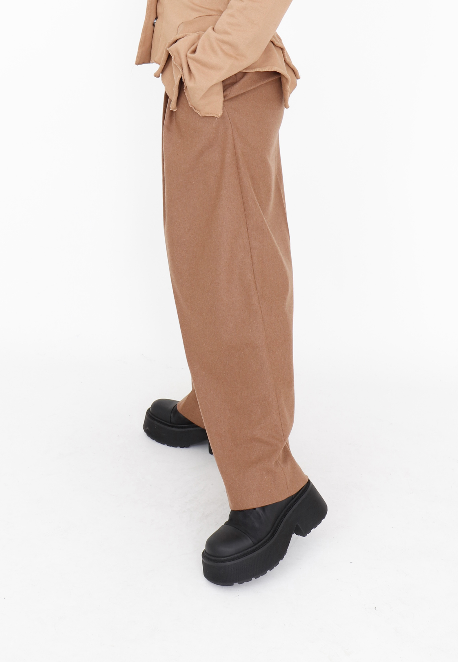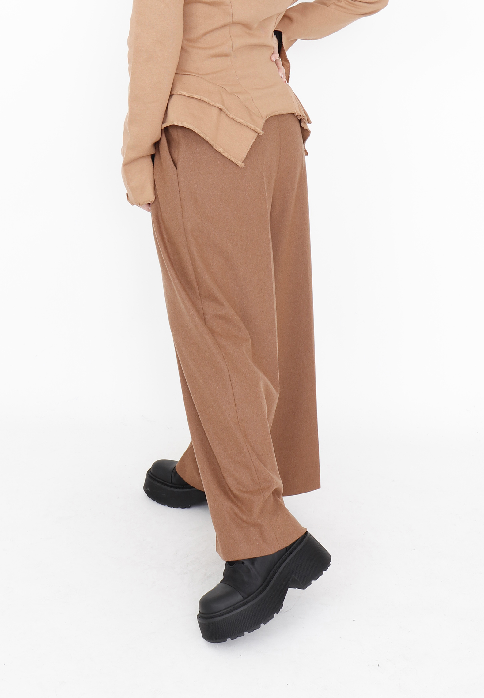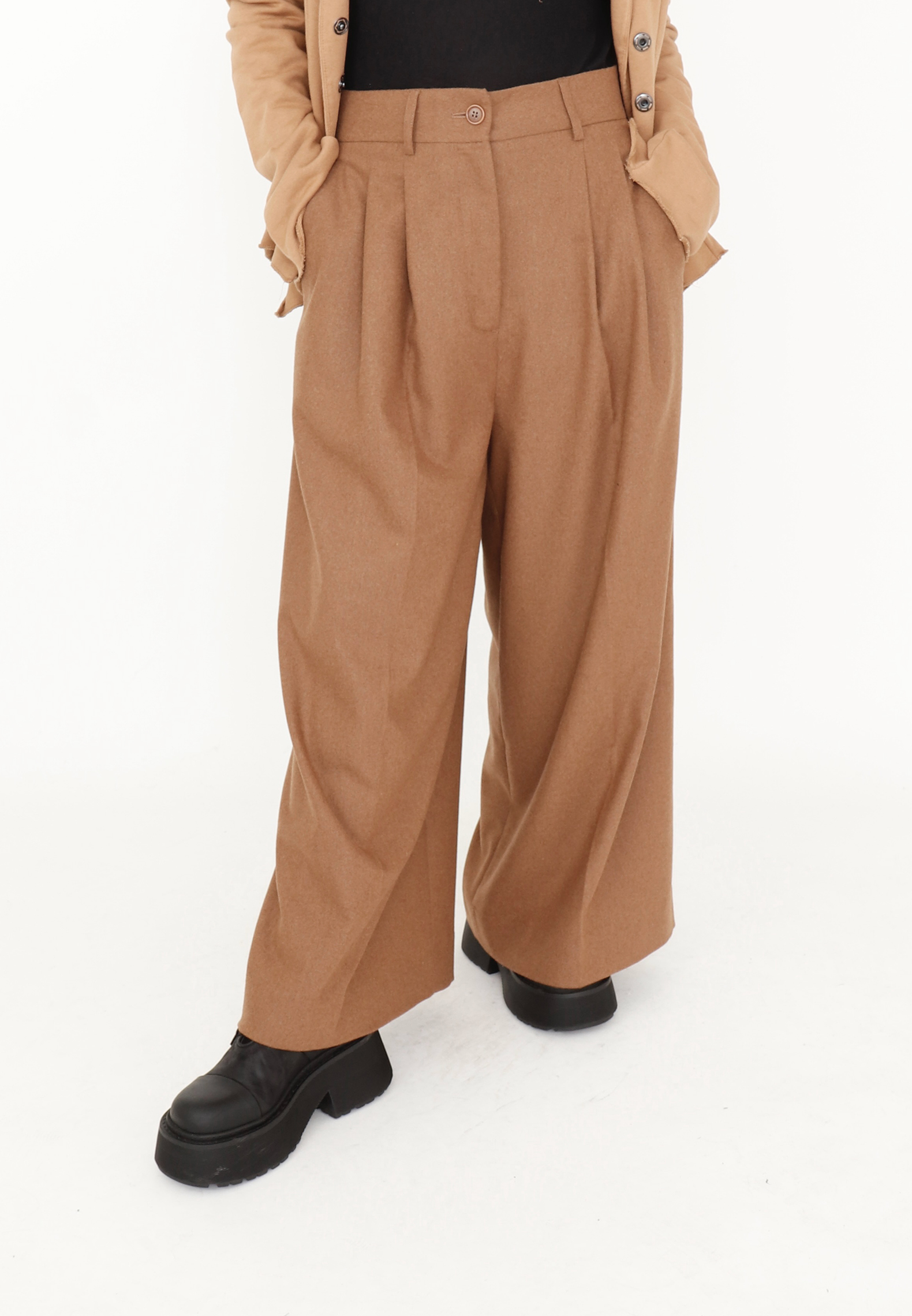 These elegant pants are crafted from a luxurious wool blend, combining warmth, softness, and breathability. With their wide, flowing fit and classic pressed pleats, they give a sophisticated and timeless look. Discreet side pockets enhance the functional design without compromising the clean, minimalist aesthetic. Perfect for the office, everyday wear, or more formal occasions where comfort and style go hand in hand.