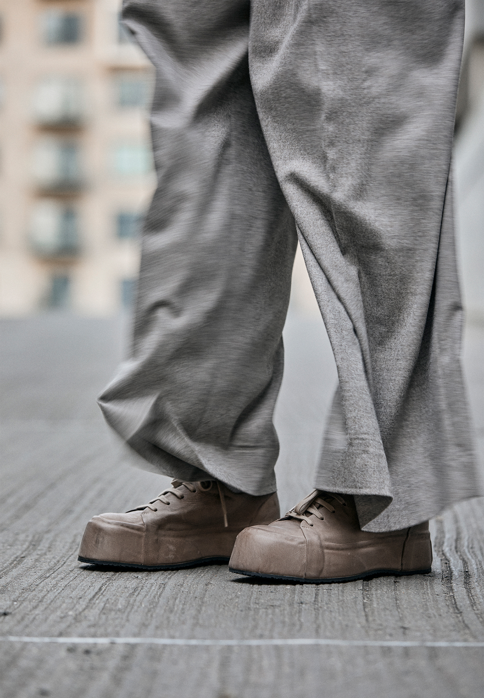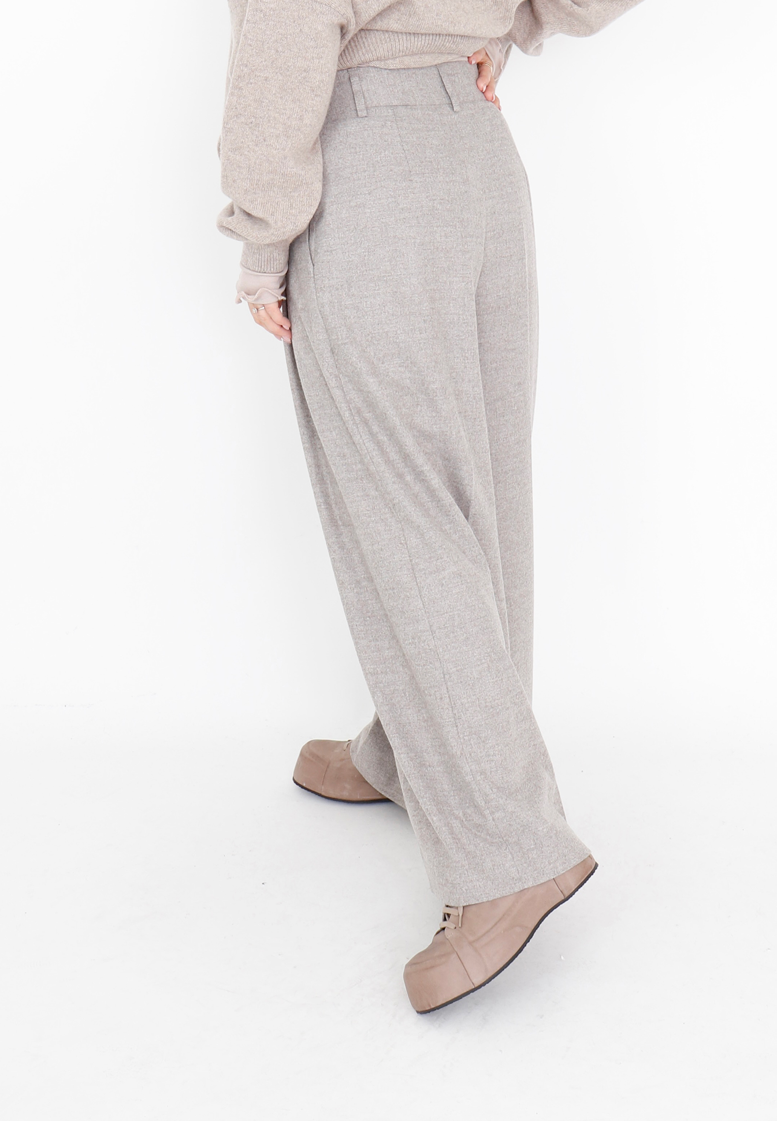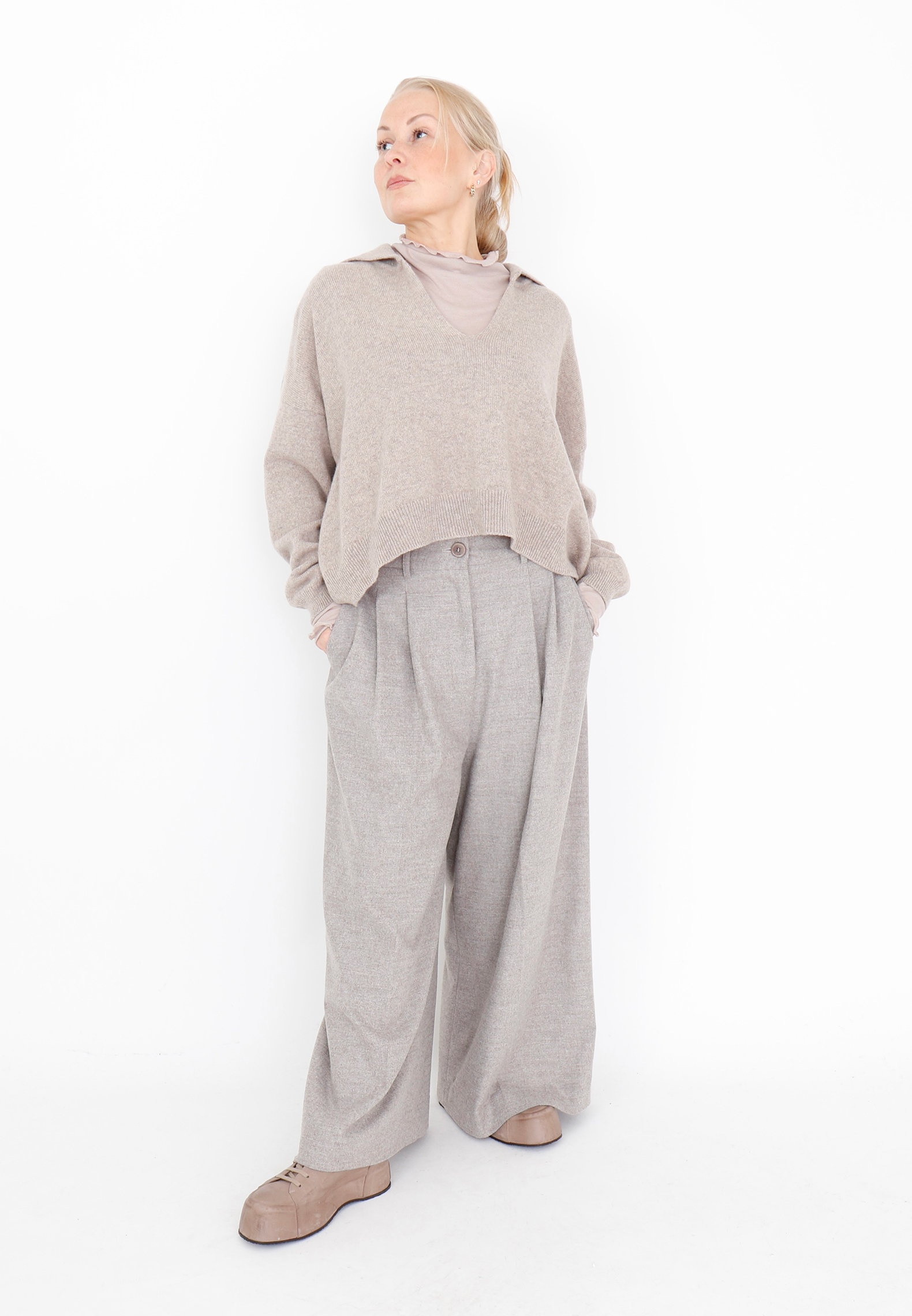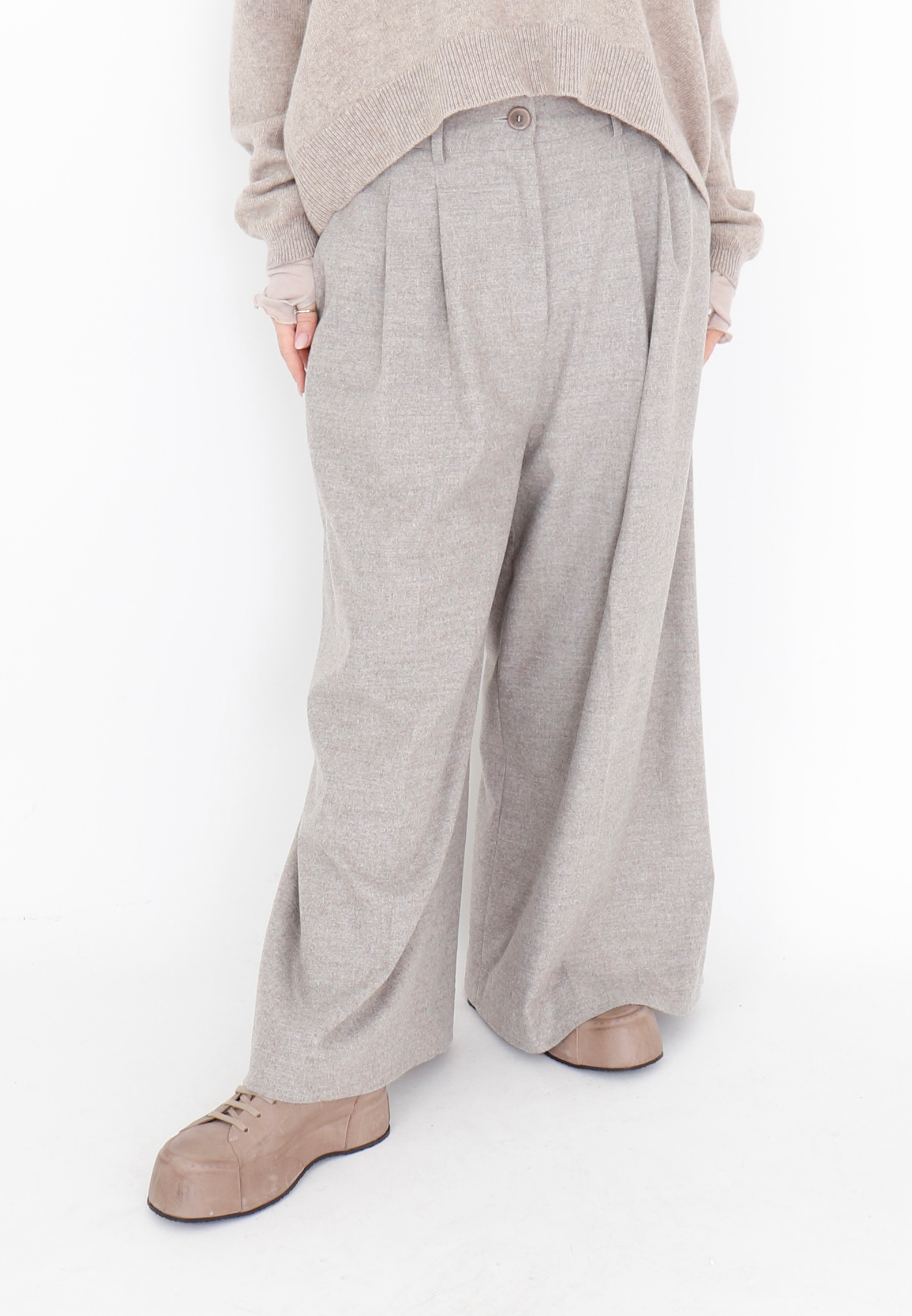 These elegant pants are crafted from a luxurious wool blend, combining warmth, softness, and breathability. With their wide, flowing fit and classic pressed pleats, they give a sophisticated and timeless look. Discreet side pockets enhance the functional design without compromising the clean, minimalist aesthetic. Perfect for the office, everyday wear, or more formal occasions where comfort and style go hand in hand.