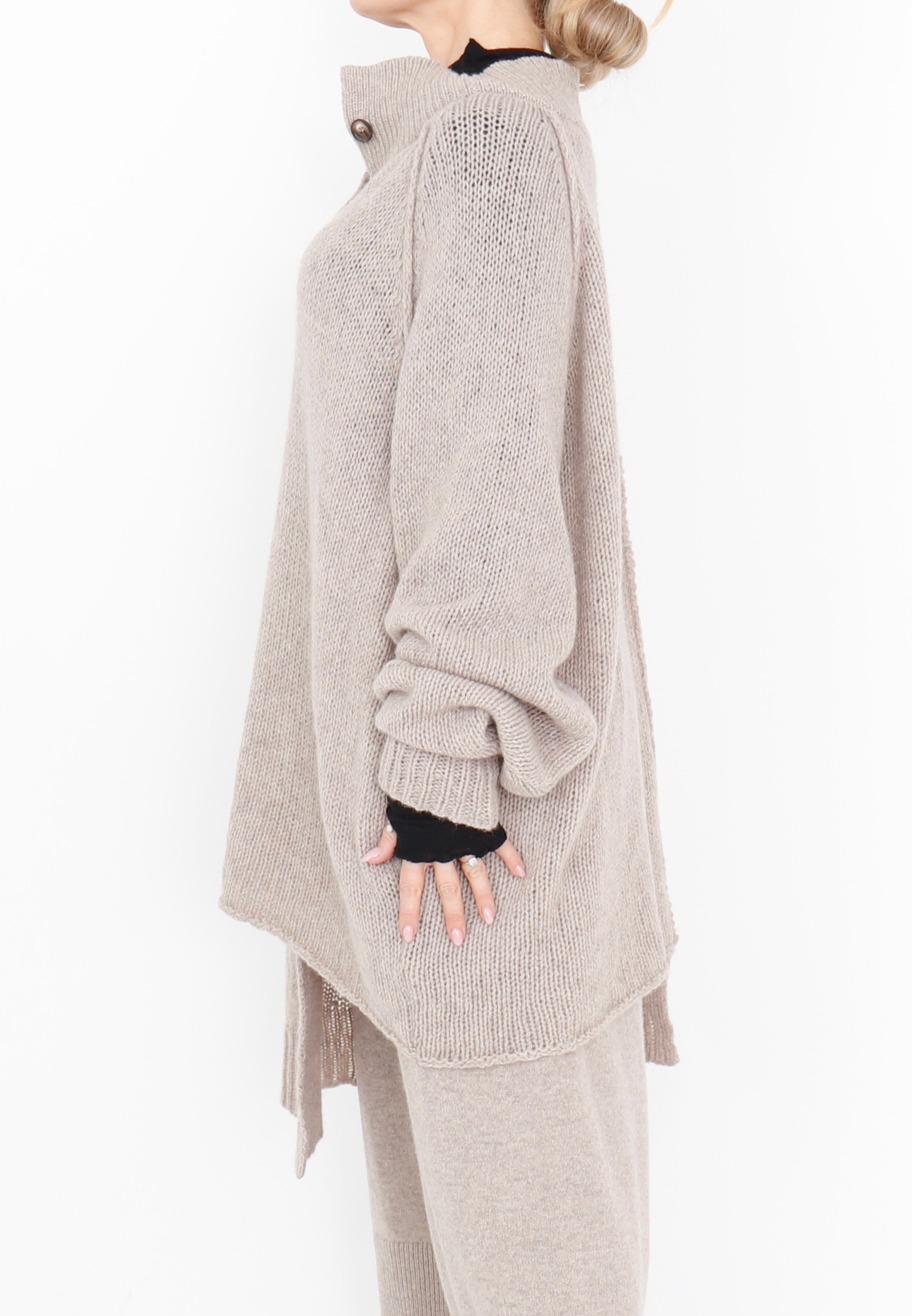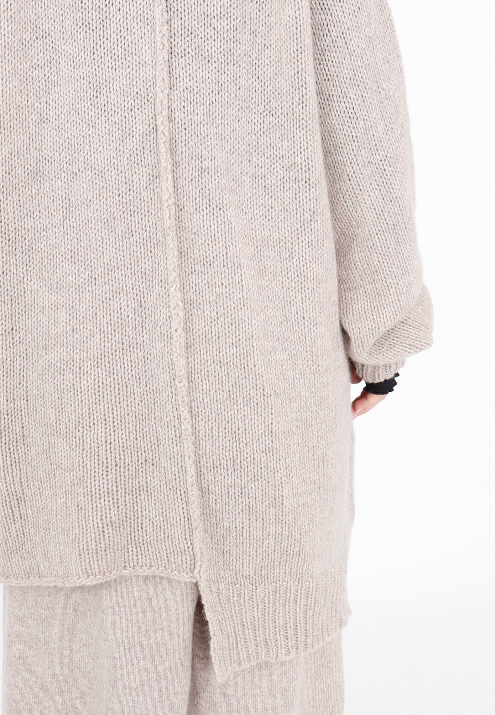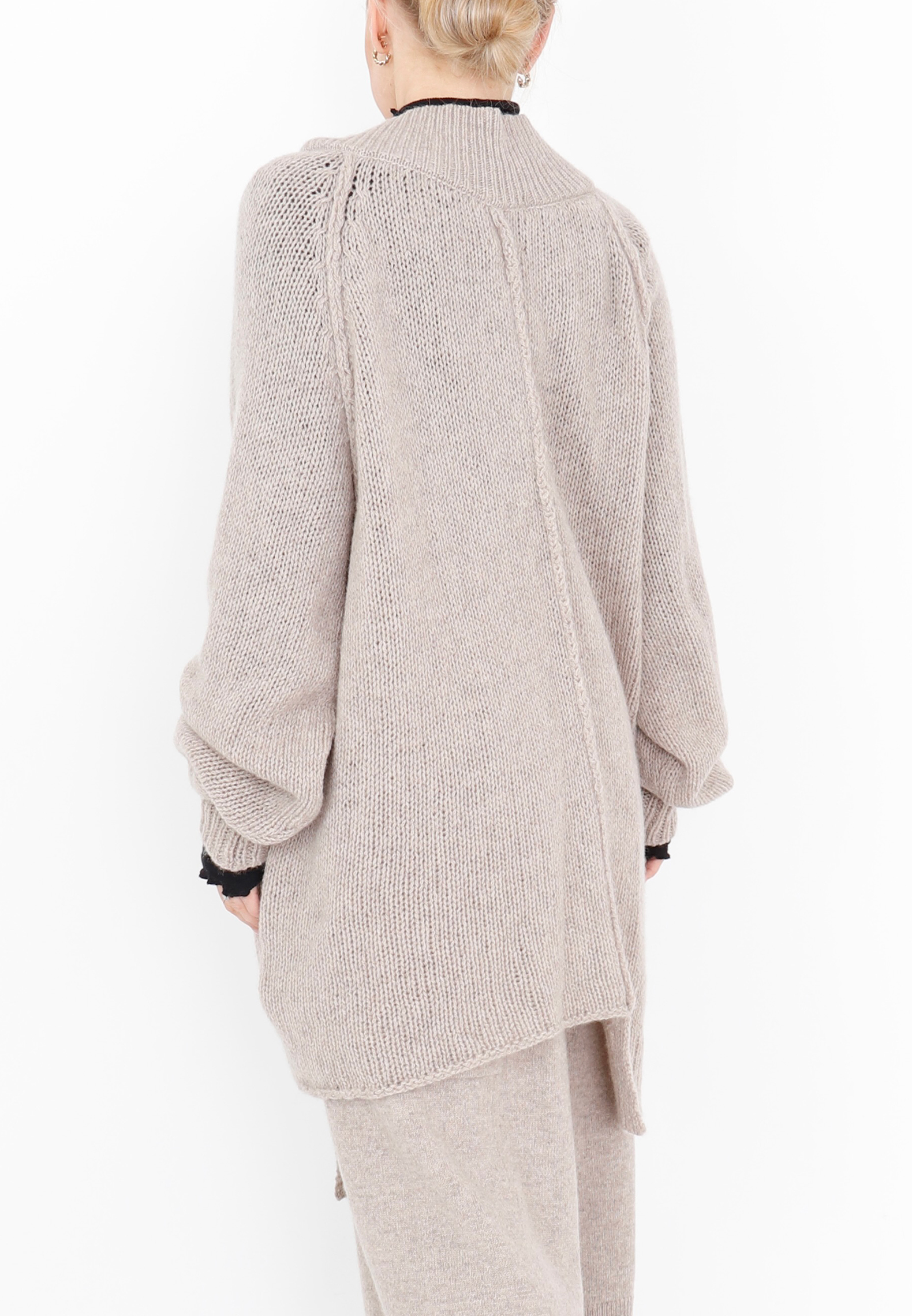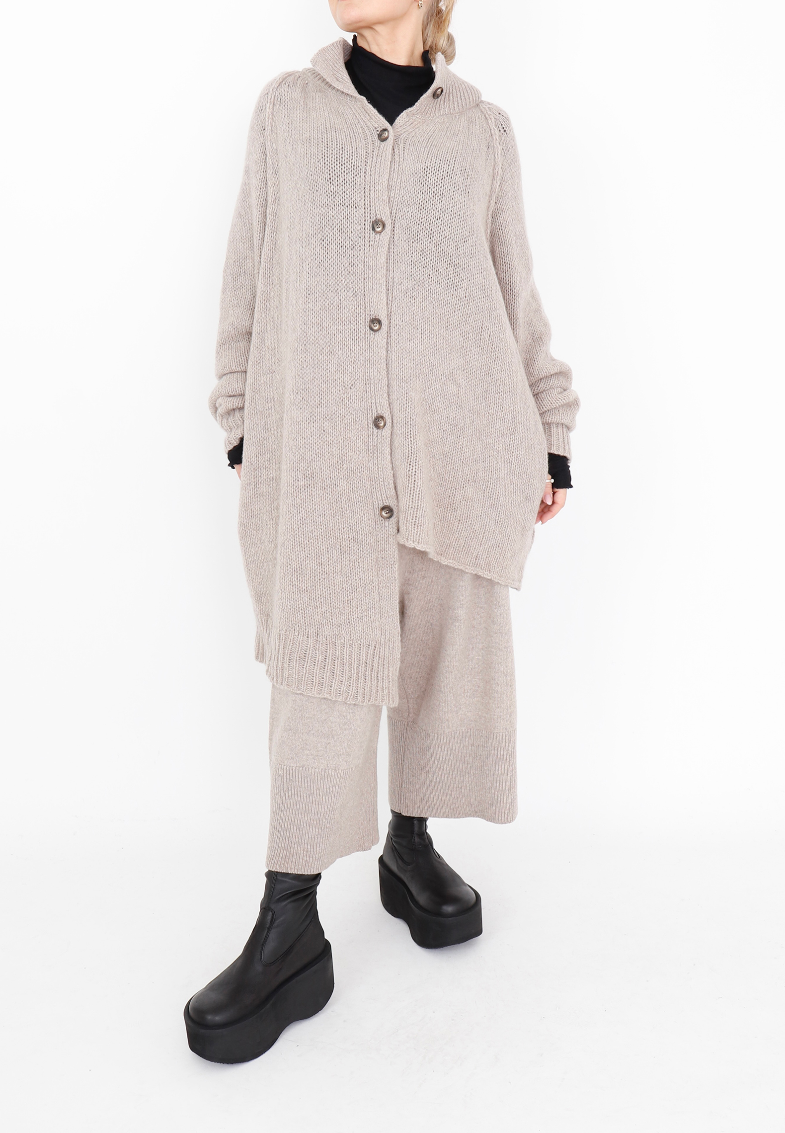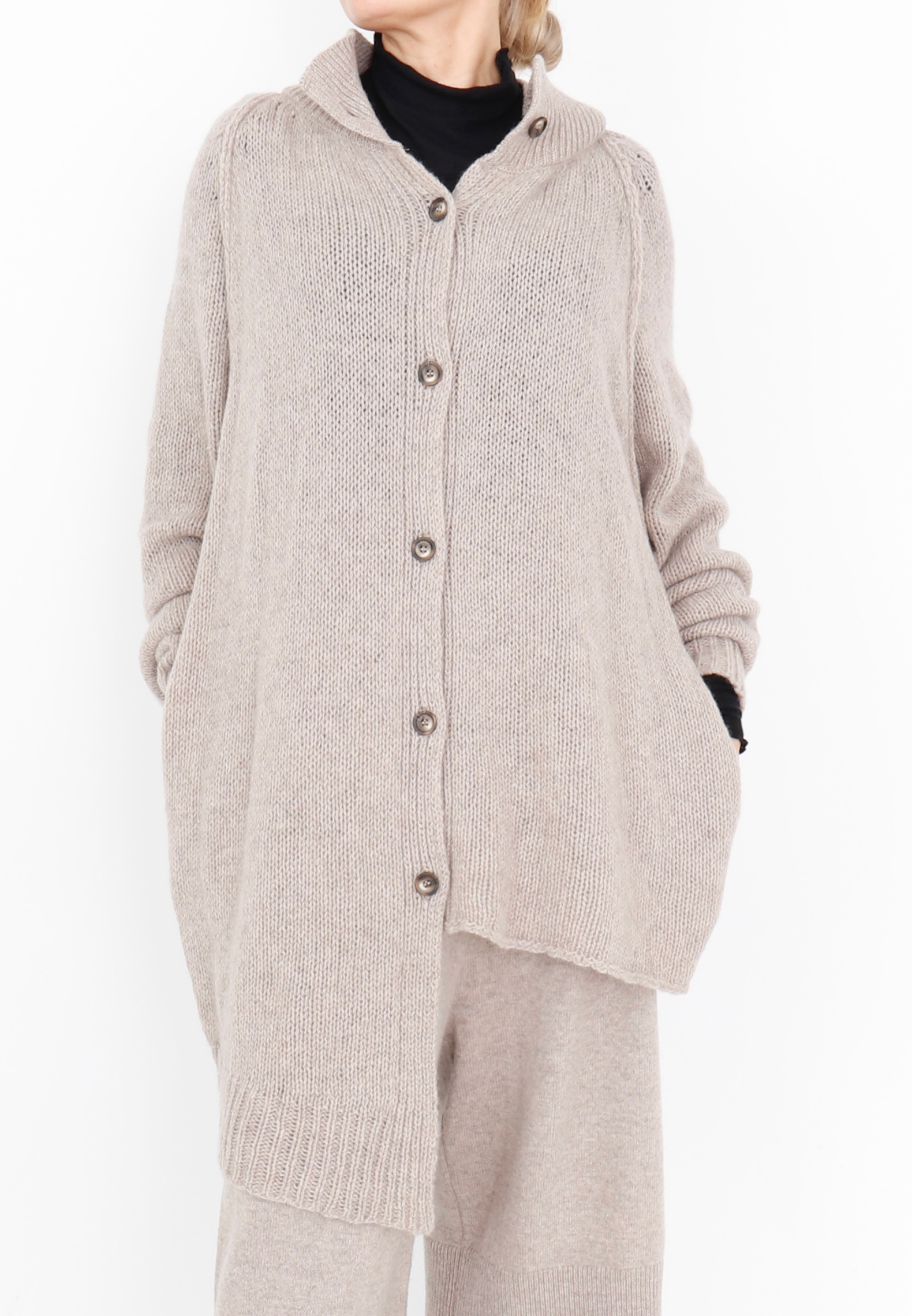 Knitted cardigan/blouse in premium merino wool, here in an elegant beige color. The blouse fastens with buttons and features an asymmetric front cut along with long sleeves.