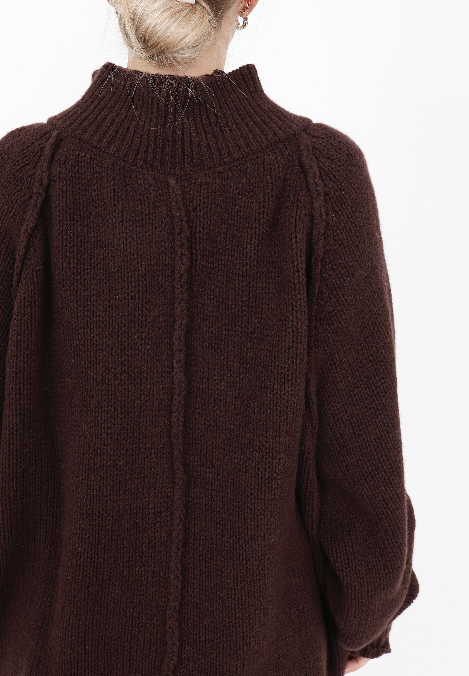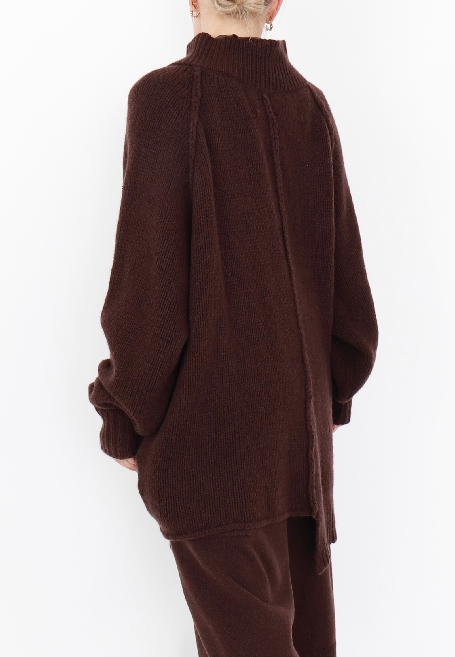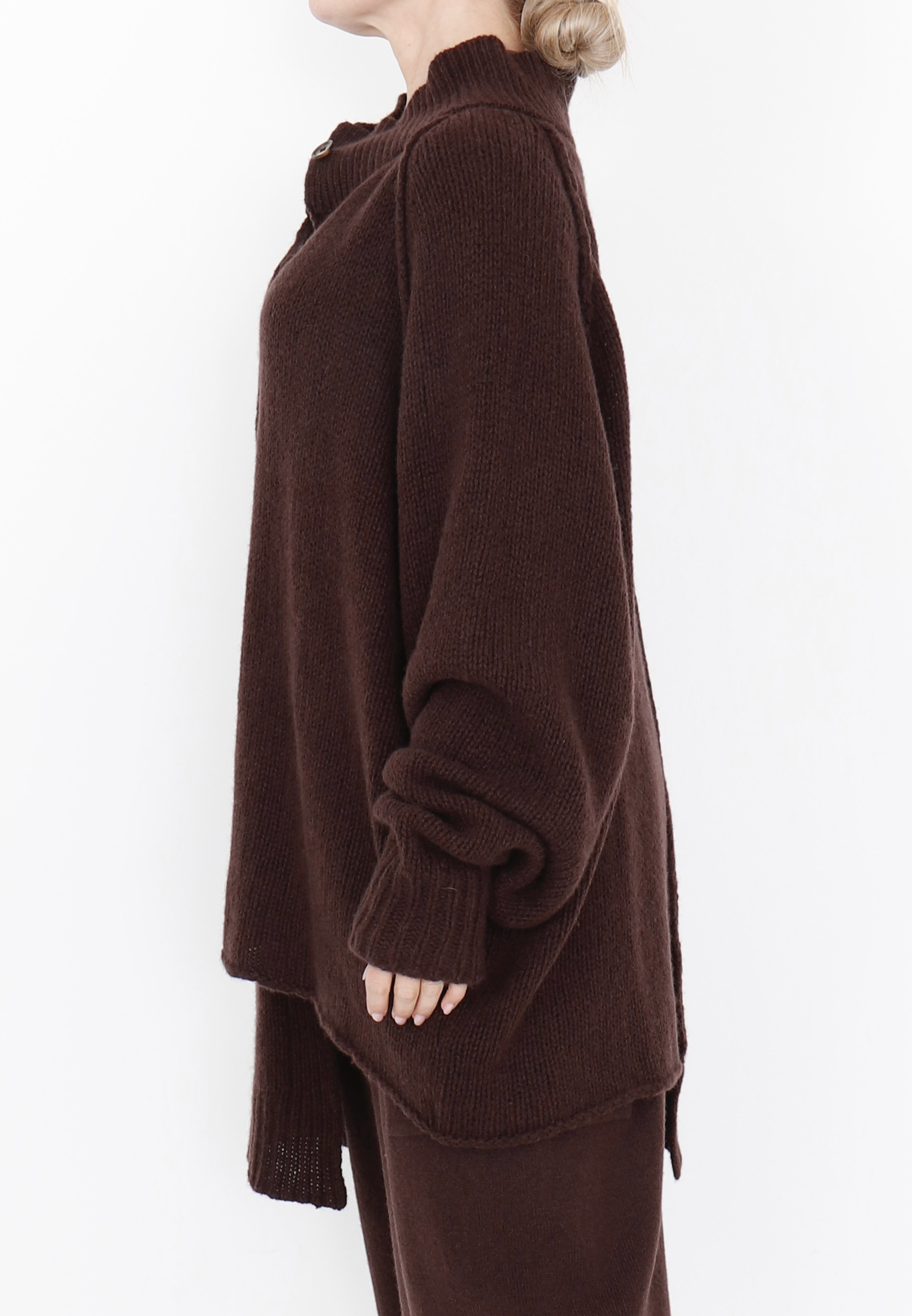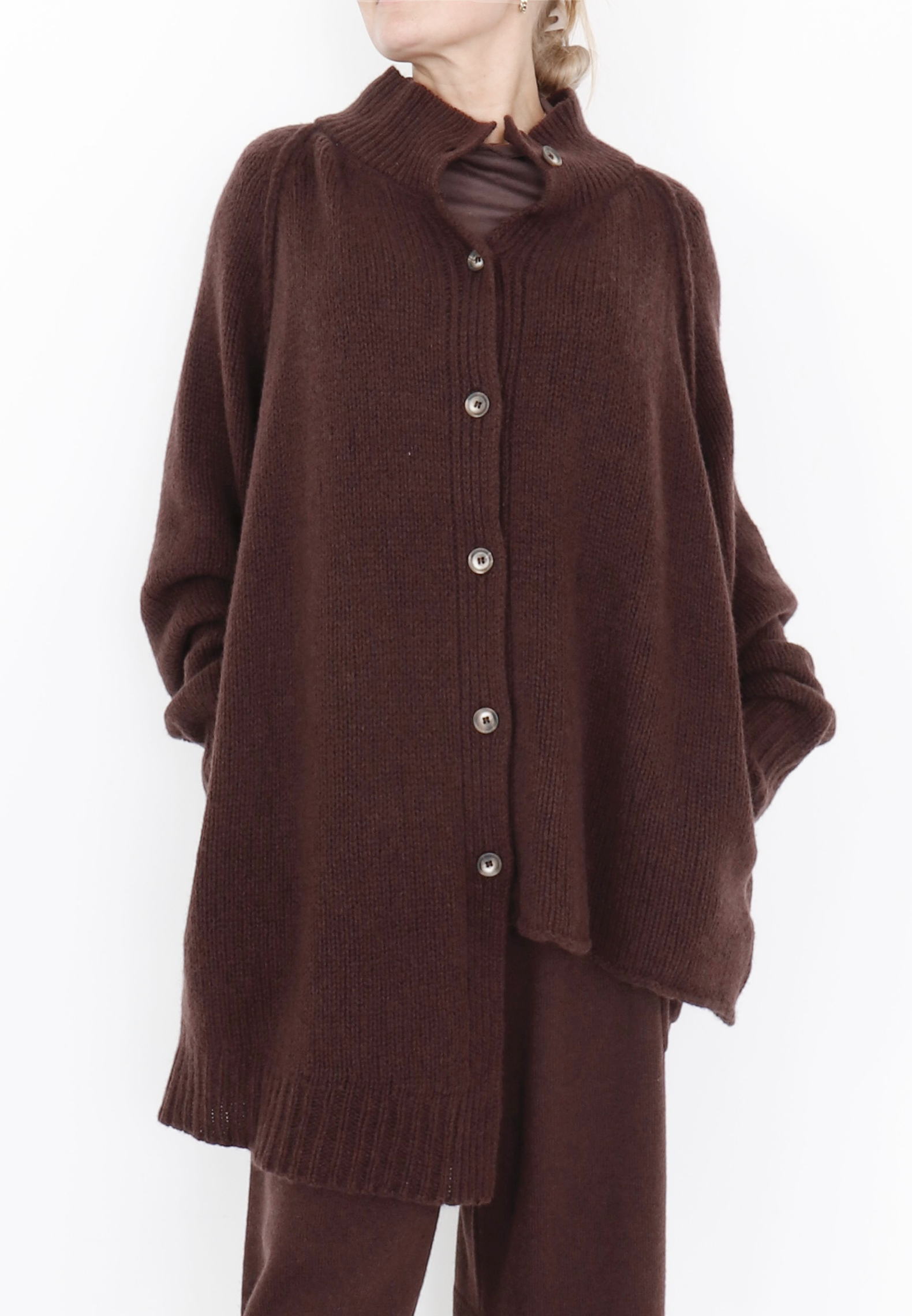 Knitted cardigan/blouse in premium merino wool, here in an elegant brown color. The blouse fastens with buttons and features an asymmetric front cut along with long sleeves.