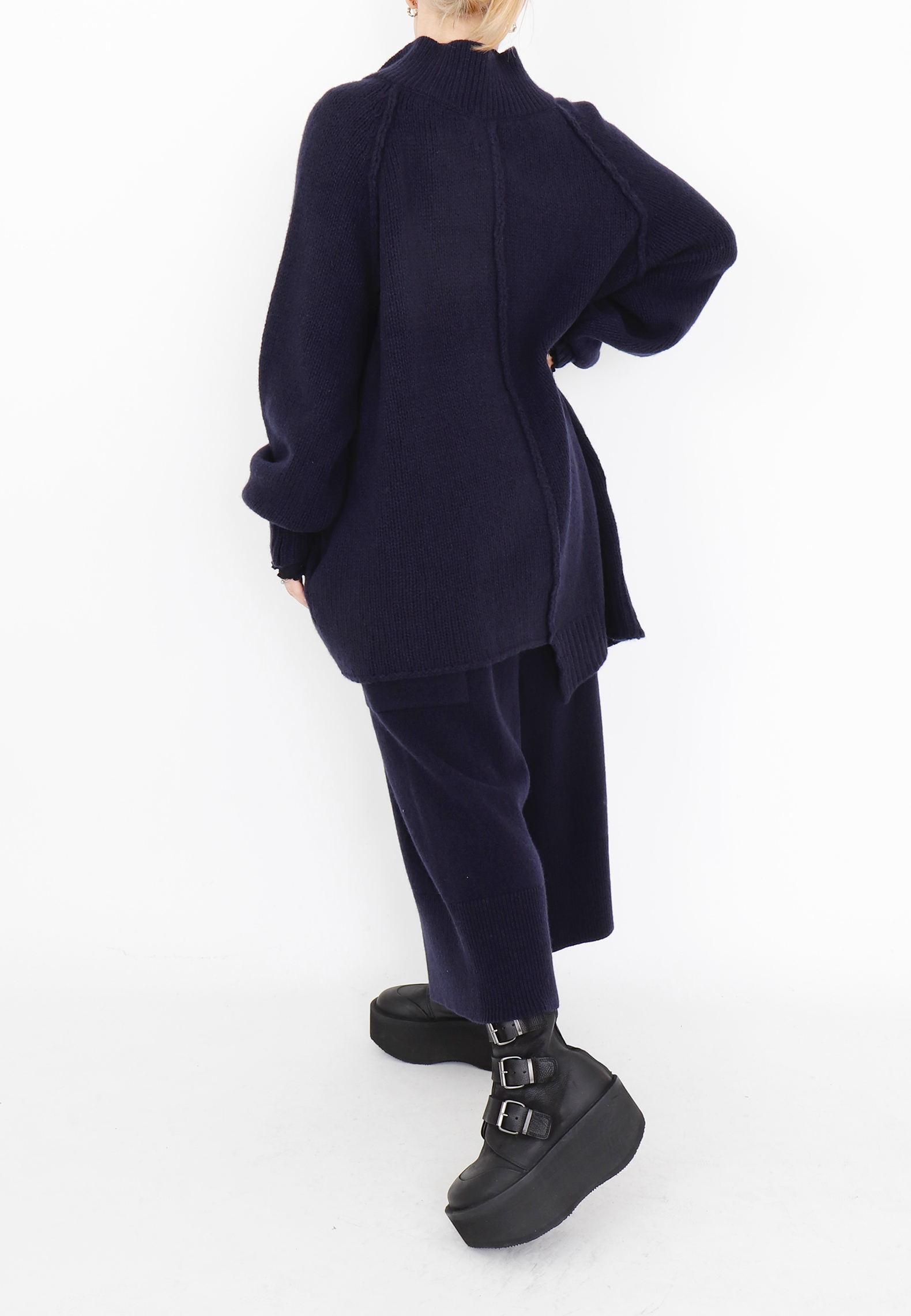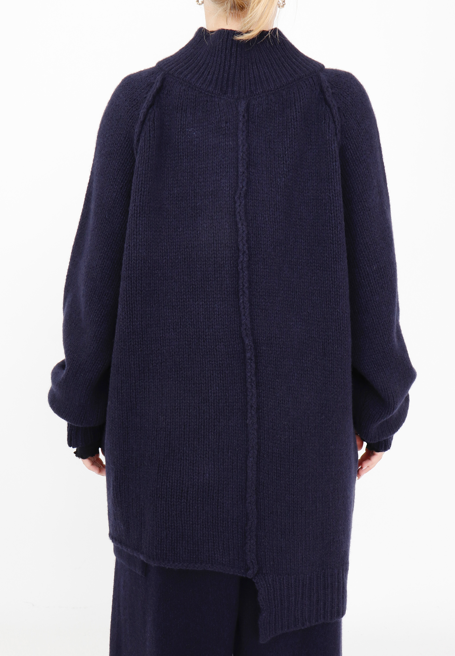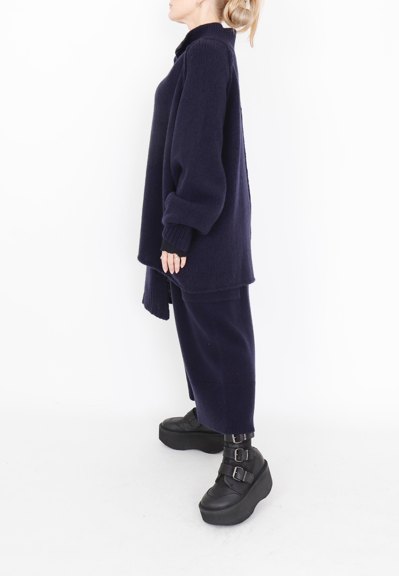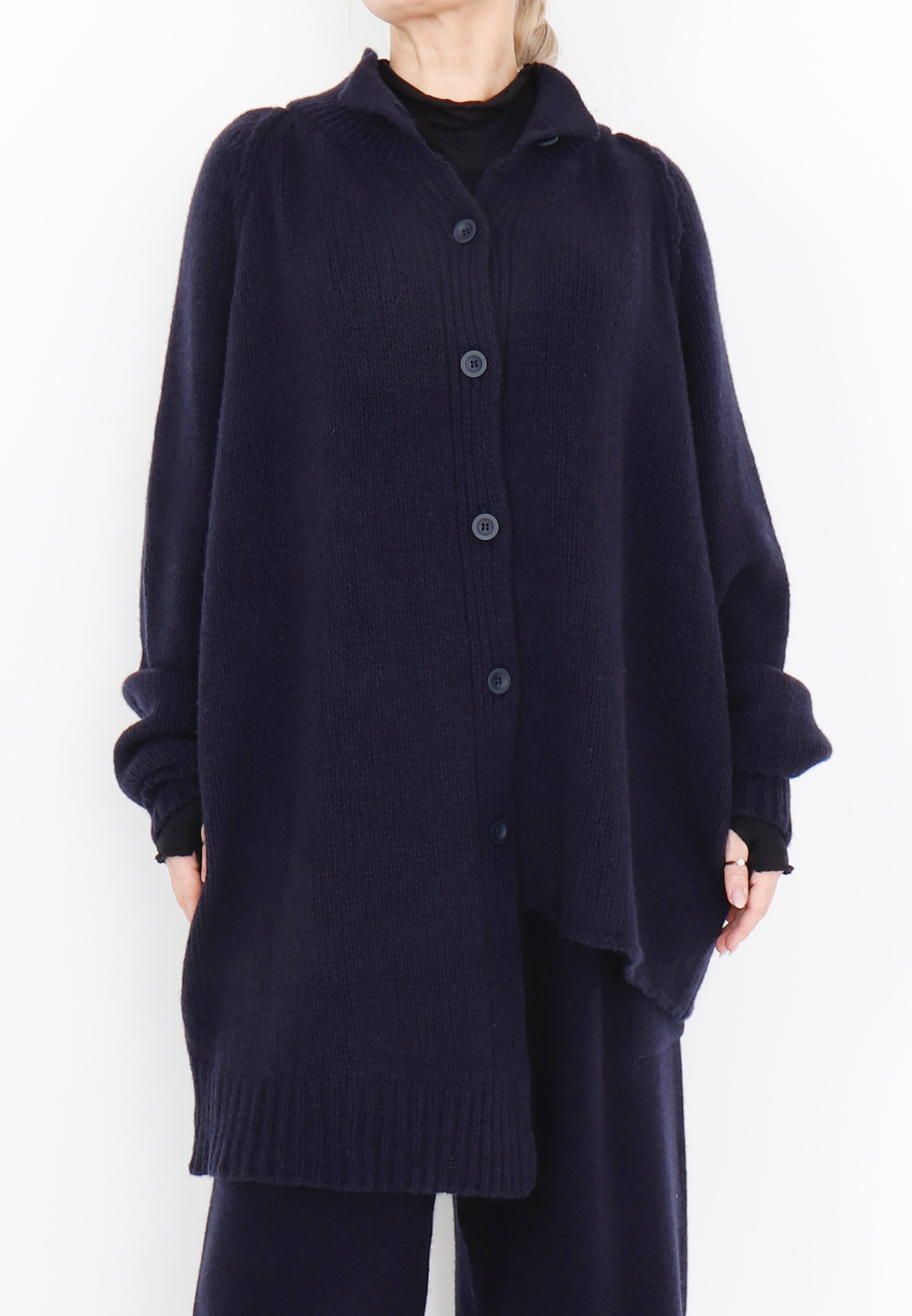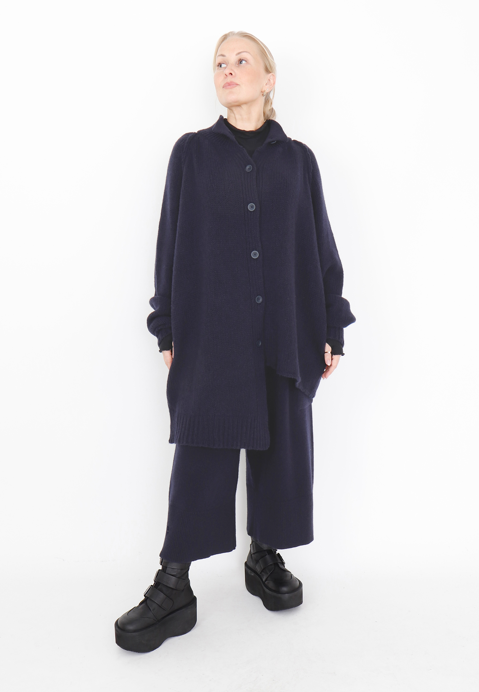 Strikket cardigan / bluse i merinould, her i en smuk navy nuance. Blusen lukkes med knapper og har et asymmetrisk snit foran samt lange ærmer. Merinould er både tyndere og blødere end almindeligt uld fra får, hvilket gør den ekstra behagelig at have på, og samtidig er den stadig varm og temperaturregulerende.Style eksempelvis blusen med matchende strikbukser eller et par fede Sort Aarhus skindbukser.