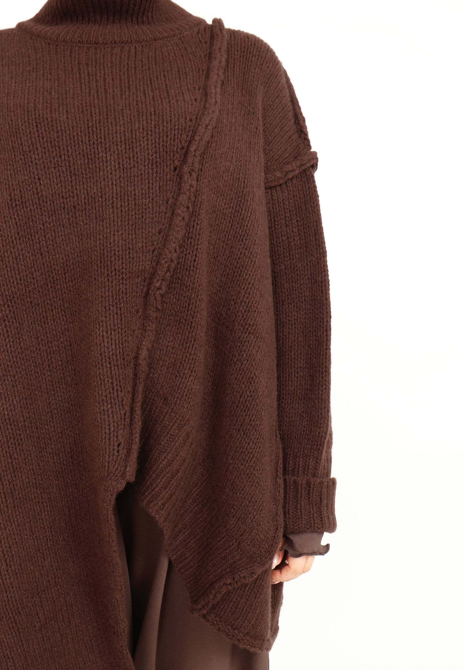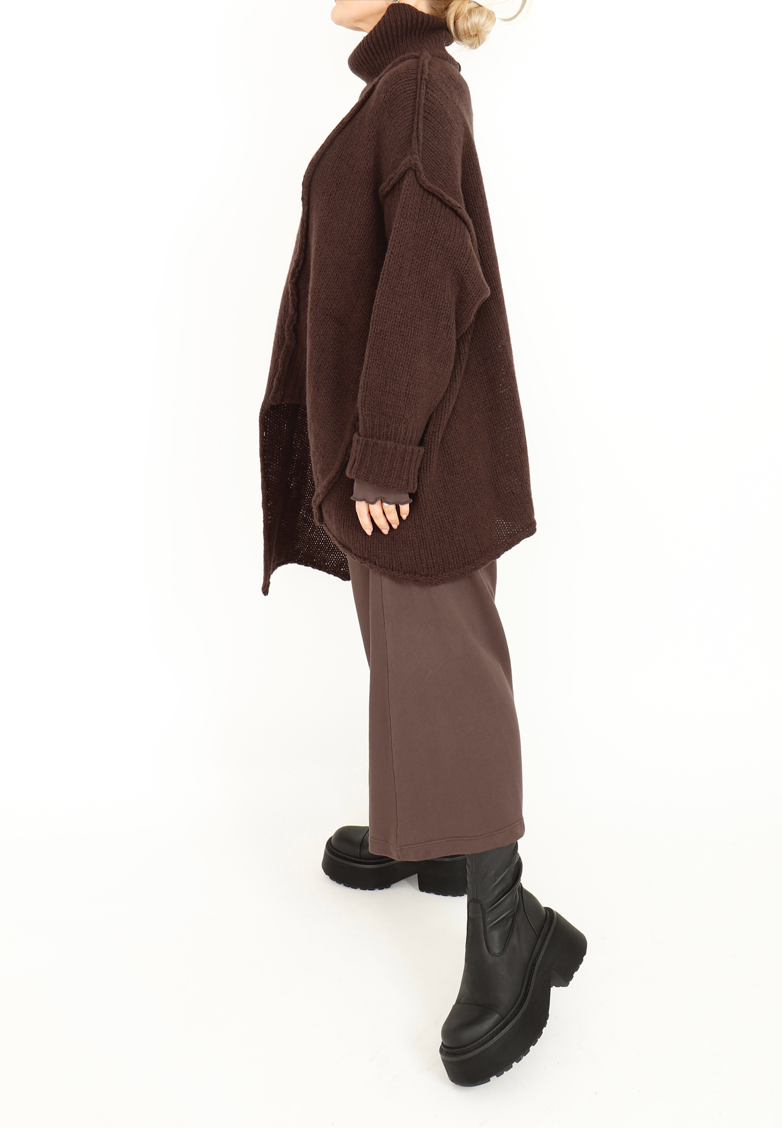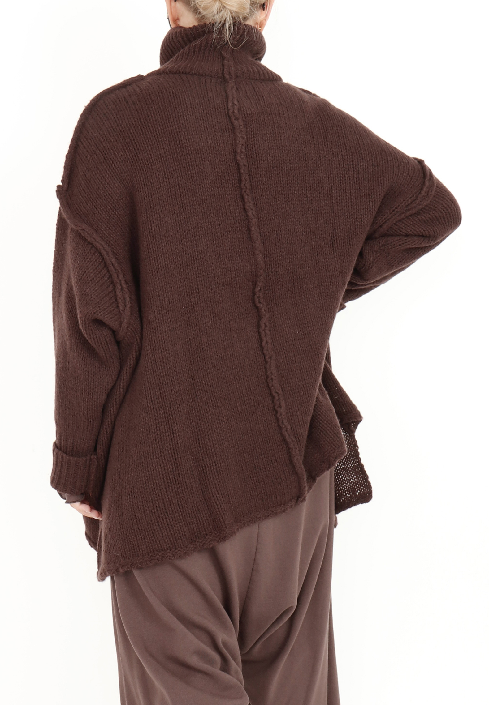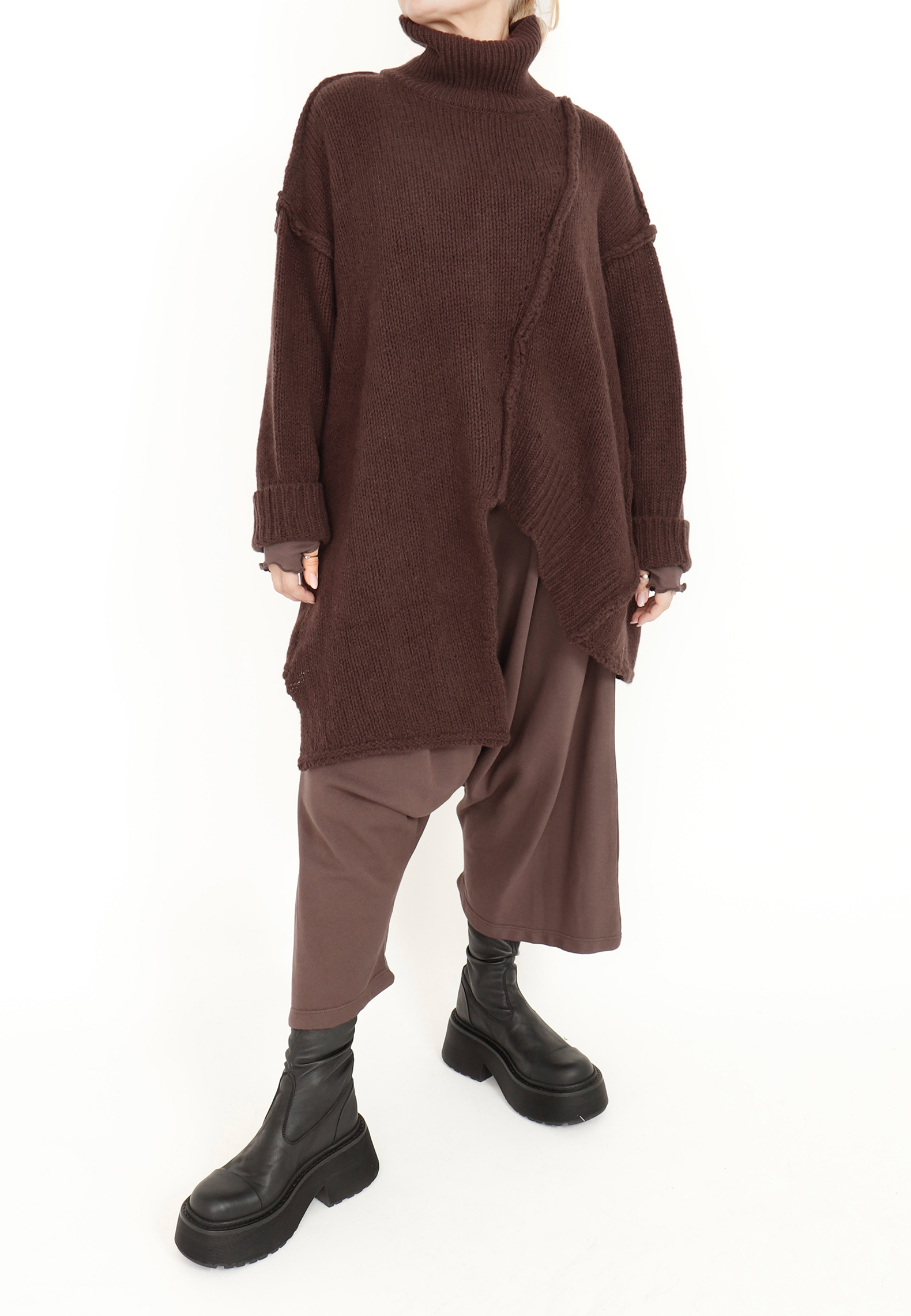 This oversized blouse is knitted from the softest merino wool. It features visible seams, asymmetric cuts, wide ribbed edges and a cozy turtleneck. Available in several colours.