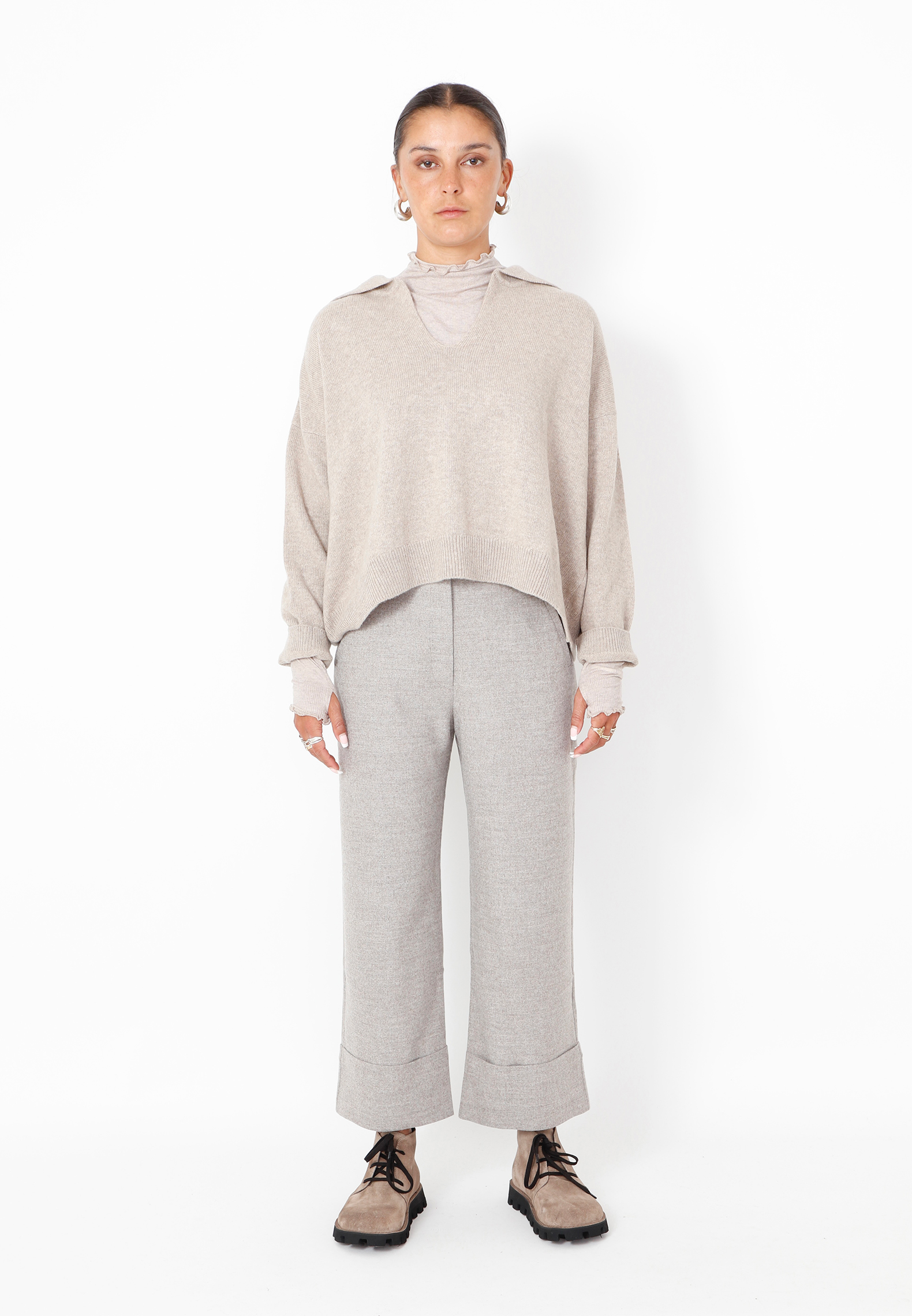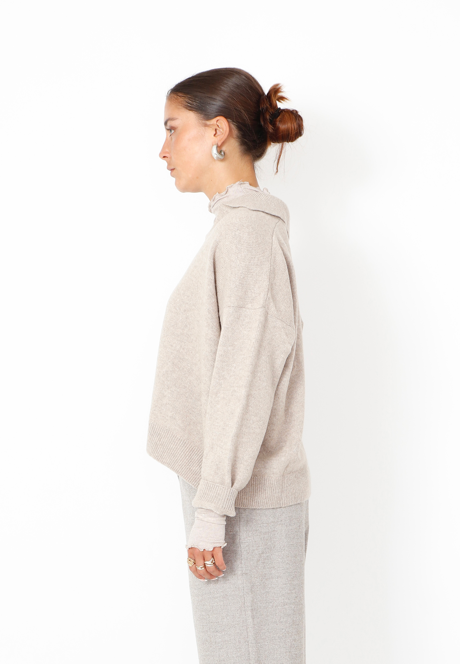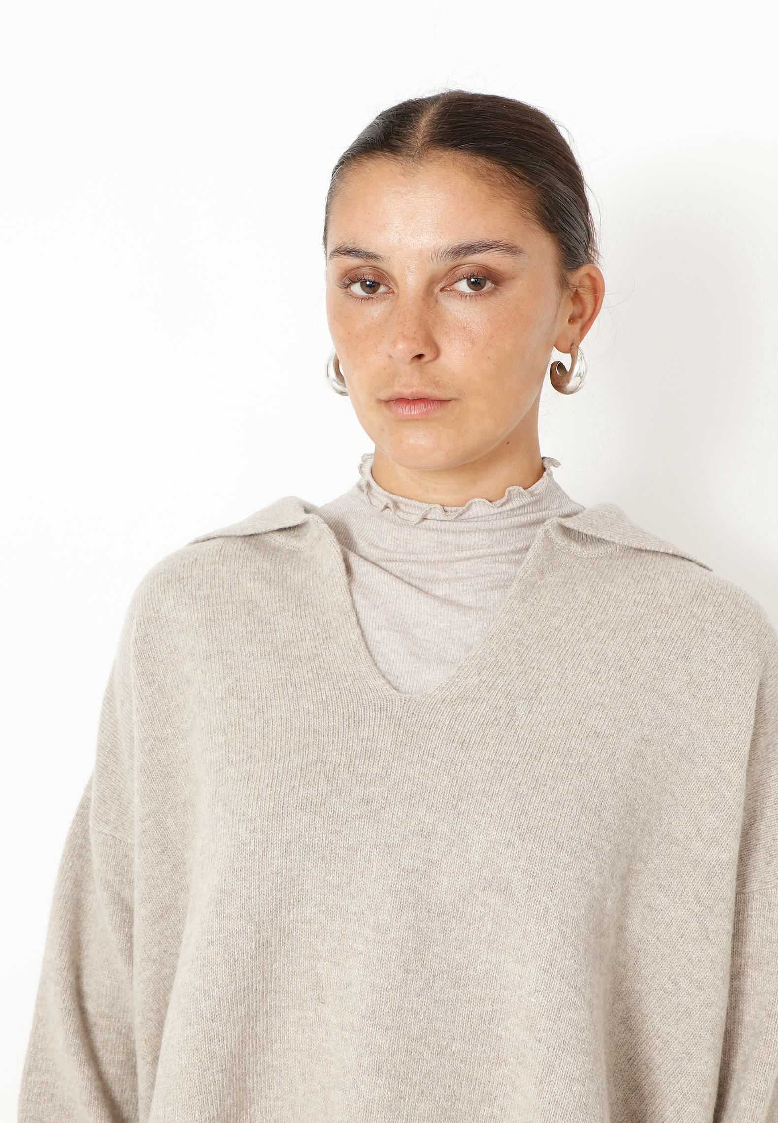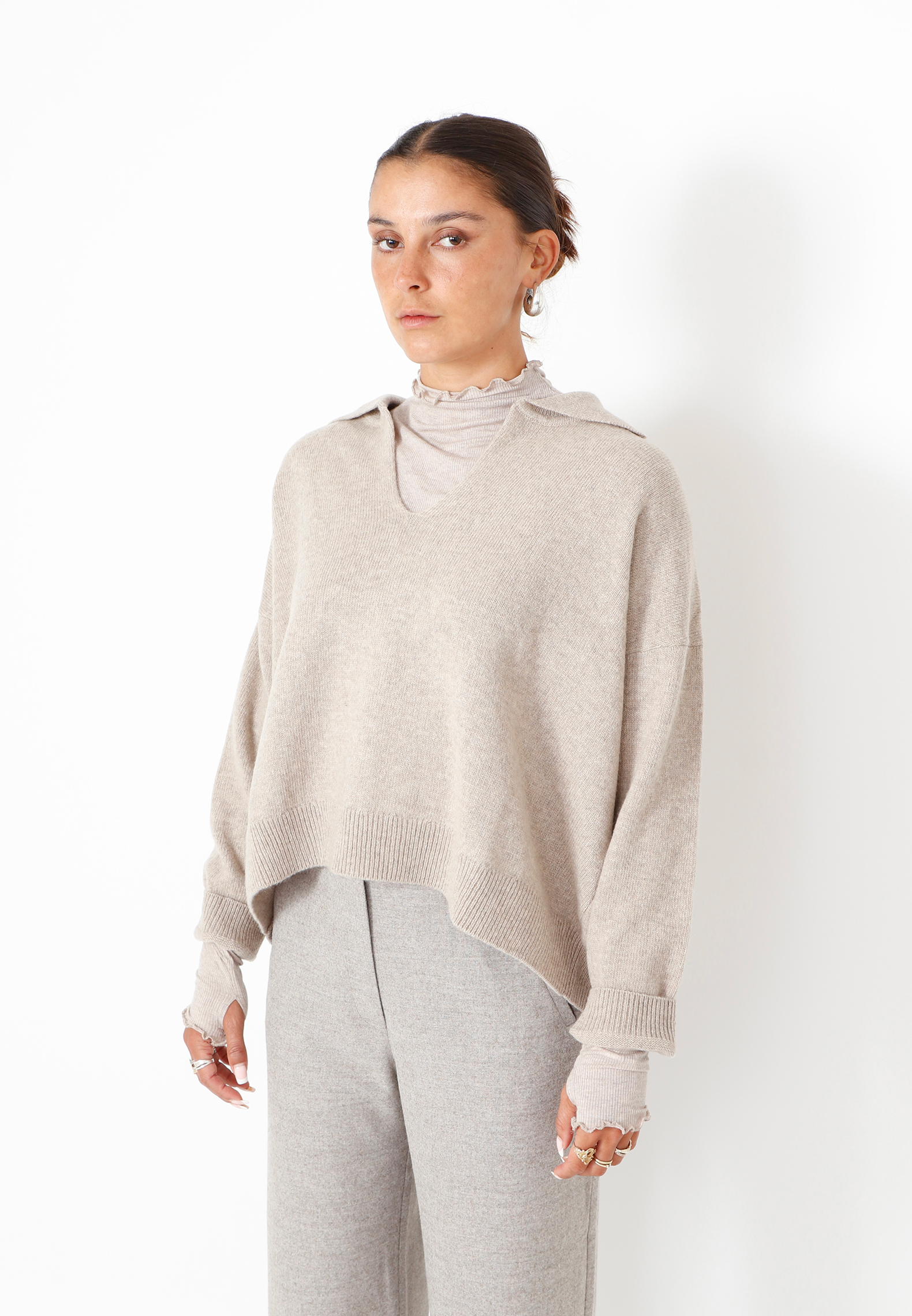 Strikket polo i luksuriøst blødt merinould, der forener klassisk elegance med et moderne udtryk. Her i en flot beige nuance i en afslappet stil og med fine ribdetaljer. Den enkle polokrave tilfører et sofistikeret præg, mens det bløde fald sikrer både komfort og stil. Merinould er både tyndere og blødere end almindeligt uld fra får, hvilket gør den ekstra behagelig at have på, og samtidig er den stadig varm og temperaturregulerende. Perfekt at style med matchende strikbukser eller et par skindbukser for et mere eksklusivt og råt look.