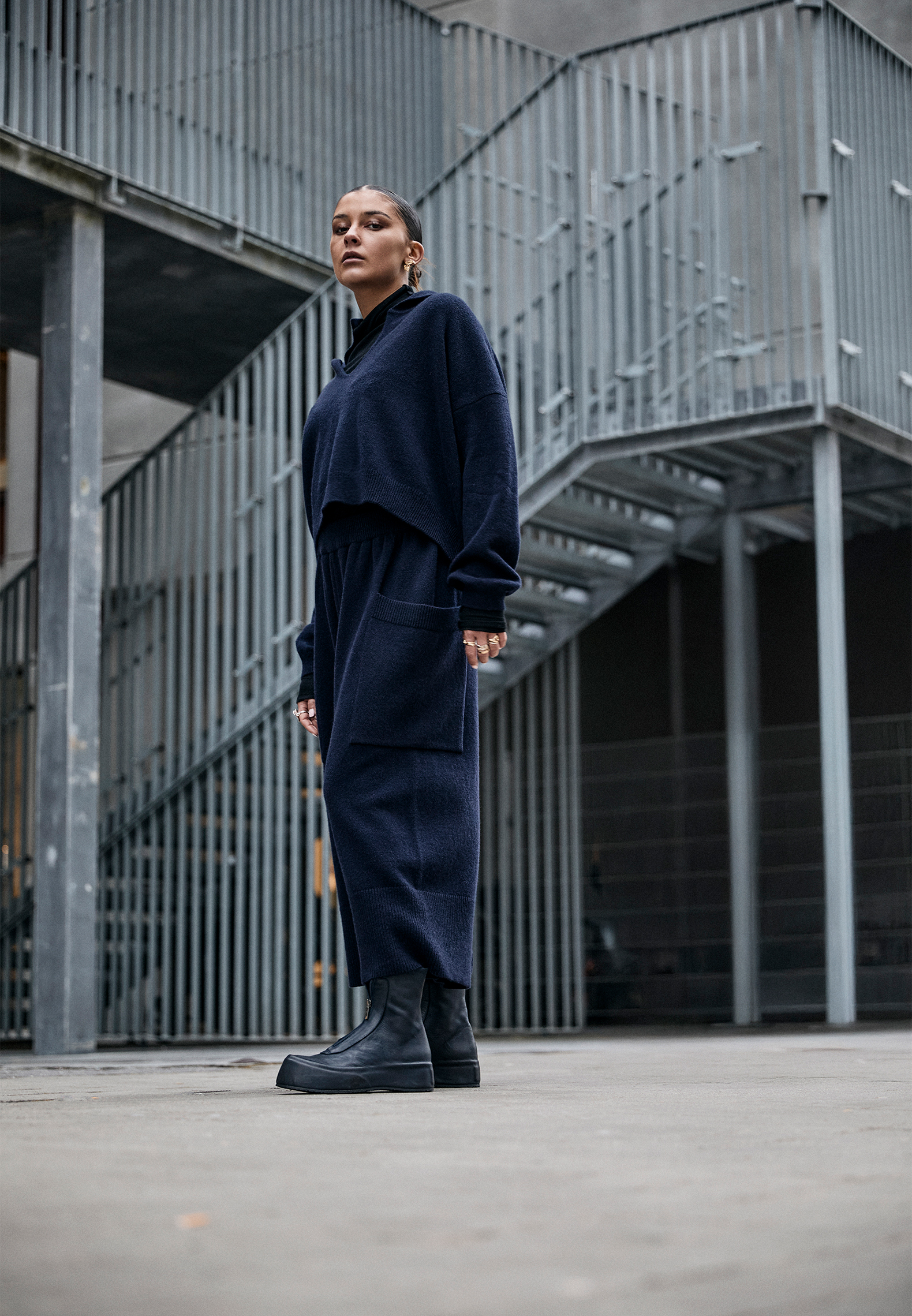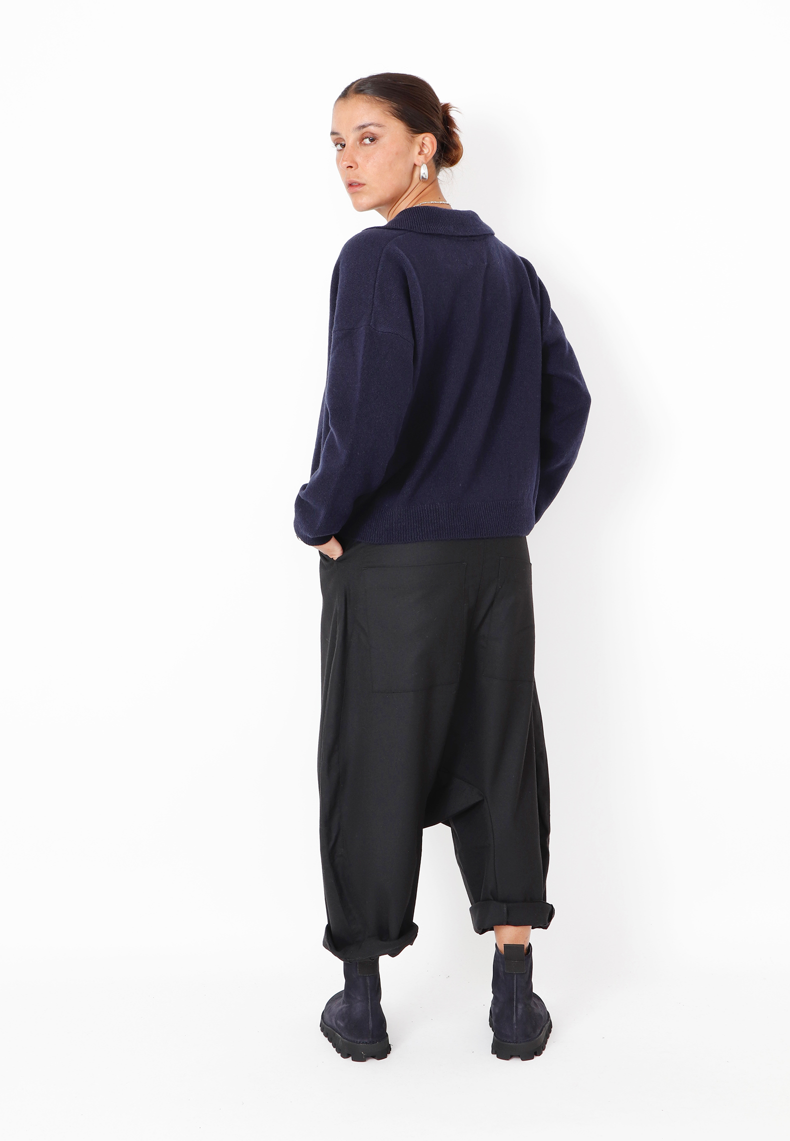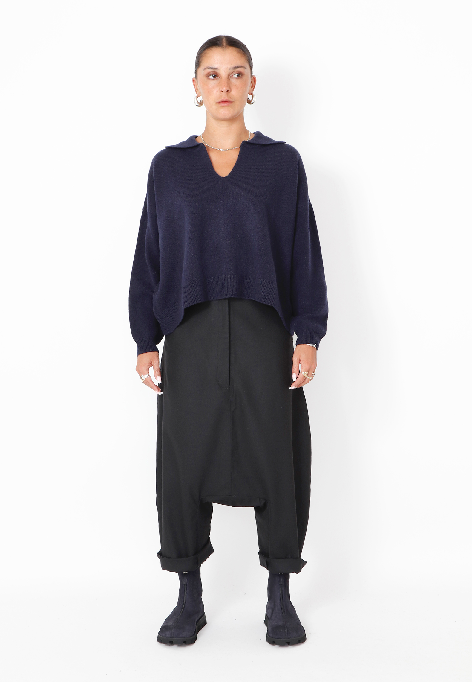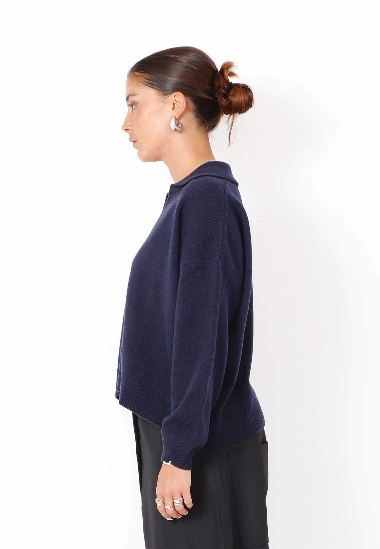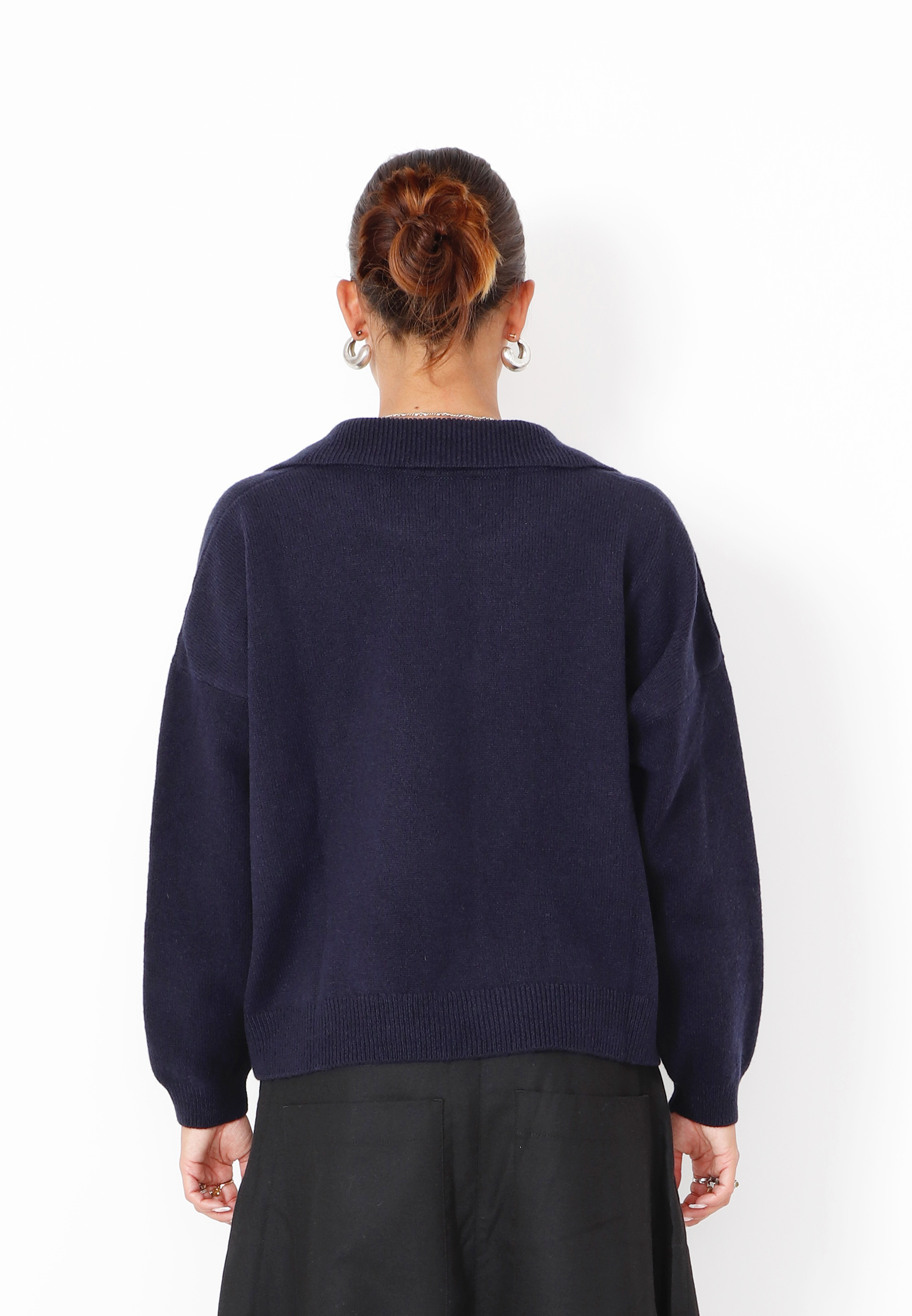 Crafted from luxuriously soft extrafine merino wool, this knitted polo sweater offers a contemporary take on classic elegance. It features a relaxed fit and refined ribbed edges. The understated polo collar adds a sophisticated touch, while the fluid drape ensures effortless comfort and style. Perfect to style with matching knitted pants or a pair of leather pants for a more exclusive and raw look.