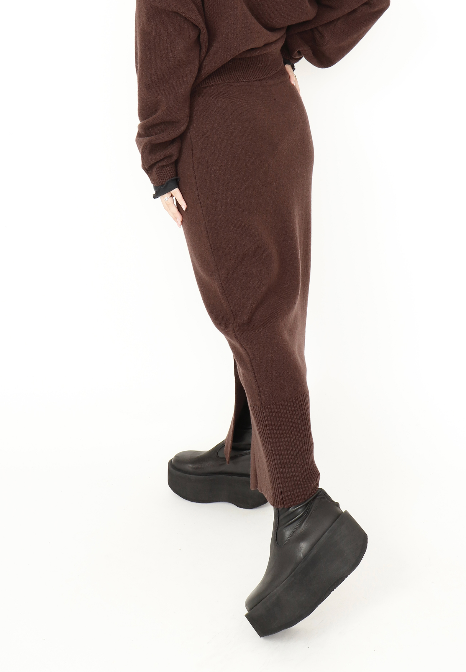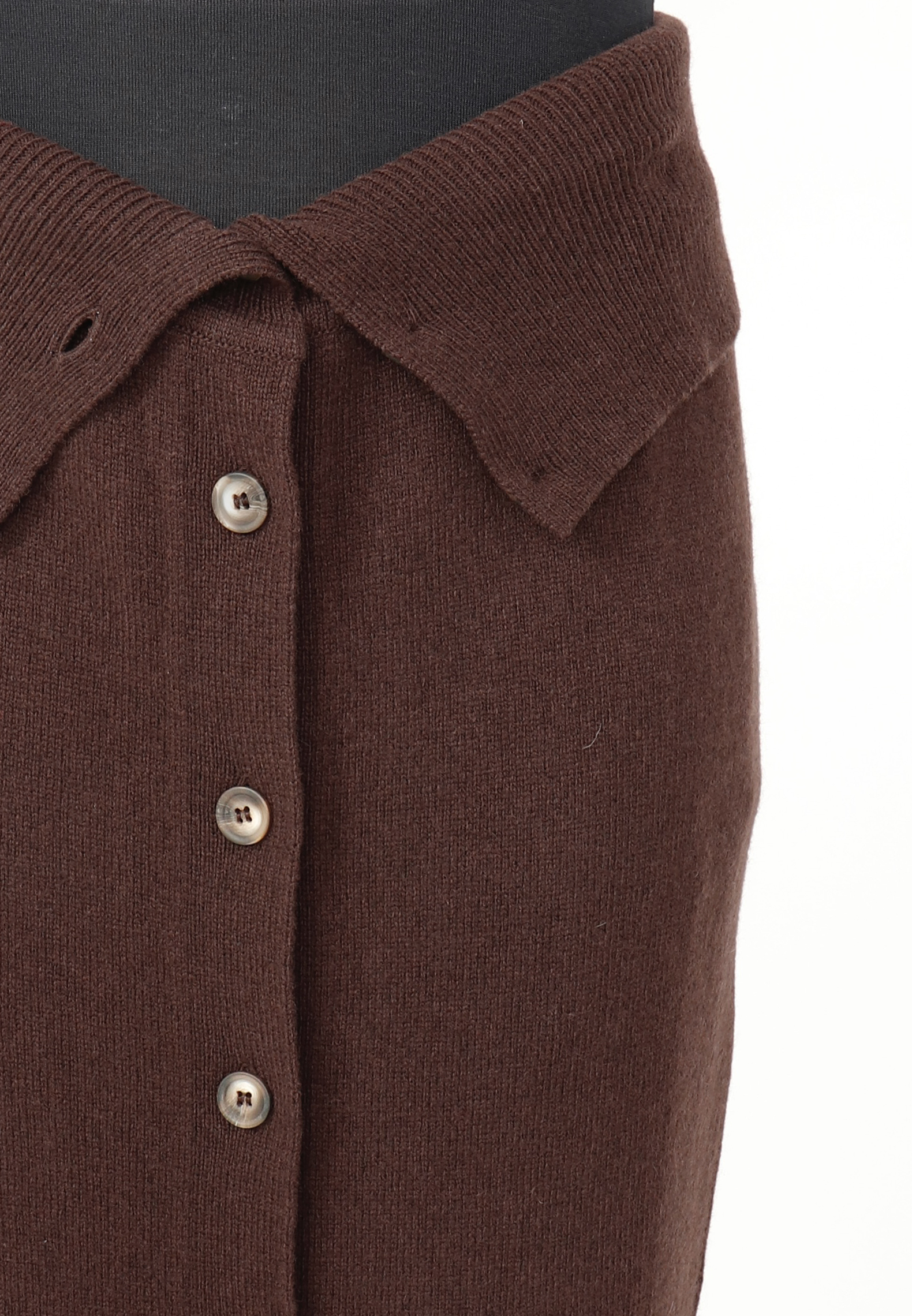 Knitted skirt in soft merino wool with buttons all the way down. The skirt is made with a big rib line at the botton. Here in a nice dark brown color. Style with a matching blouse or the must have shirt SA-ELLA from Sort Aarhus.