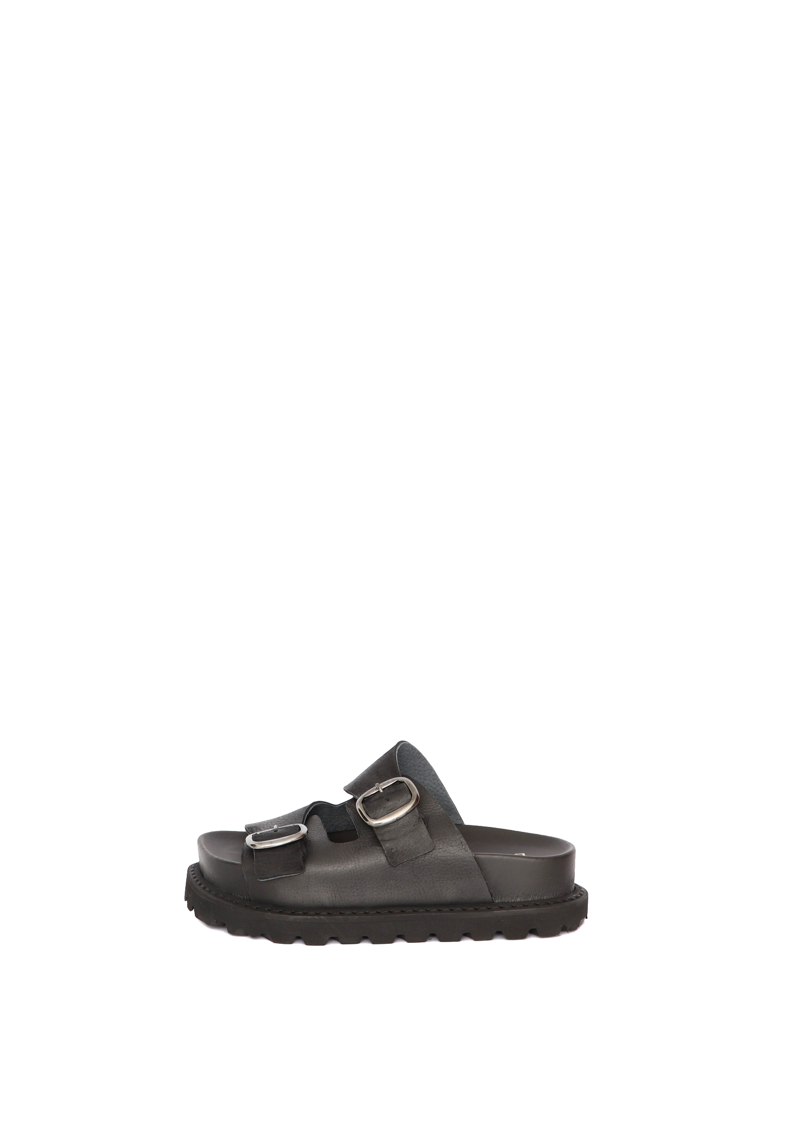 Sandal med dobbelt spændelukning samt en behagelig fodsengssål som giver ekstra støtte. Sandalen er lavet i glat sort kalveskind som er foret med svineskind for at sikre en god åndbarhed. Sålen er fast men let og kommer med en kraftig synlig syning.