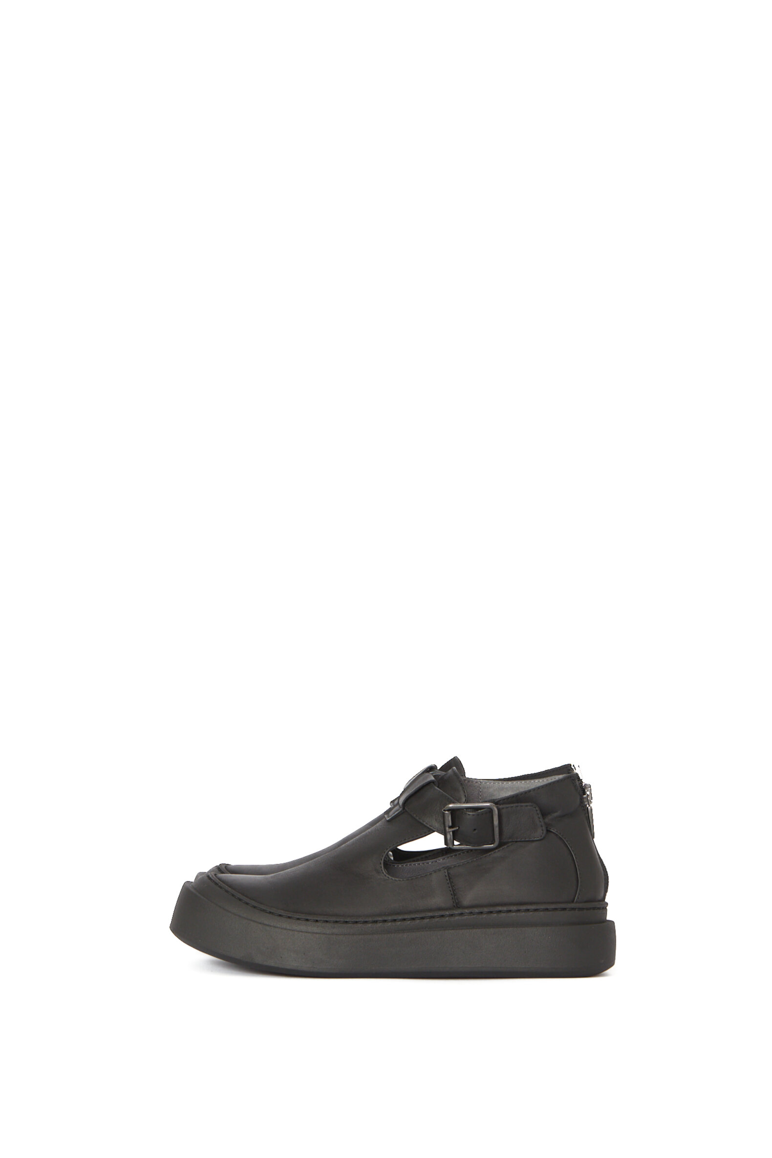 Åben sko i glat sort kalveskind, foret med svineskind for god åndbarhed og komfort. Skoen er med et enkelt spænde på siden samt lynlås bagtil for nem adgang. Sålen er vores bestseller gummisål, som er slidstærk og yderst komfortabel, så du kan bruge skoen i mange år. Indersålen kan tages ud.