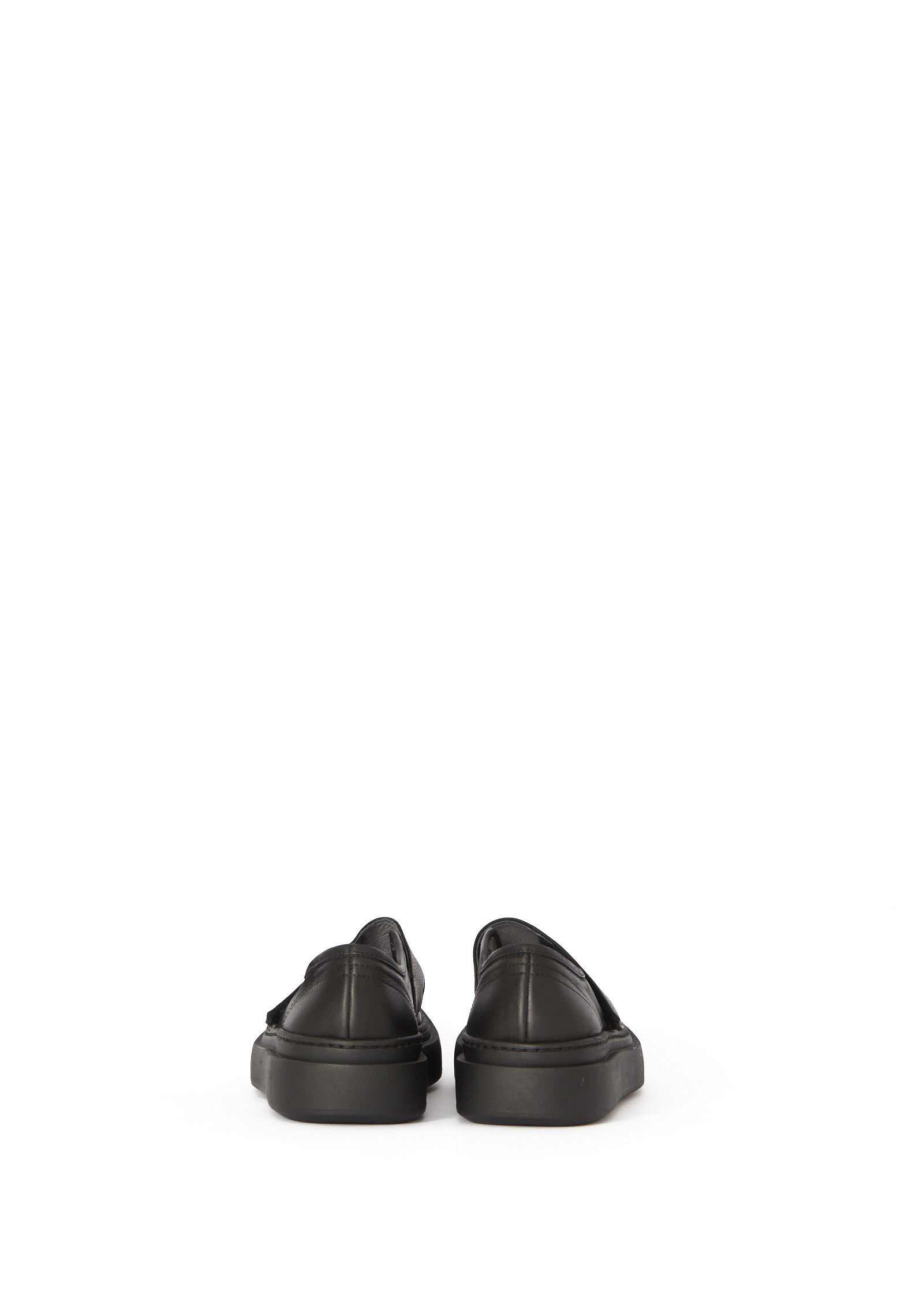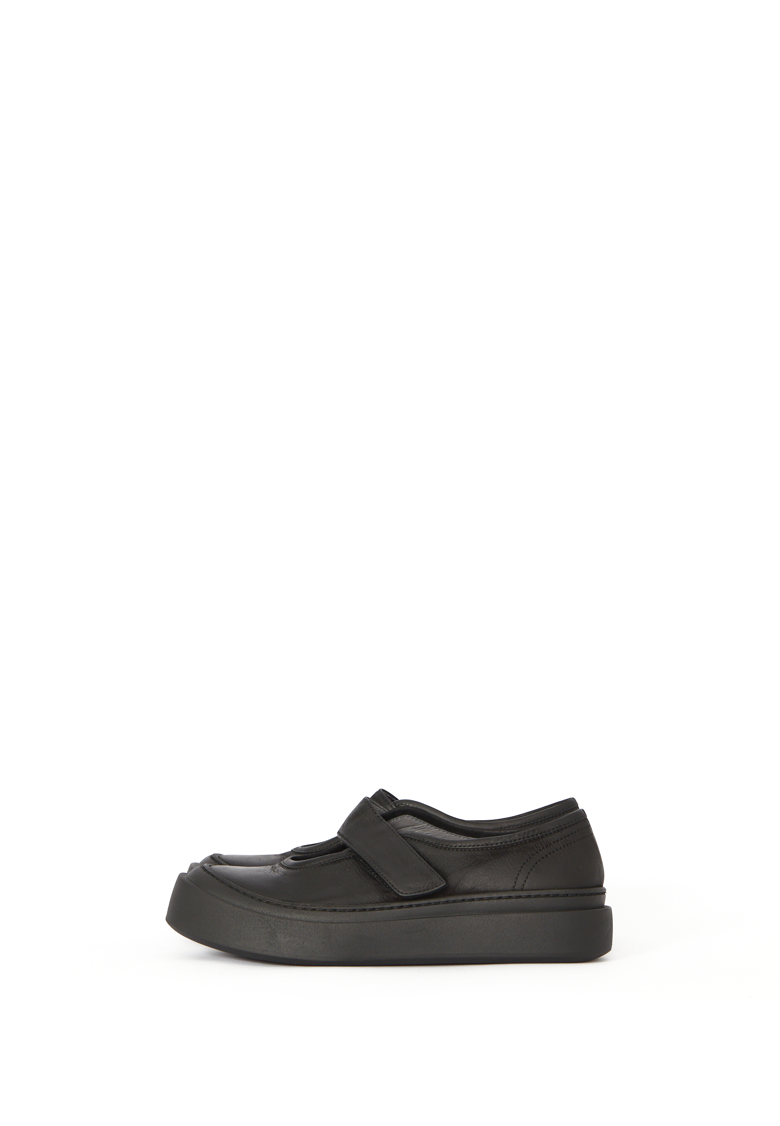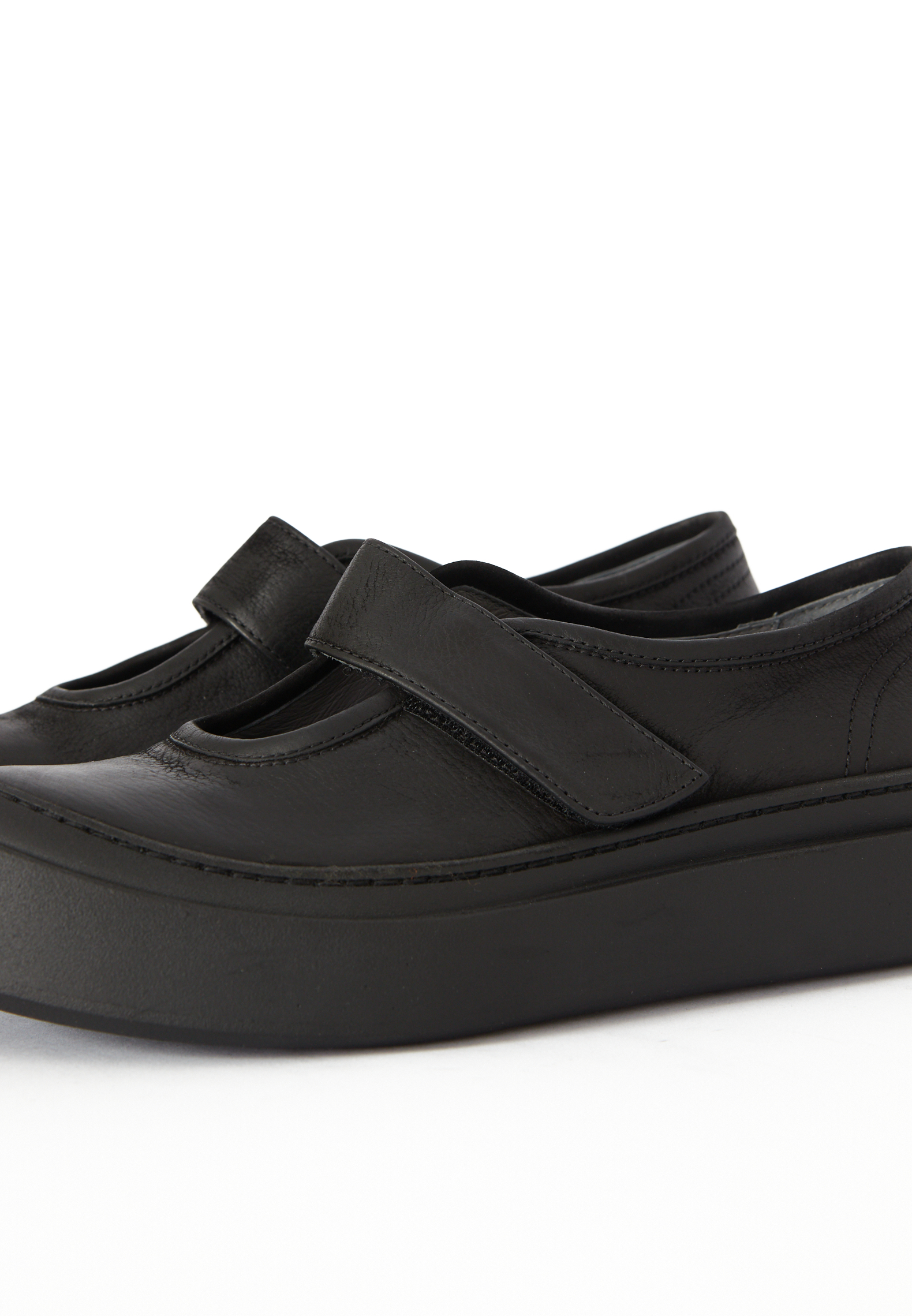 Open shoe in smooth black calfskin with a pigskin lining for good breathability and comfort. The shoe comes with a simple velcro closure. The sole is firm and has a higher density than other lighter Lofina soles. The insole is removable.