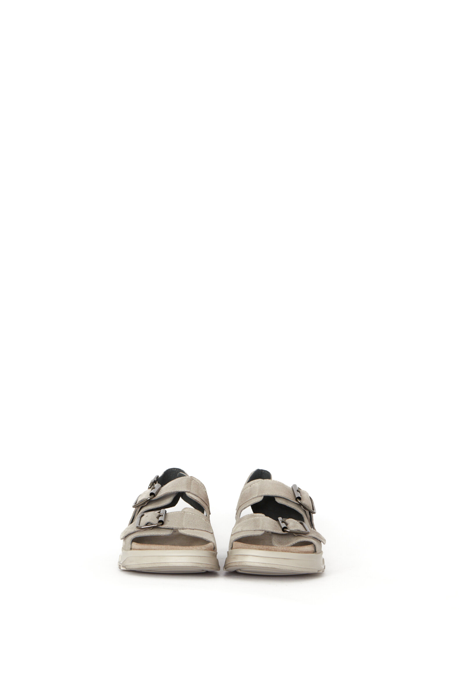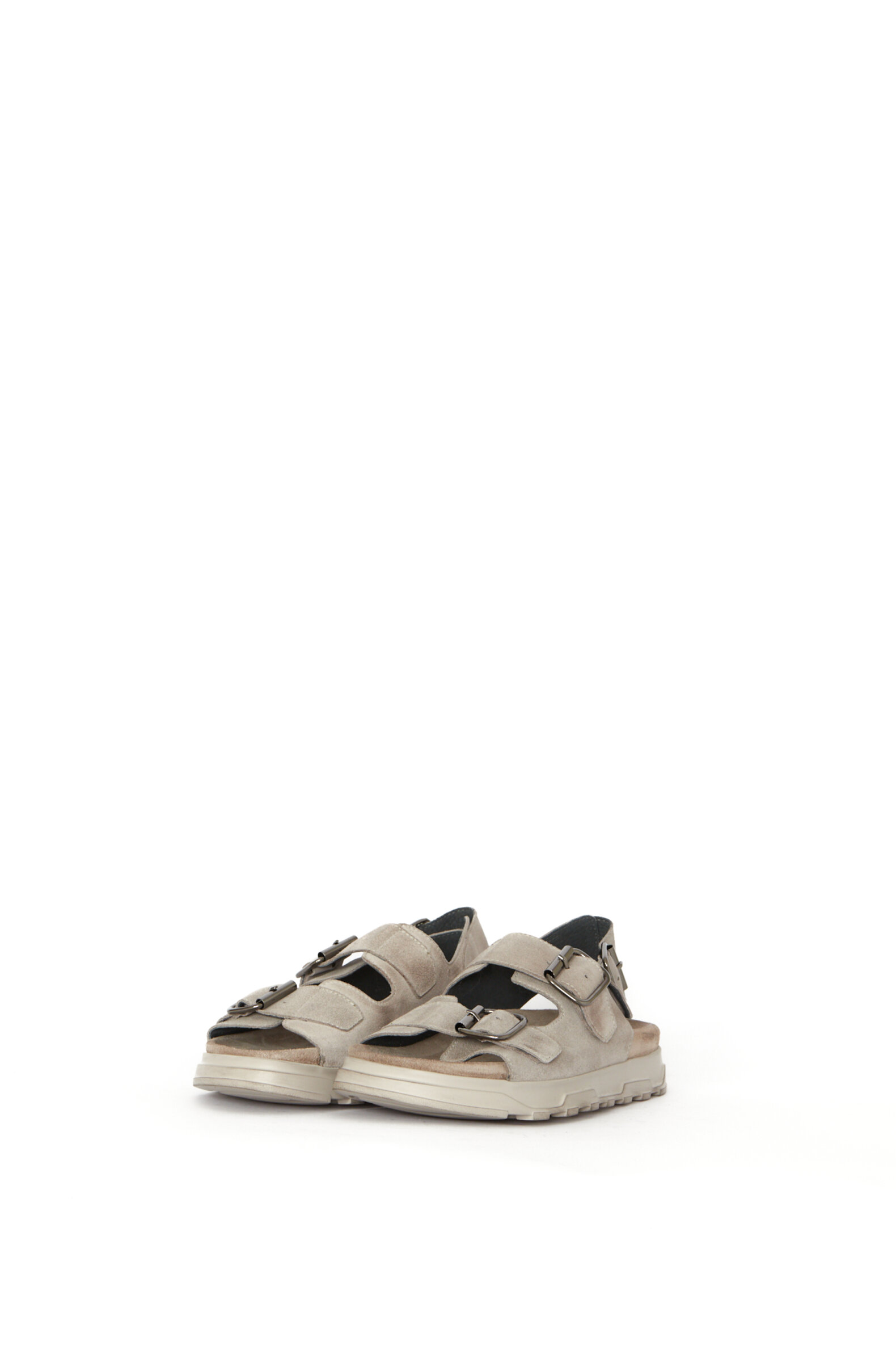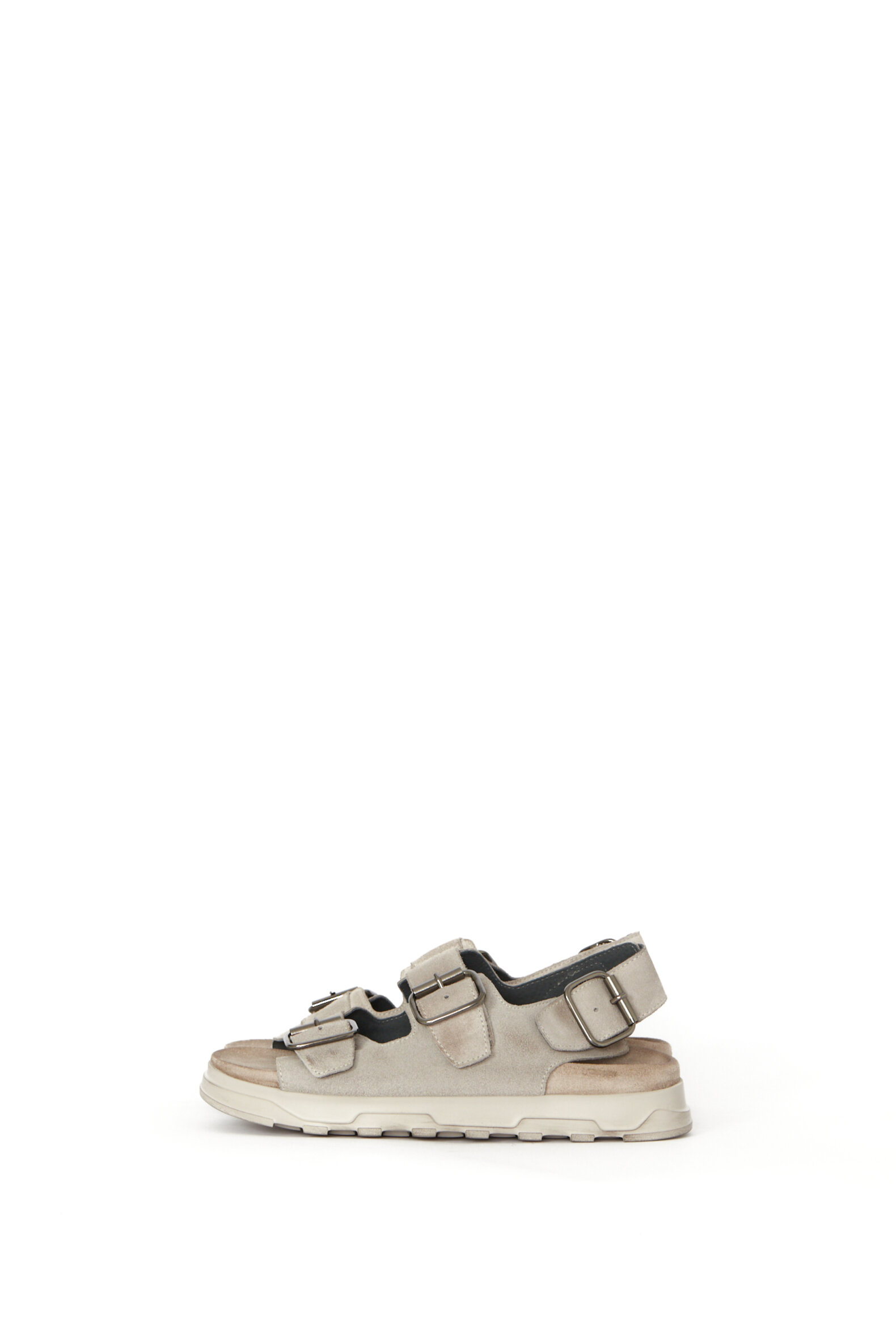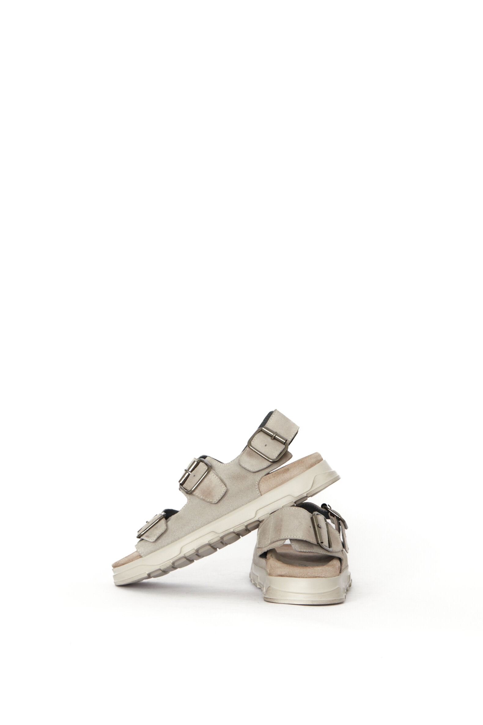 Sandal in soft light grey suede of calfskin with a pigskin lining for better breathability and comfort. The comfort continues with the soft footbed sole. Comes with three adjustable buckles for optimal fitting.