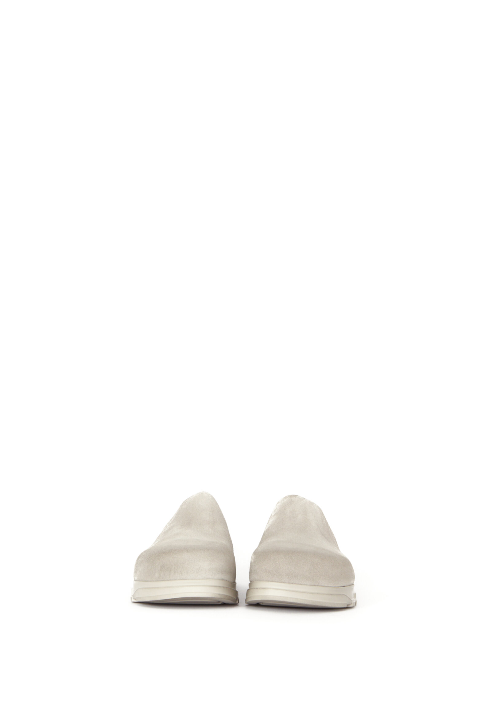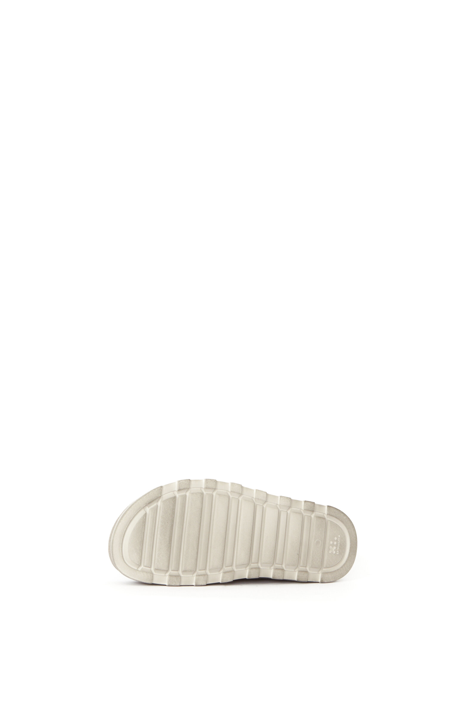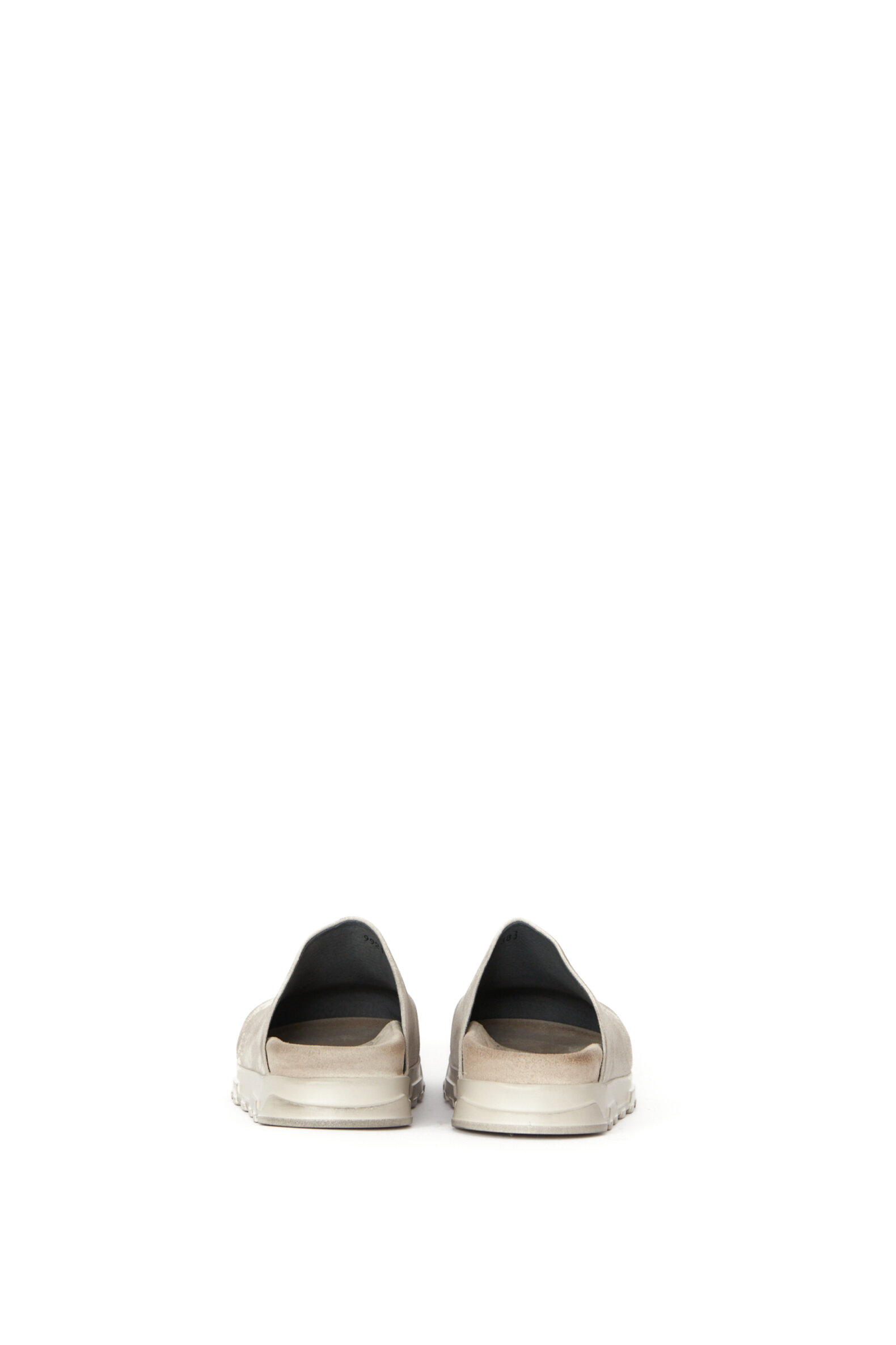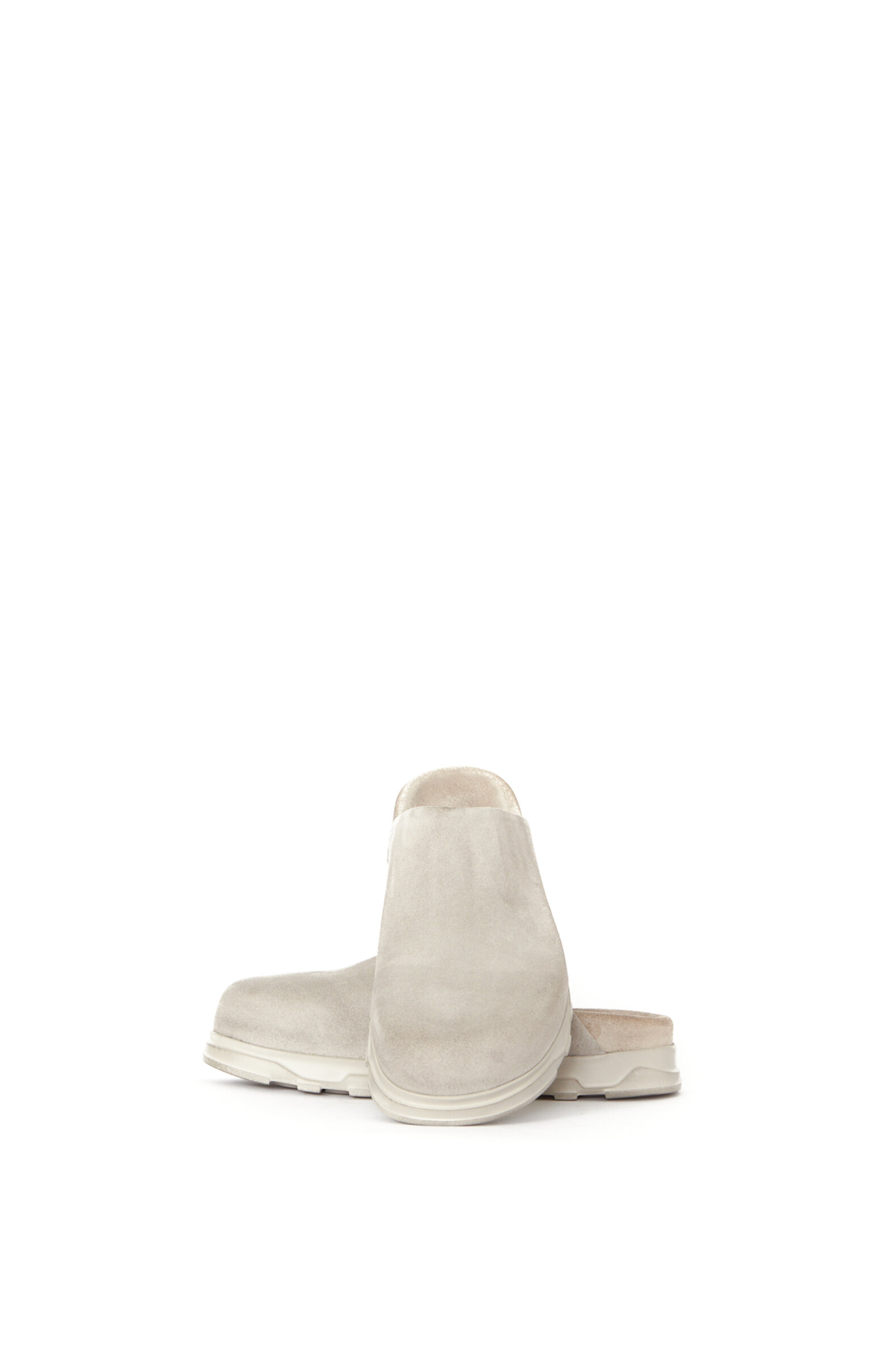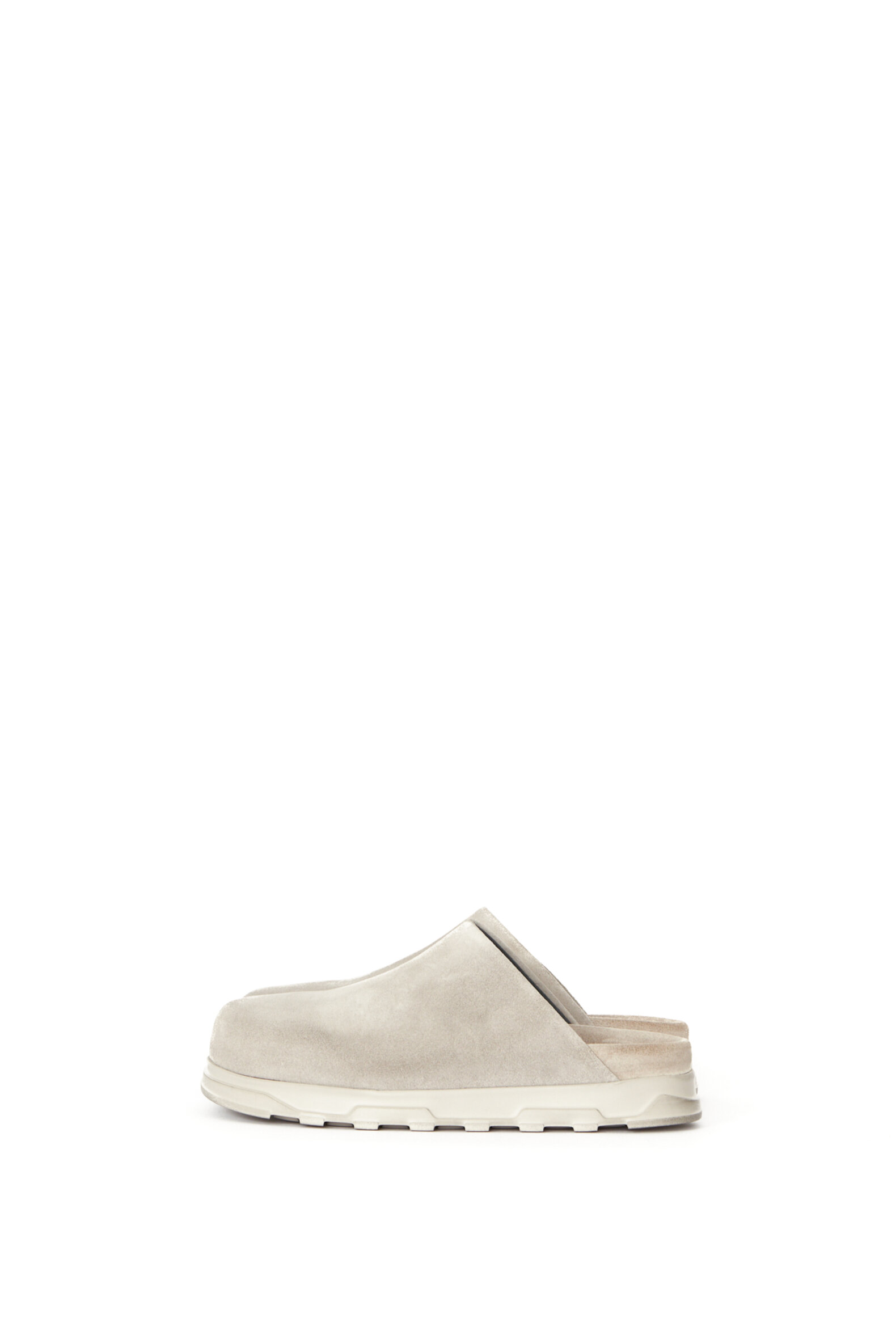 Tøffel sandal i lysegråt ruskind af kalveskind foret med svineskind for ekstra god åndbarhed og komfort. Komforten fortsætter i form af den bløde fodsengssål, som også giver ekstra støtte. Sålen er vores absolutte bedst-sælgende sål. God til hjemlig hygge, på arbejde eller en tur ved stranden.