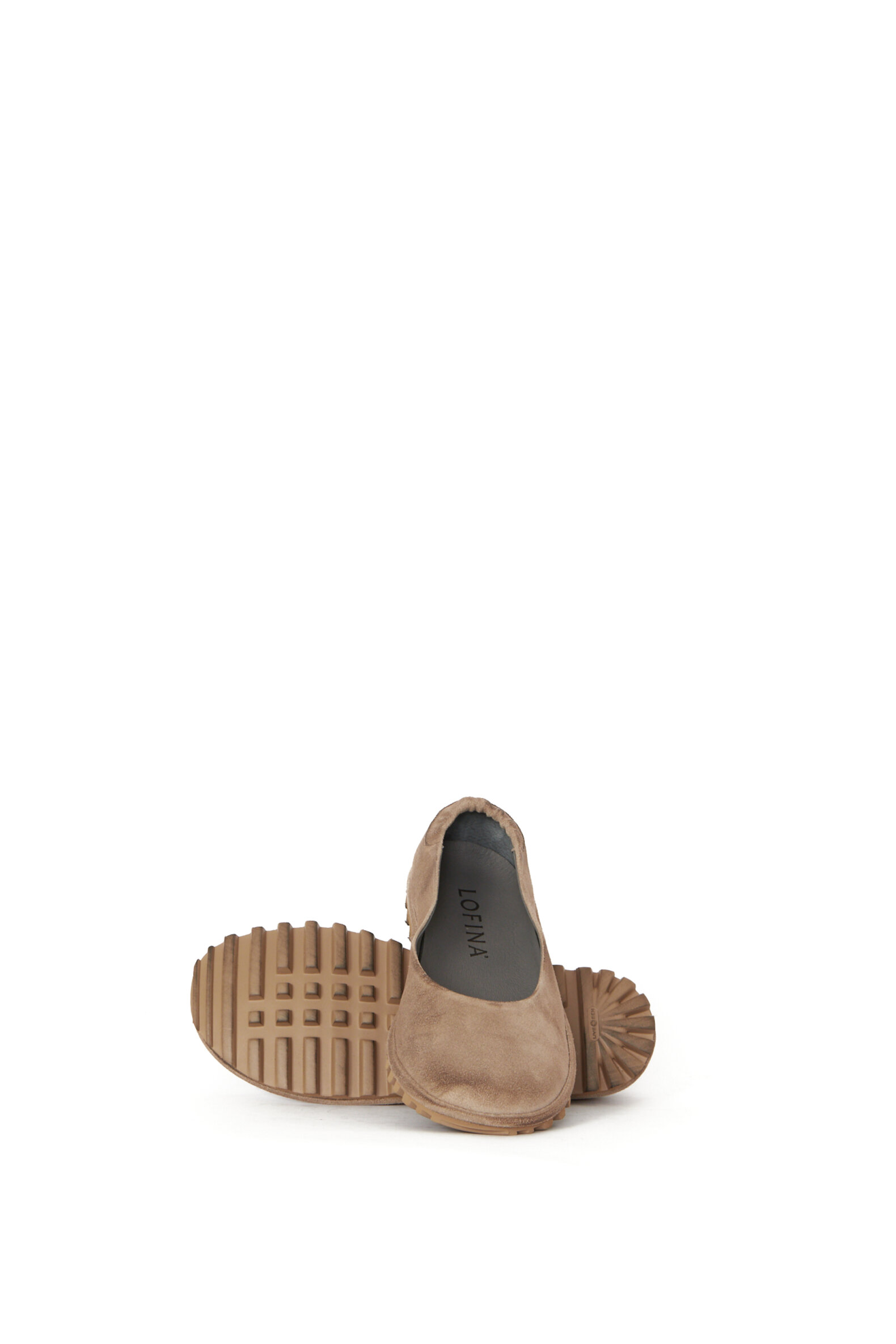 Handmade ballerina in soft, naturally suede that offers an authentic and refined appearance. The organic structure of the leather is clearly visible on the surface, adding character and highlighting the unique craftsmanship of each model. The shoe is lined with pigskin for excellent breathability and comfort. An elegant, timeless style that can easily be worn both casually and in more sophisticated settings. The lightweight and flexible sole ensures optimal comfort and grip.