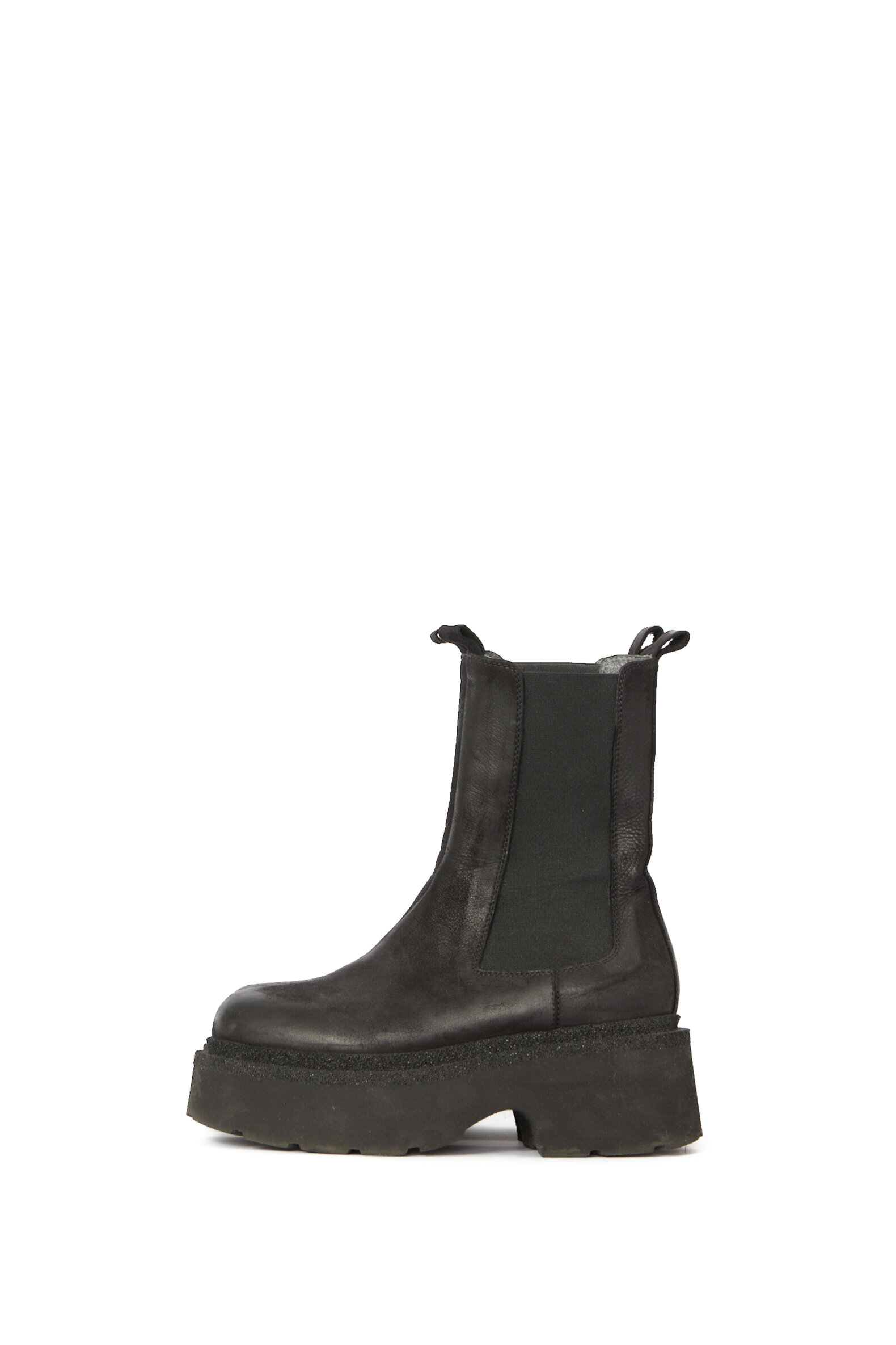 Dette er en kollektionsprøve i størrelse 37. Chelsea støvle i sort kalveskind foret med svineskind. Støvlen har elastik i siden og en strop for nem adgang. Sålen er chunky men samtidig feminin, og overraskende let at have på.Materiale
