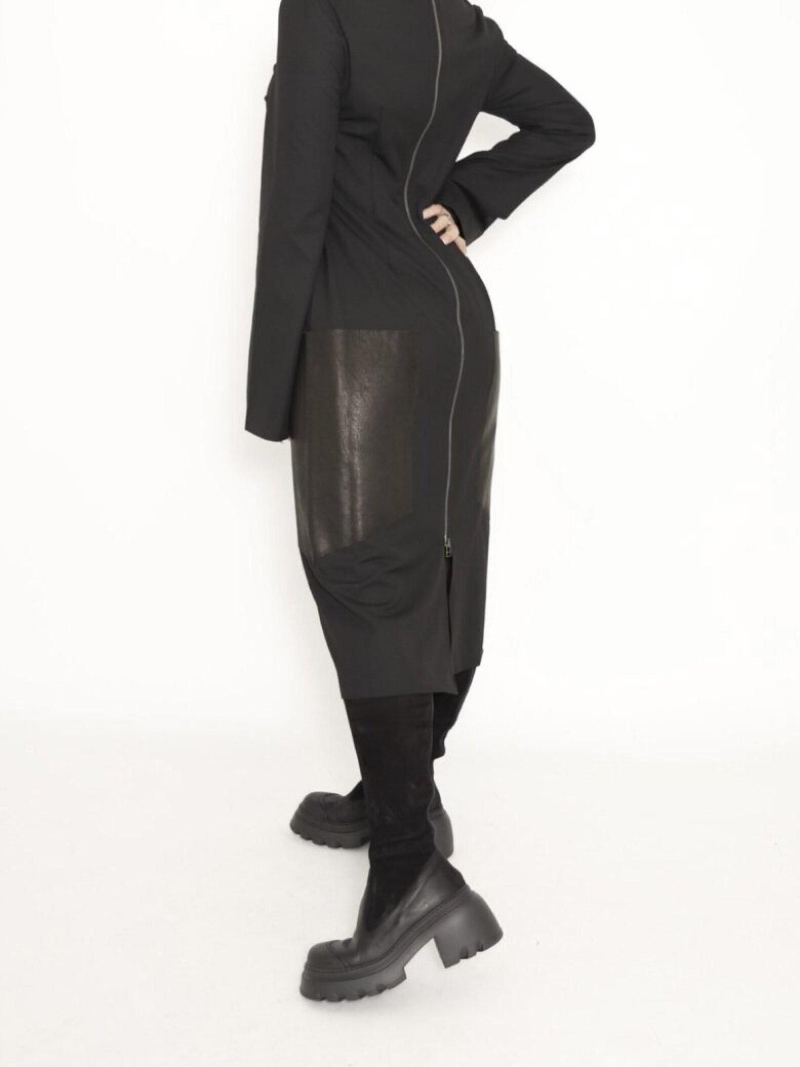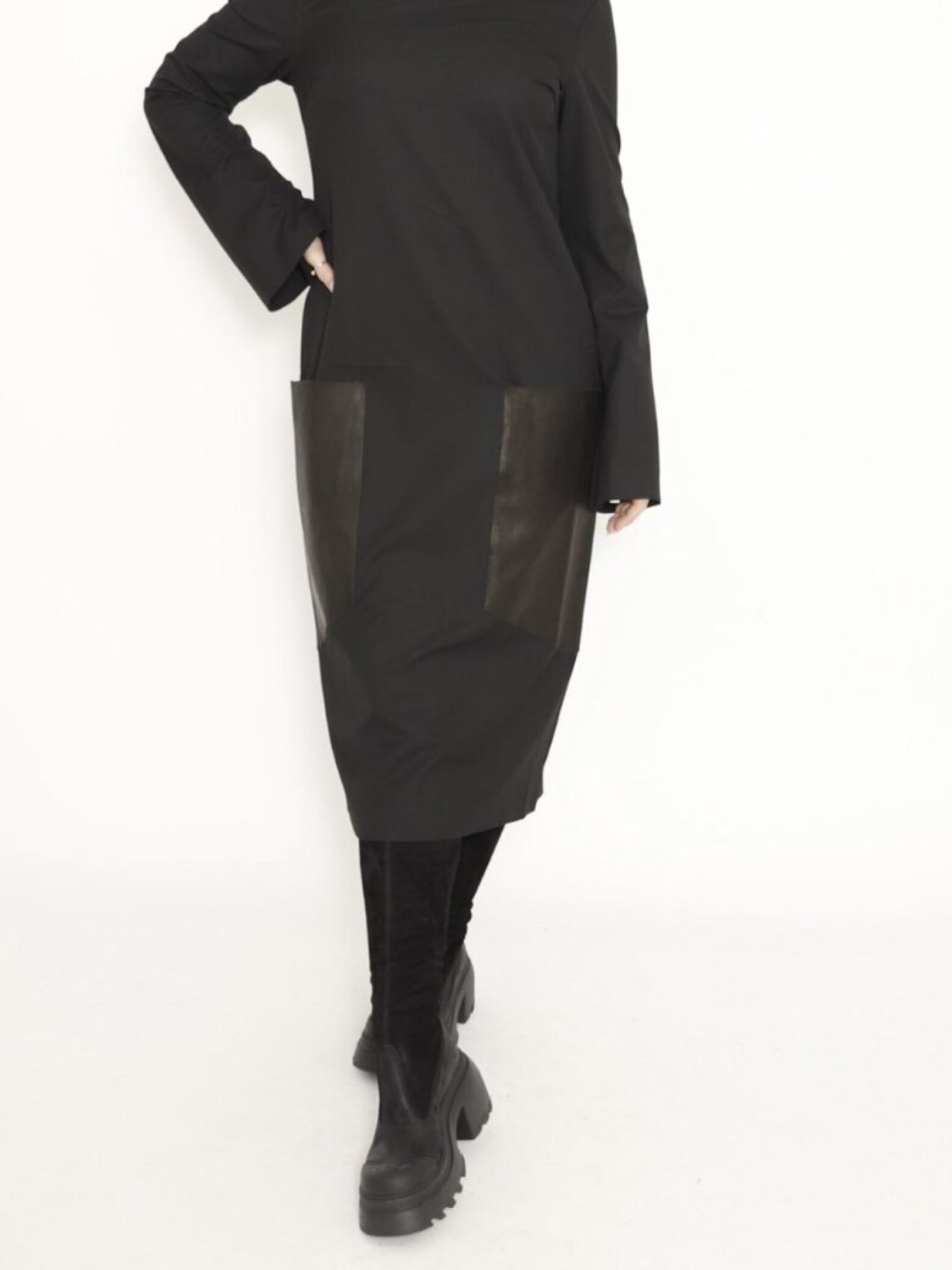 Denne kjole med læder lommer og lynlås i ryggen er en kollektionsprøve.