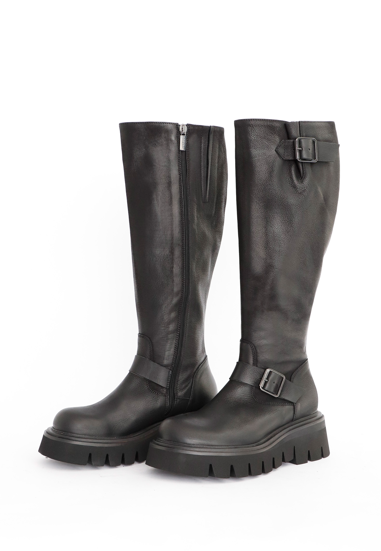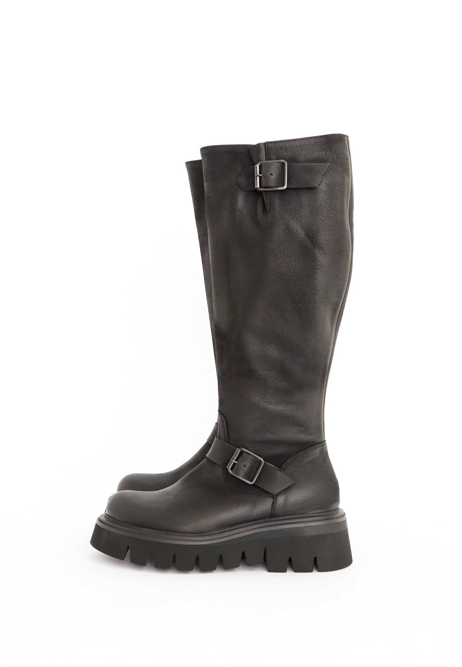 Dette er en kollektionsprøve i størrelse 37. Lang støvle i kalveskind foret med svineskind. Kommer med spænder og lynlås for et råt look samt ned adgang.Materiale