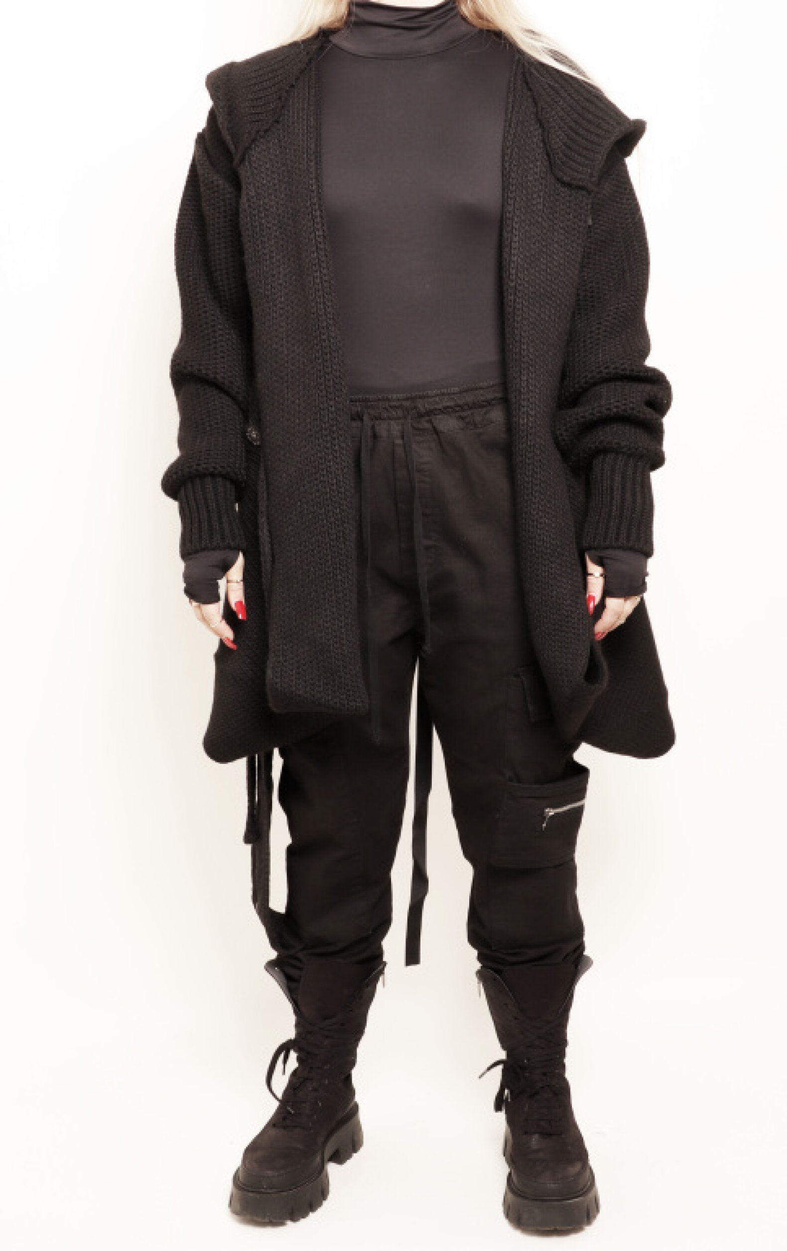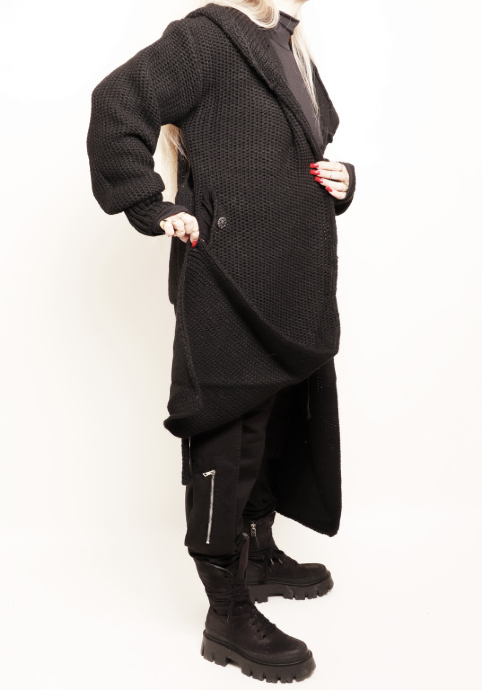 La Haine Inside Us strik cardigan i lækker kvalitet. Cardiganen har bindebånd og hætte. Asymmetrisk snit. Modellen har to-i-én look (kort/lang). Cardiganen er normal i størrelsen.Materiale