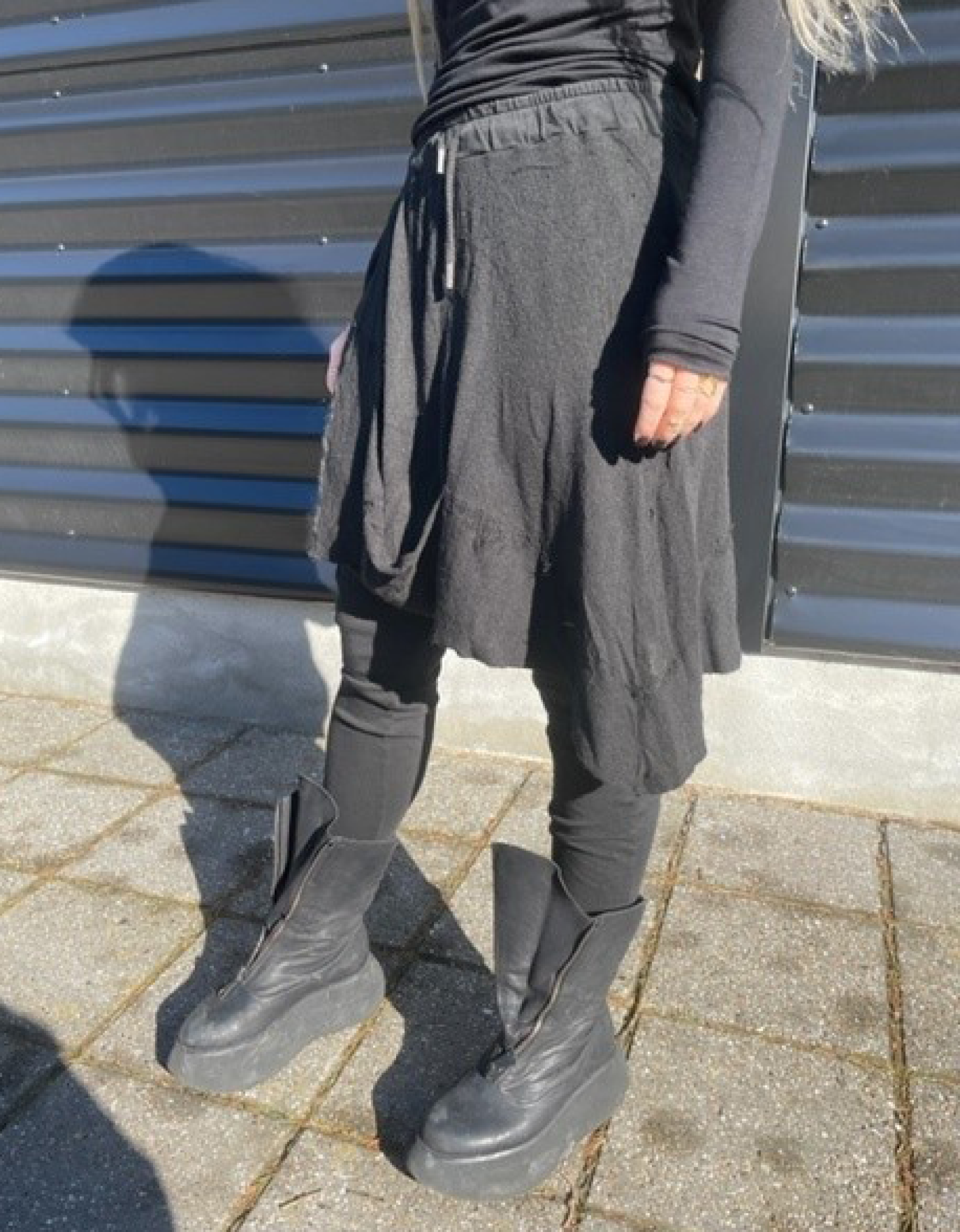 La Haine Inside Us bukser i lækker blød kvalitet. Elastik og snøre i taljen. Tætsiddende buks med fed løs detalje over lår og bagdel.Materiale