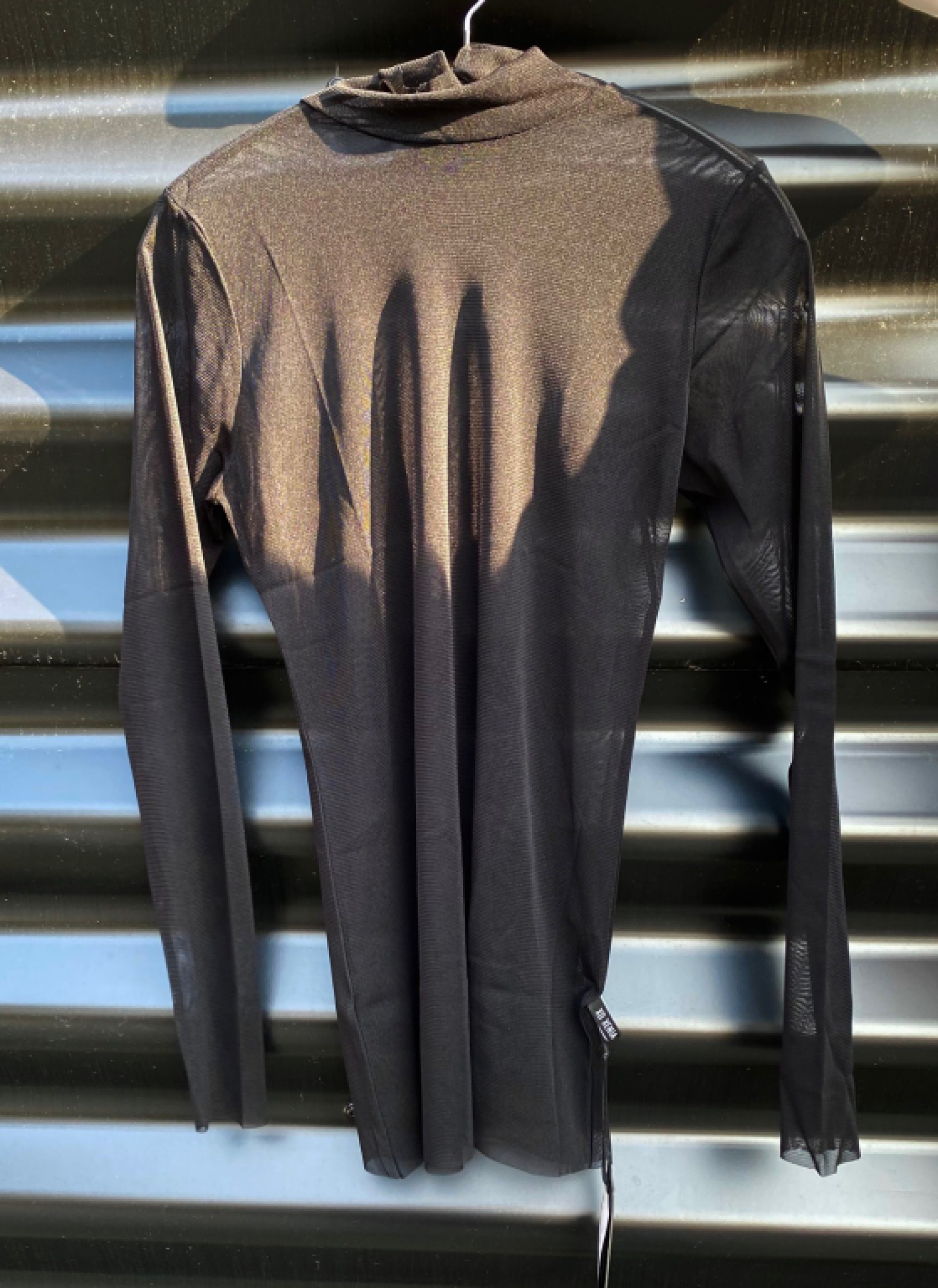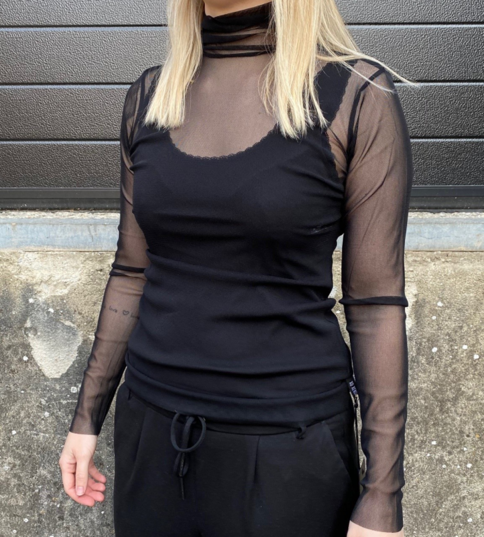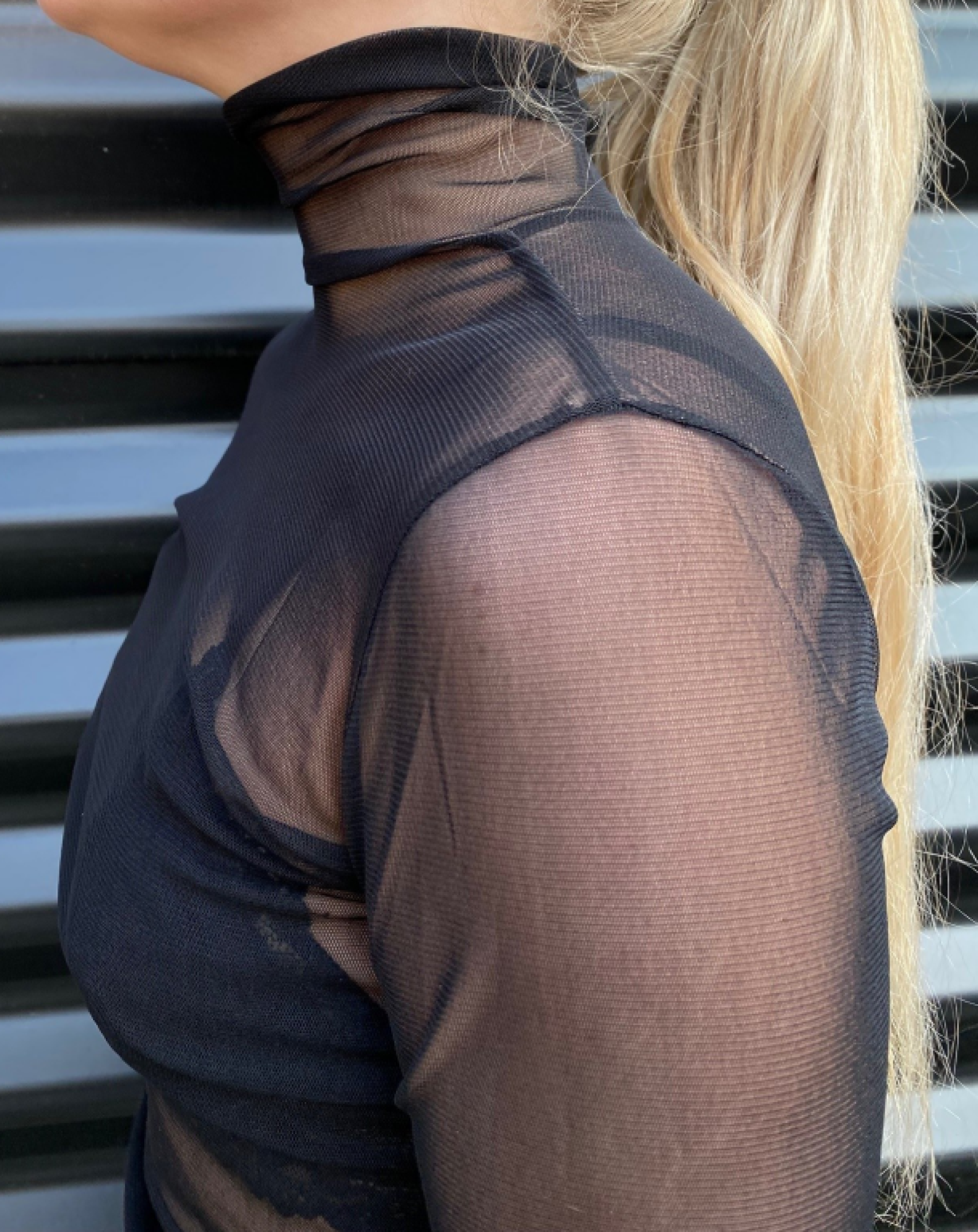 Tight XD blouse in mesh material. This blouse has a high neck and longs sleeves. Style underneath a shirt or a dress.