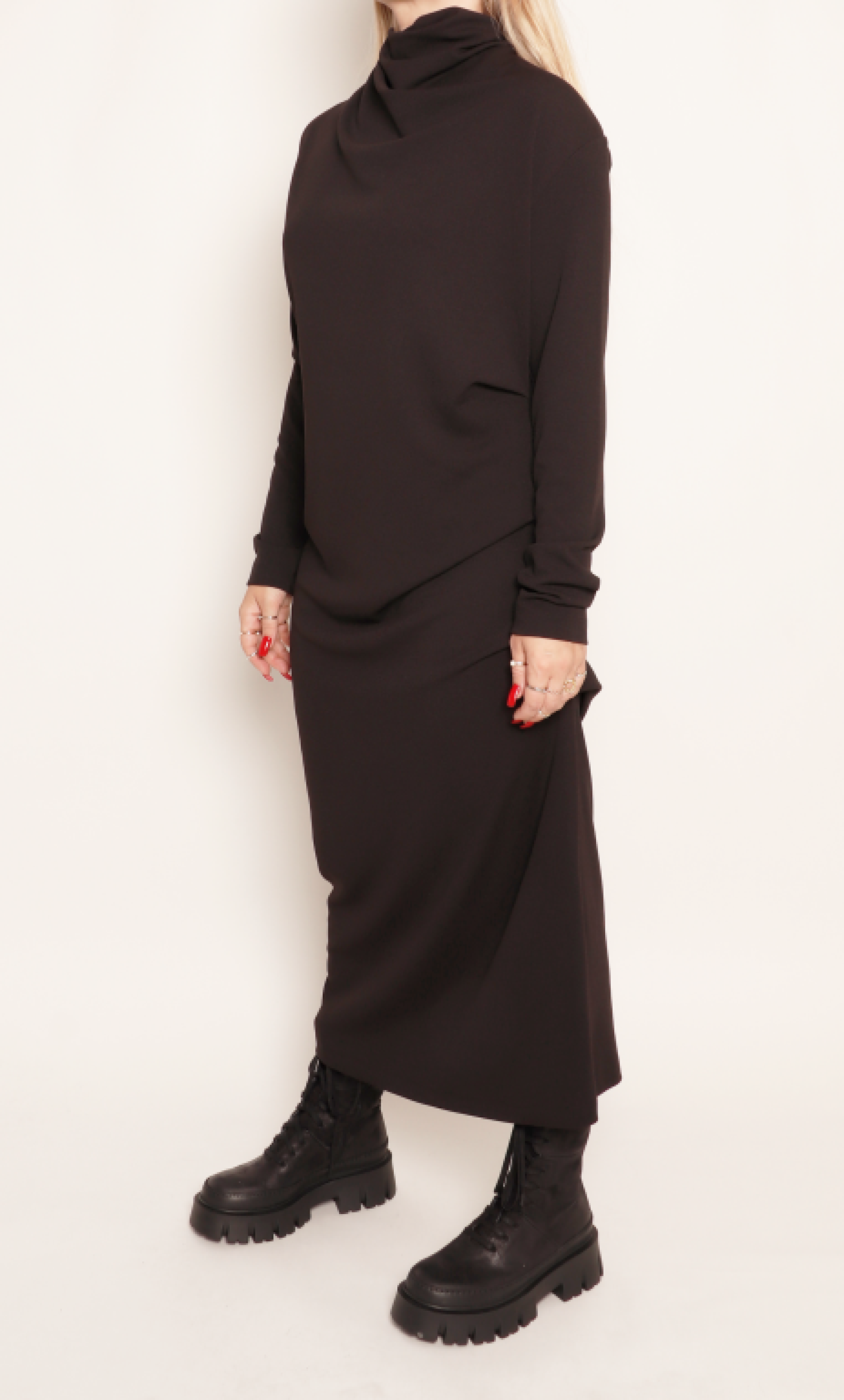 XD kjole med lange ærmer. Kjolen har rynk i den ene side. Bemærk den fine detalje i nakken. Kjolen er normal i størrelsen.Materiale