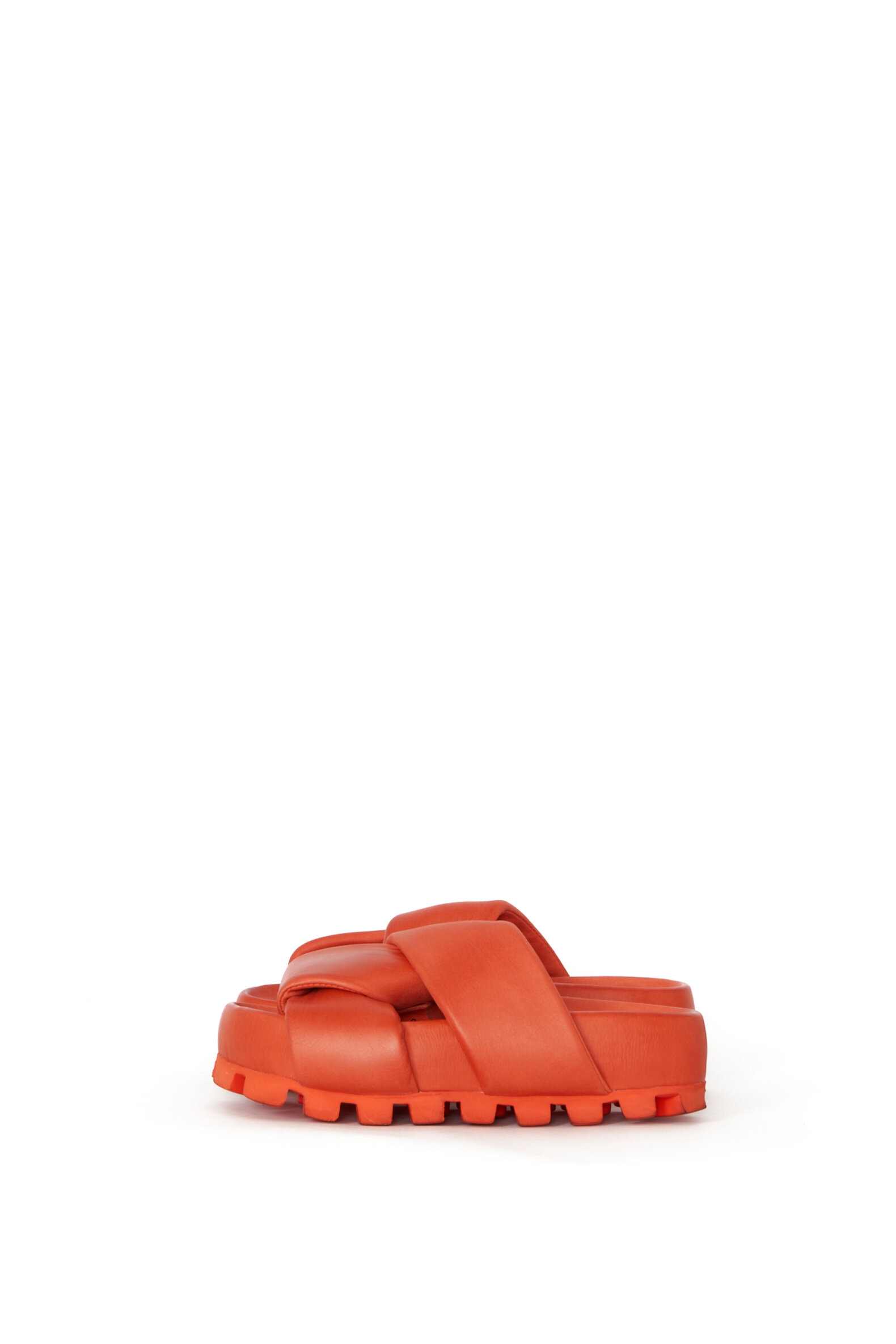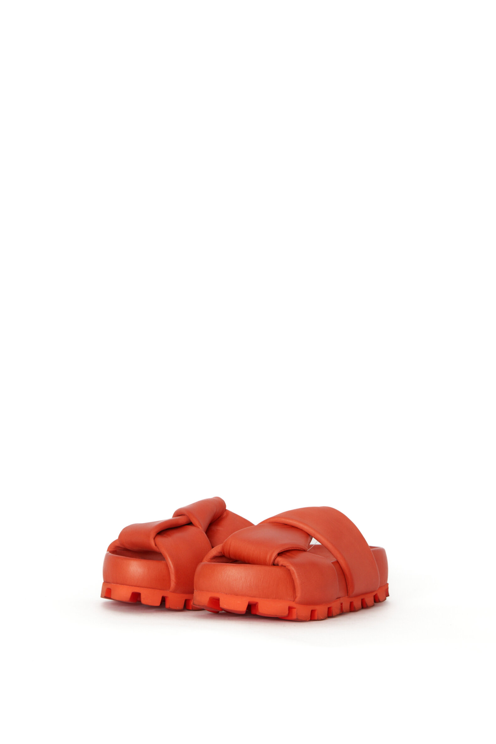Slip on sandal with wide crossed straps. The sandal is made in smooth calfskin lined with pigskin for good breathability. The sole is chunky but surprisingly unheavy. It gives stability and a raw modern look. Perfect as a colorful statement to a summer look or relaxed outfit.