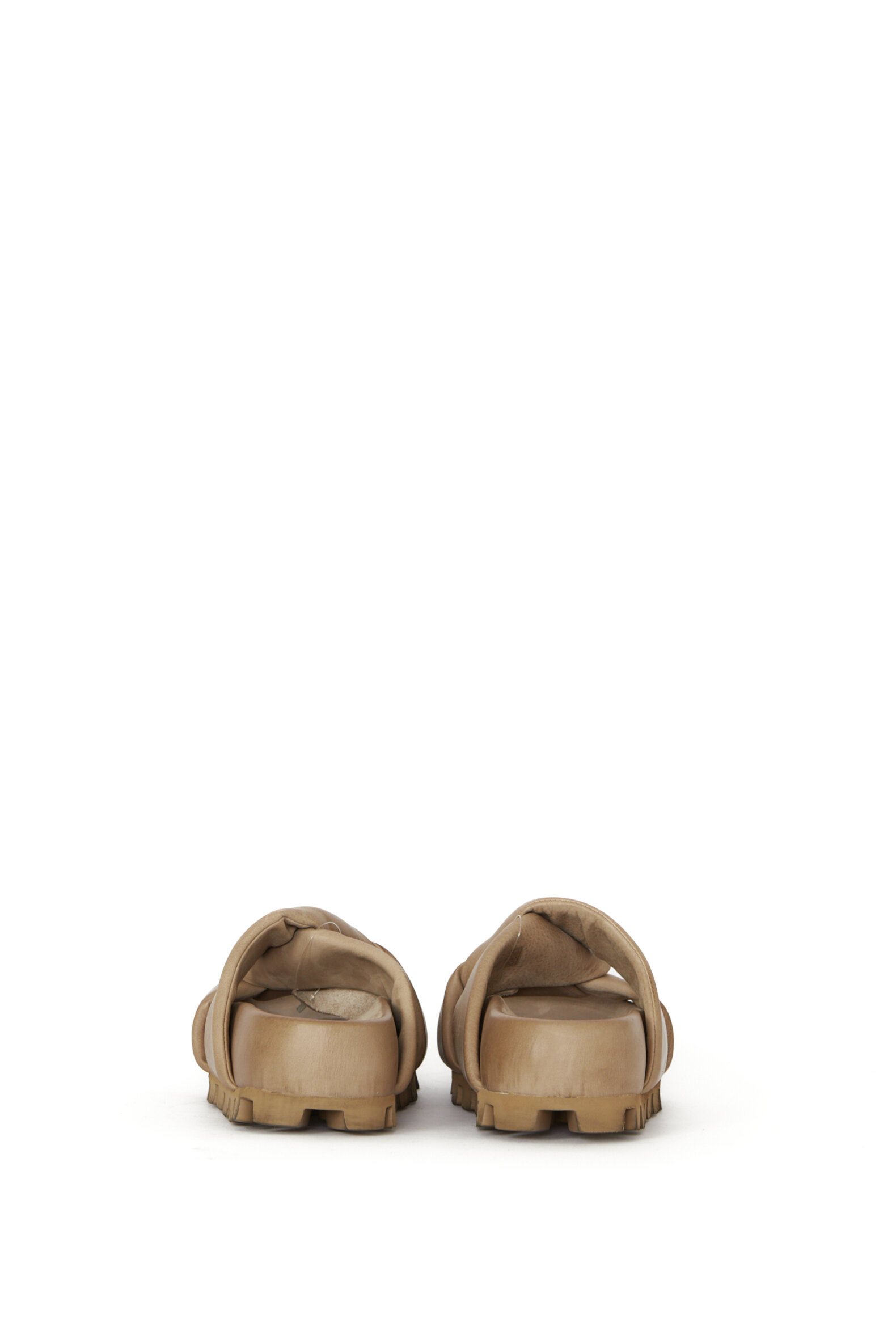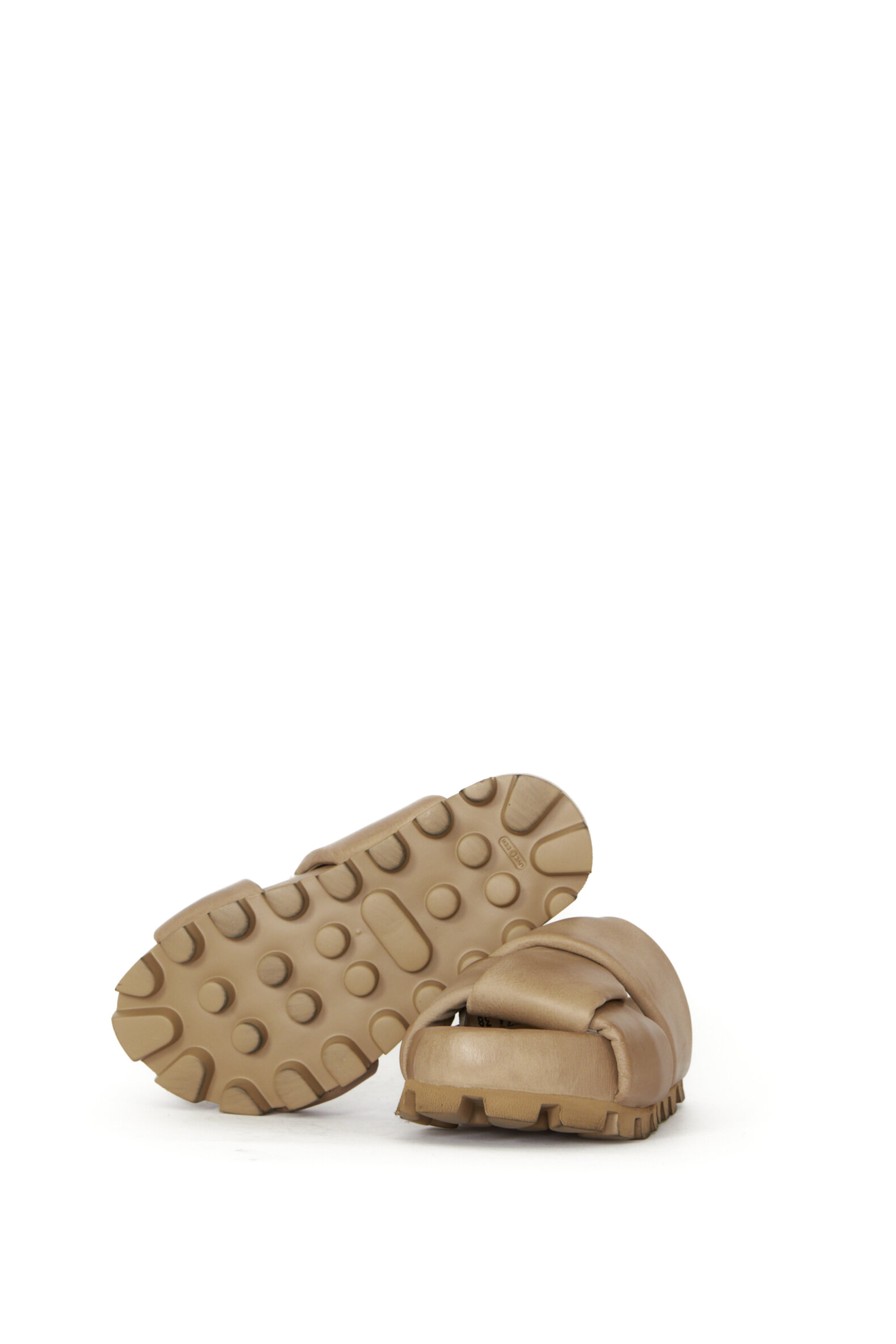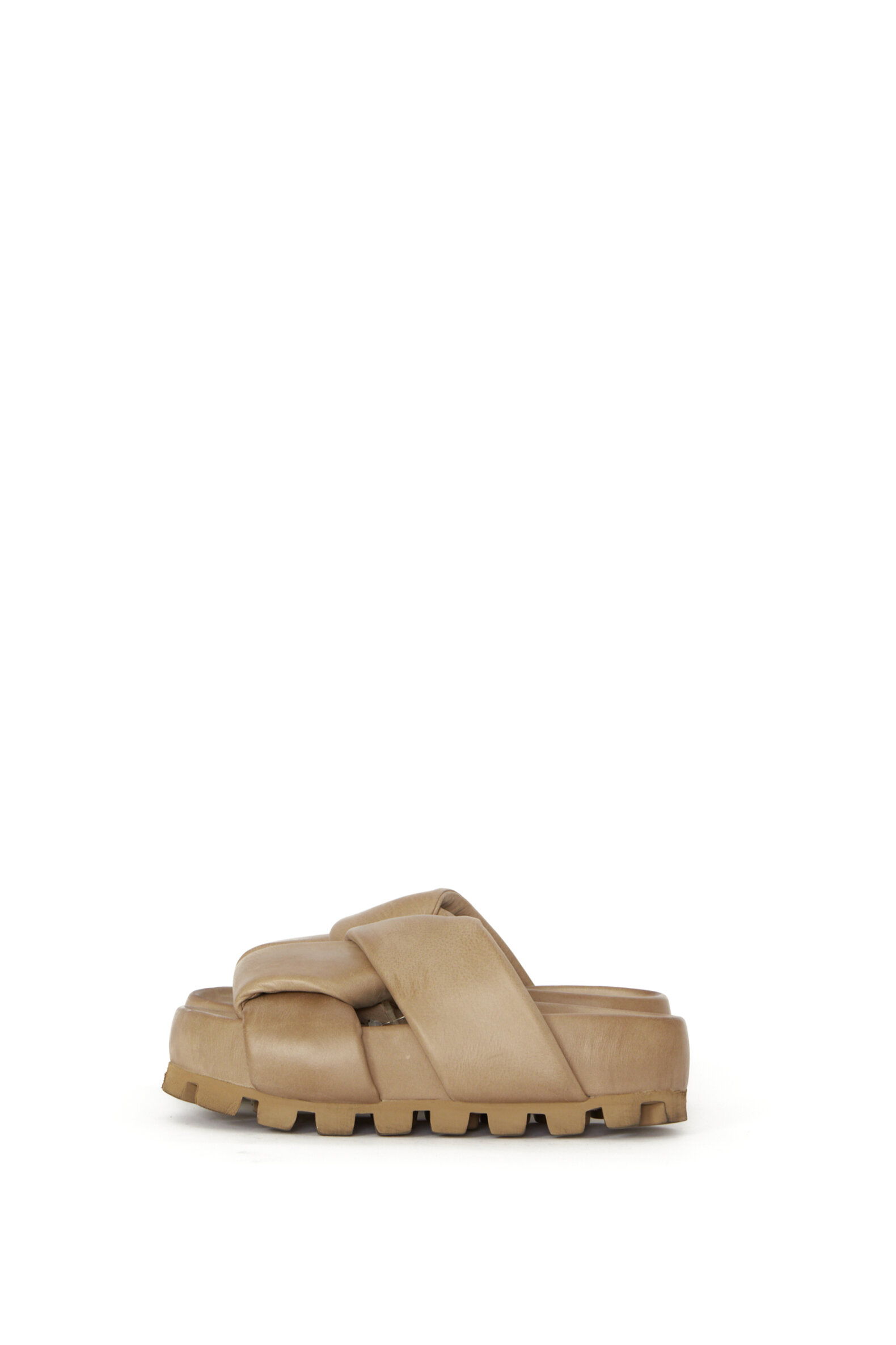 Slip on sandal med brede, krydsede remme. Sandalen er lavet i glat lysebrunt kalveskind og foret med svineskind for god åndbarhed. Sålen er kraftig med et markant mønster, men samtidig overraskende let. Den giver både stabilitet og et råt, moderne look. Fungerer perfekt som et statement i et sommerligt eller afslappet outfit.