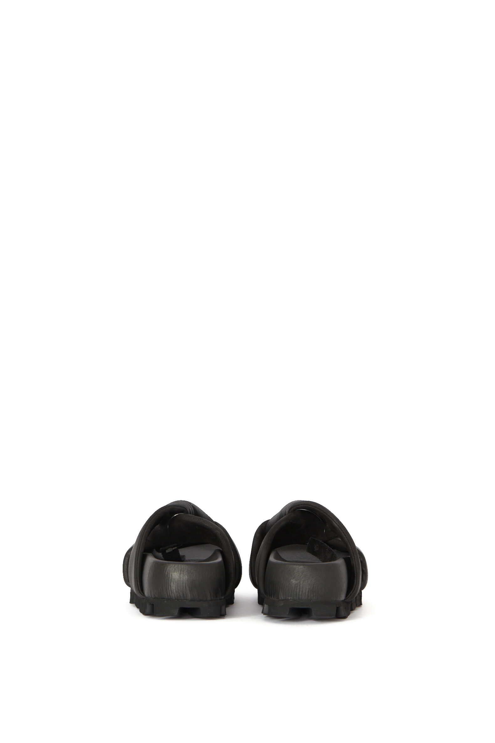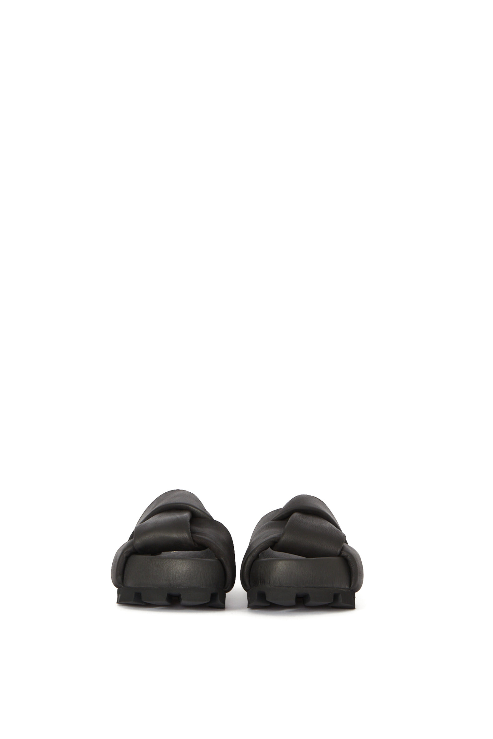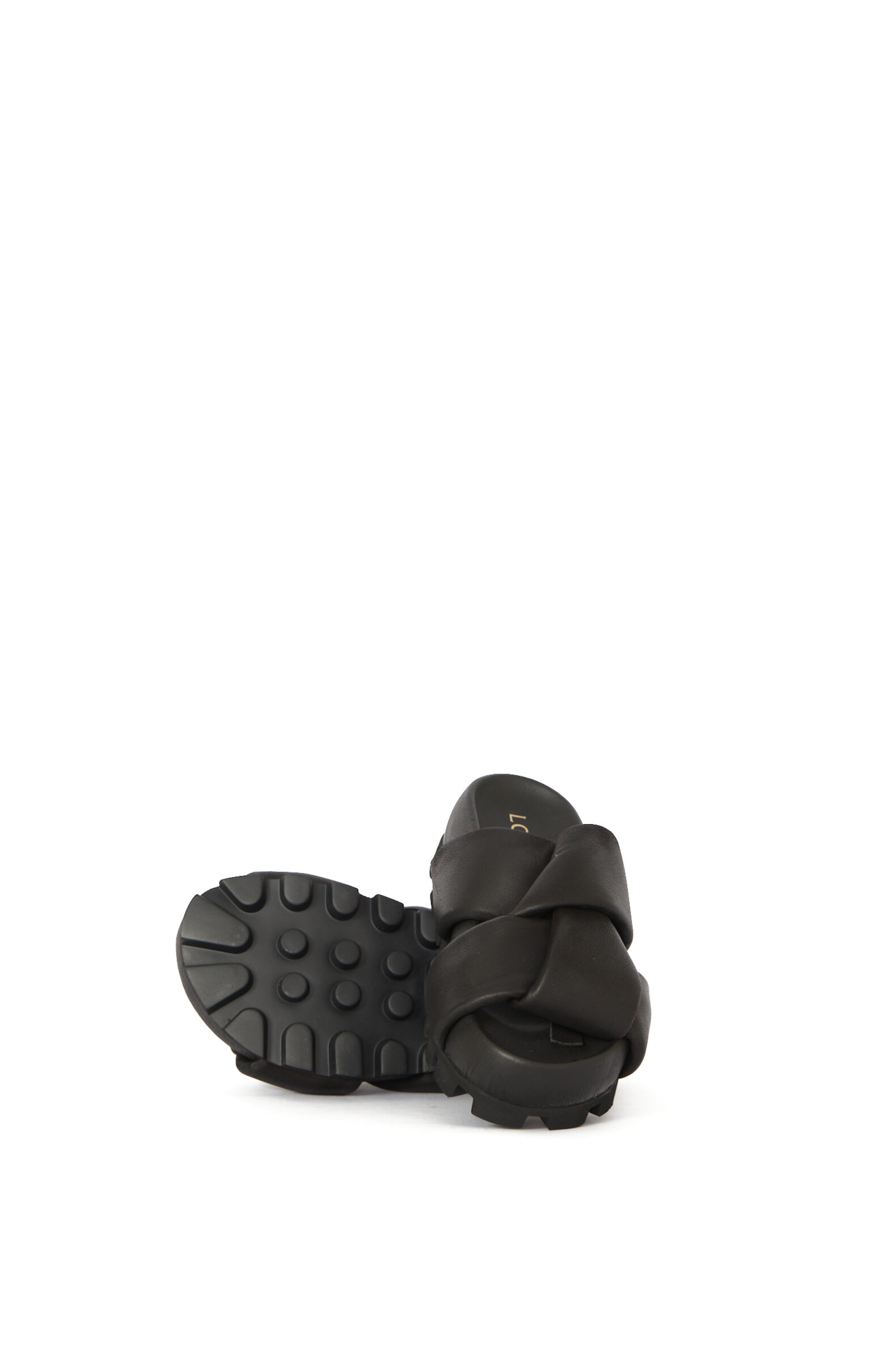 Slip on sandal med brede, krydsede remme. Sandalen er lavet i glat sort kalveskind og foret med svineskind for god åndbarhed. Sålen er kraftig med et markant mønster, men samtidig overraskende let. Den giver både stabilitet og et råt, moderne look. Fungerer perfekt som et statement i et sommerligt eller afslappet outfit.