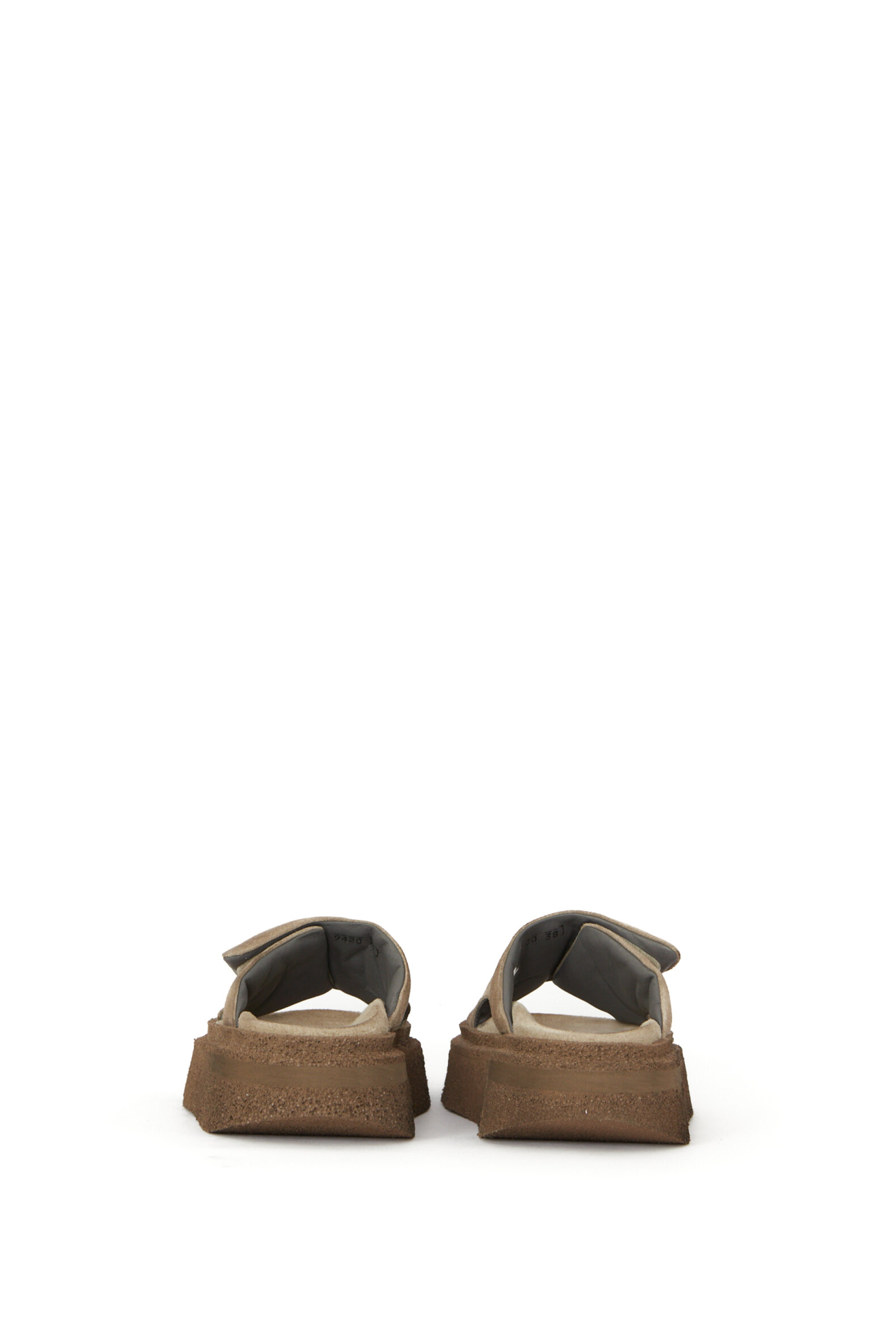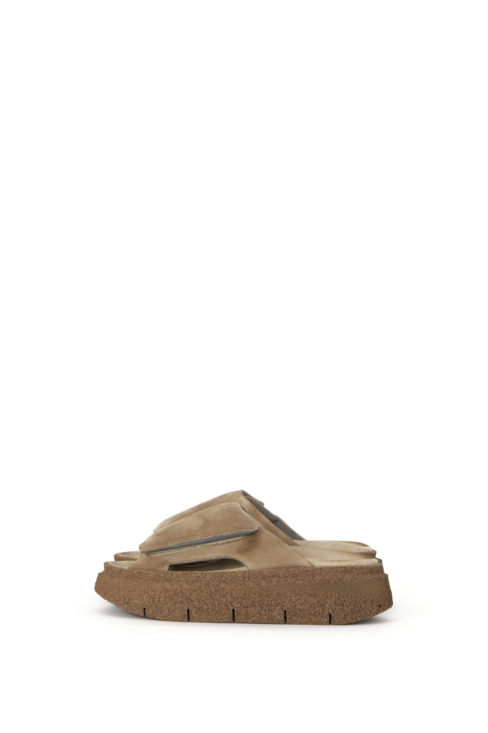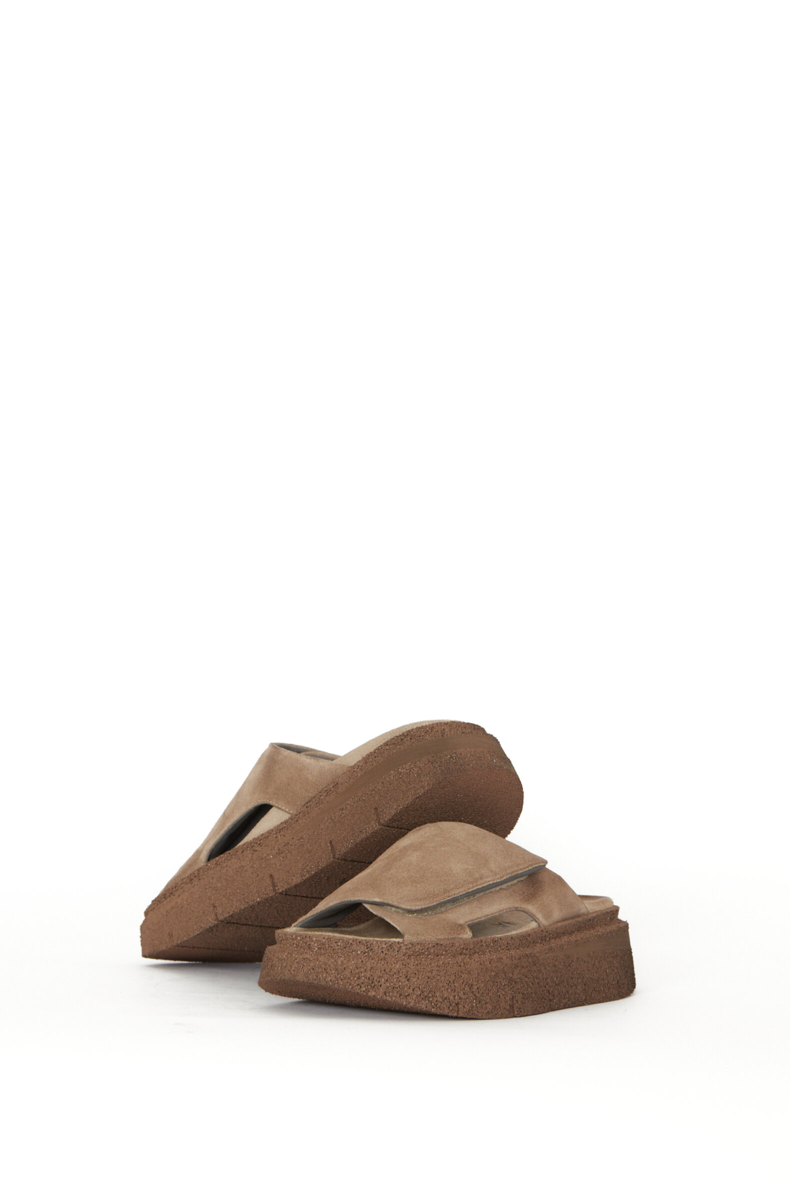 Sandalen er lavet i ruskind af kalveskind foret med svineskind. Letvægtssålen er lavet i blandingsmaterialer af syntetisk gummi.