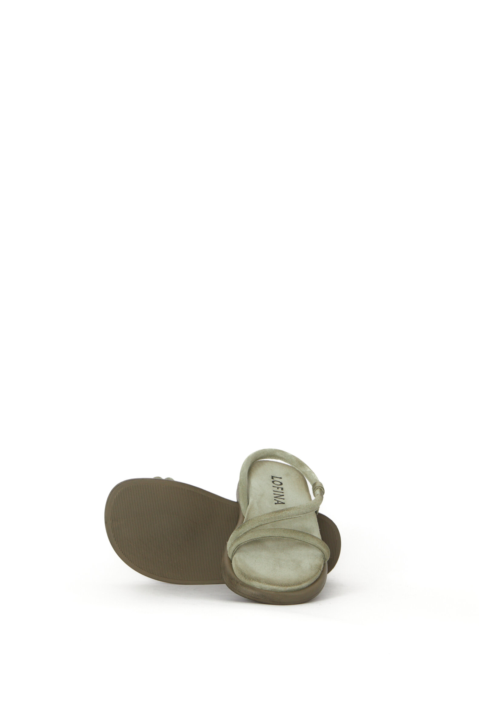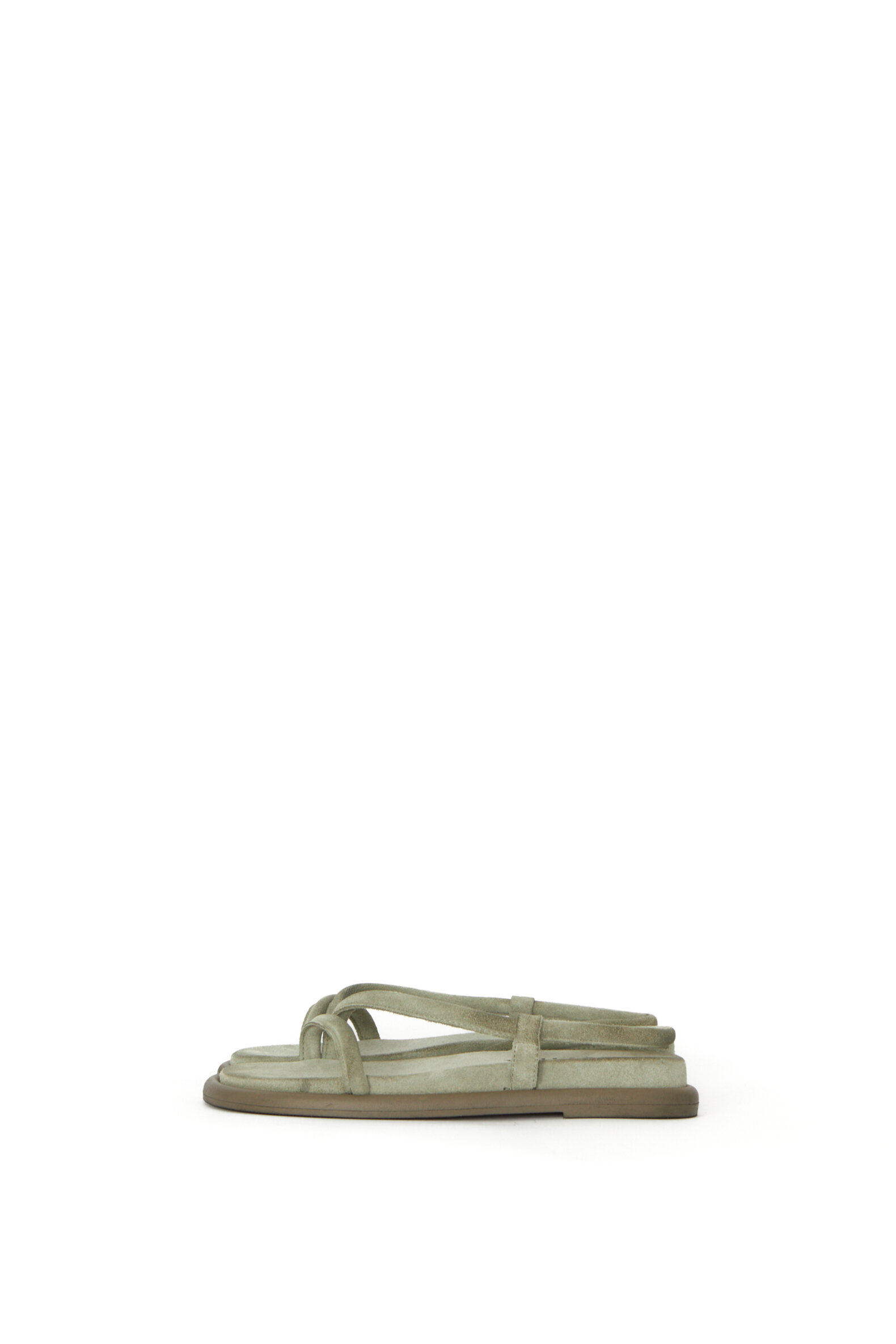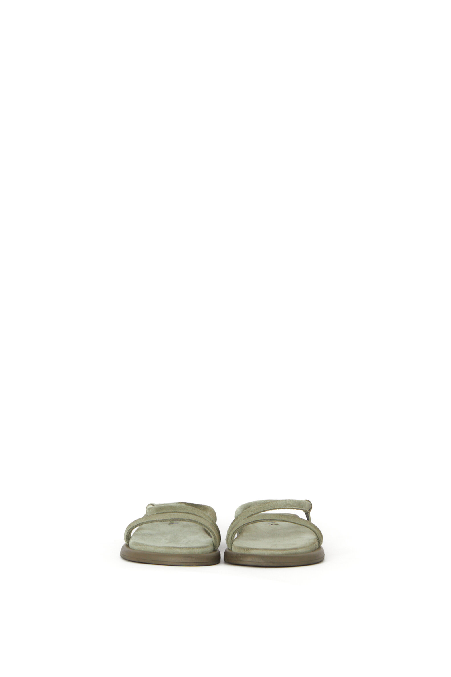 Elegant sandal designet med et minimalistisk og moderne udtryk, hvor de fine, runde læderremme giver et let og feminint look. Sandalen er håndlavet i blødt ruskind g den tynde, elegante konstruktion gør den perfekt til varme sommerdage. Remmene er placeret, så de både giver støtte og en smuk visuel balance. Den flade sål er behagelig at gå på og giver et rent udtryk, der passer til både afslappet hverdagsbrug og mere stilfulde sommeroutfits.