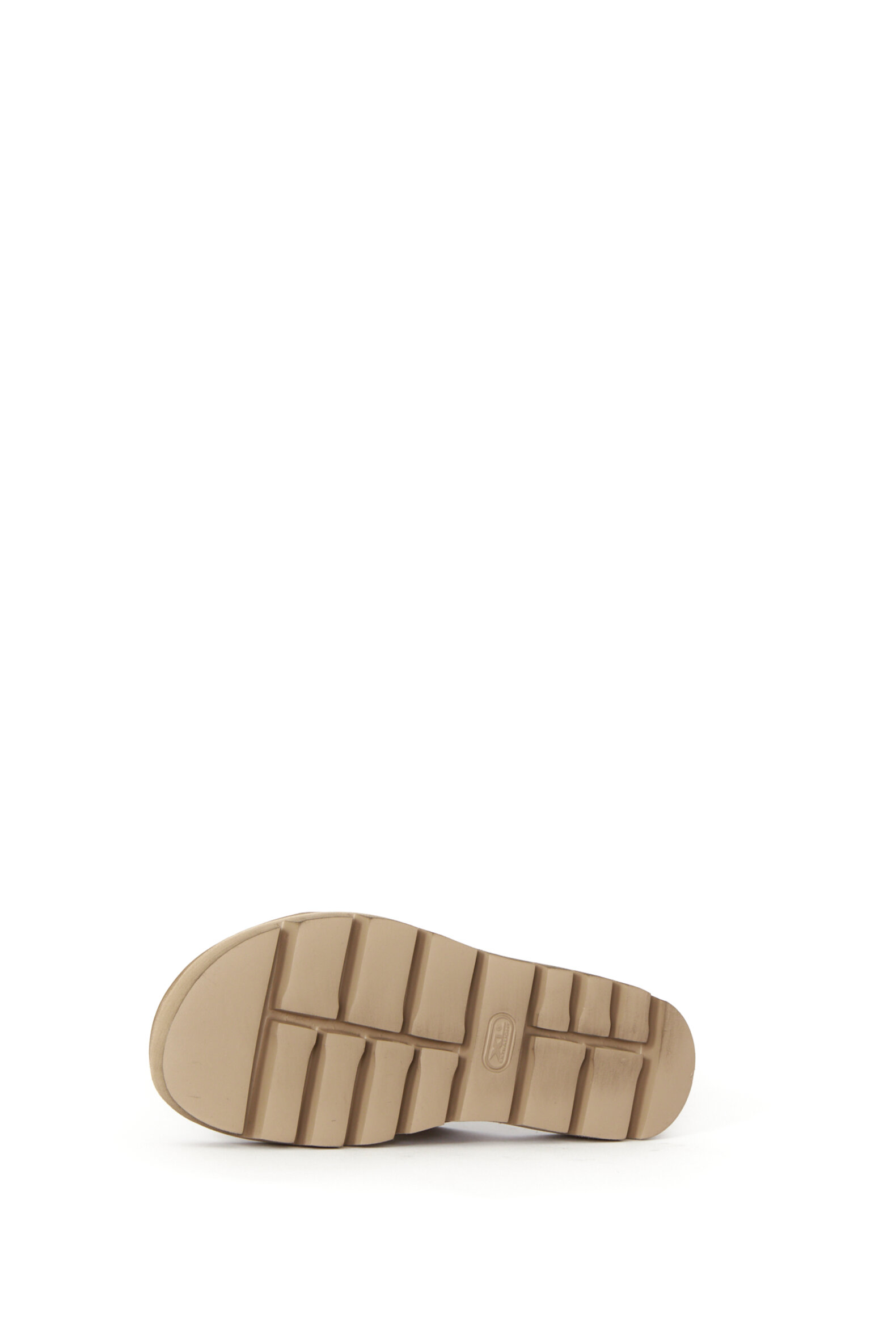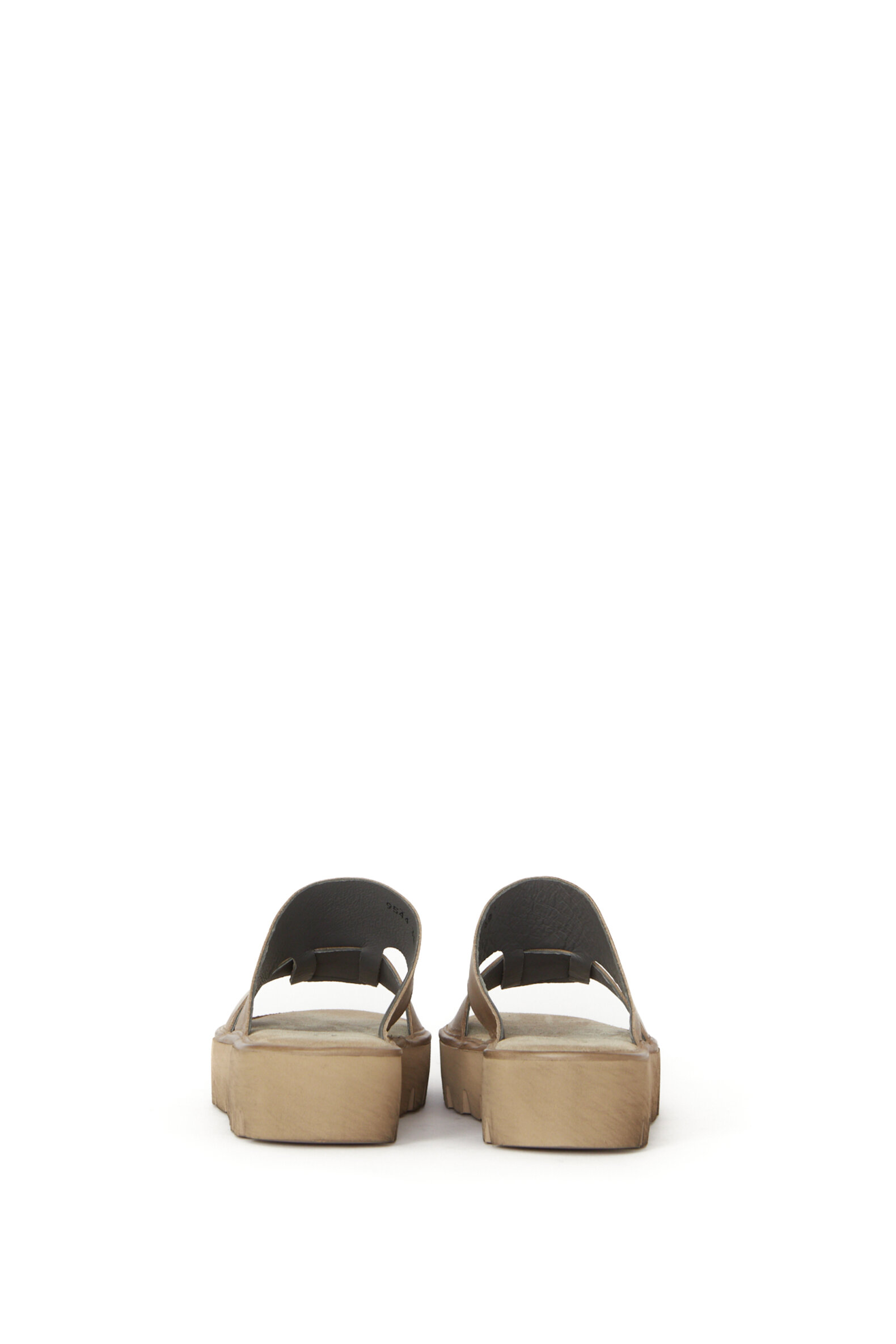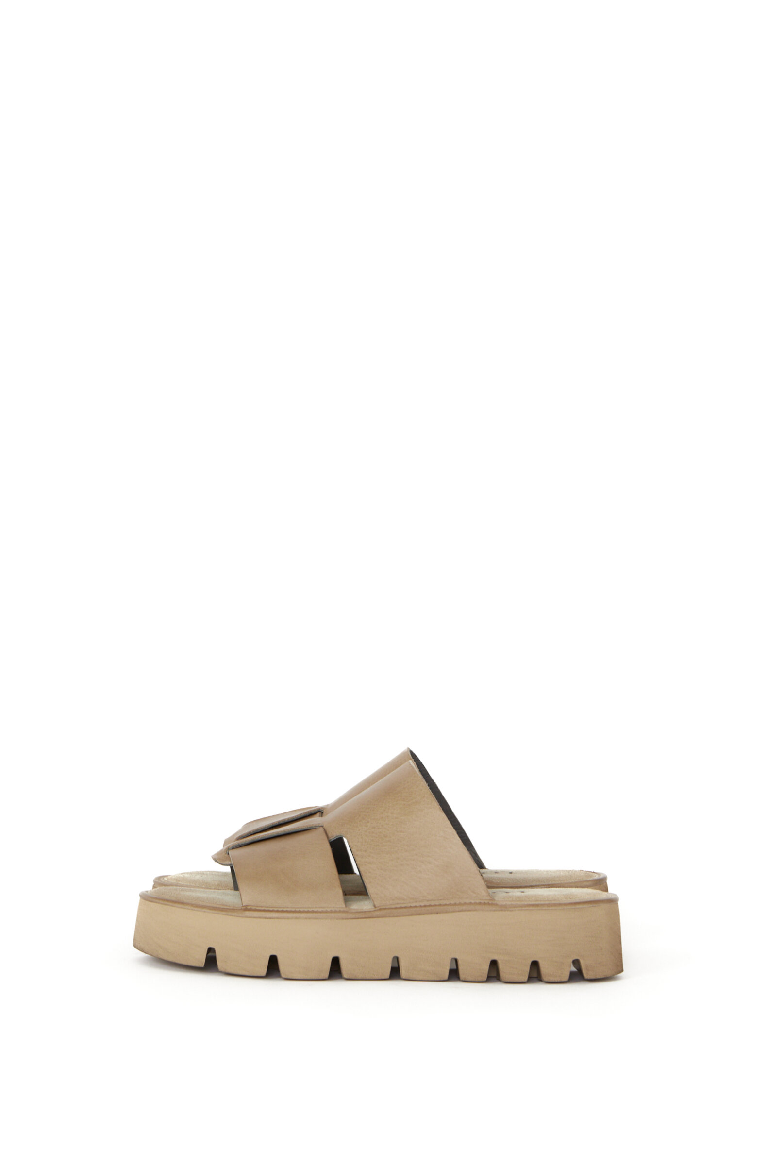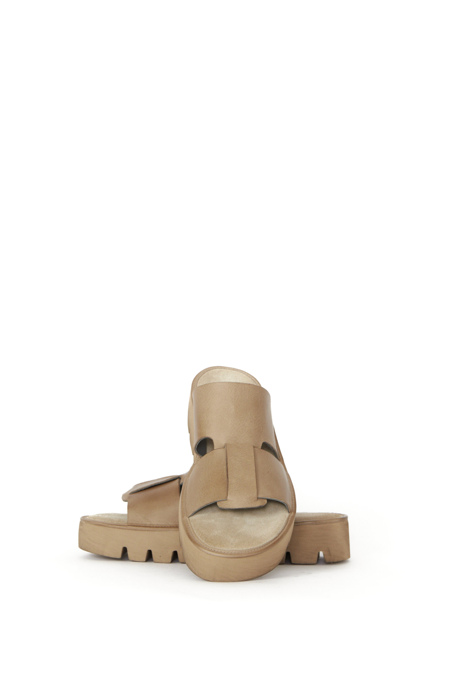 Håndlavet sandal i blødt, eksklusivt lysebrunt kalveskind og foret med svineskind, som giver en behagelig pasform omkring foden samt god åndbarhed. Det brede, asymmetriske rem-design giver sandalen et moderne, minimalistisk udtryk. Den lette, faste sål har et elegant udtryk, som samtidig sikrer god komfort pga. det bløde ruskind indeni. En tidløs sandal der forener håndværk, kvalitet og funktionalitet. Denne sandal er lidt stor i størrelsen.