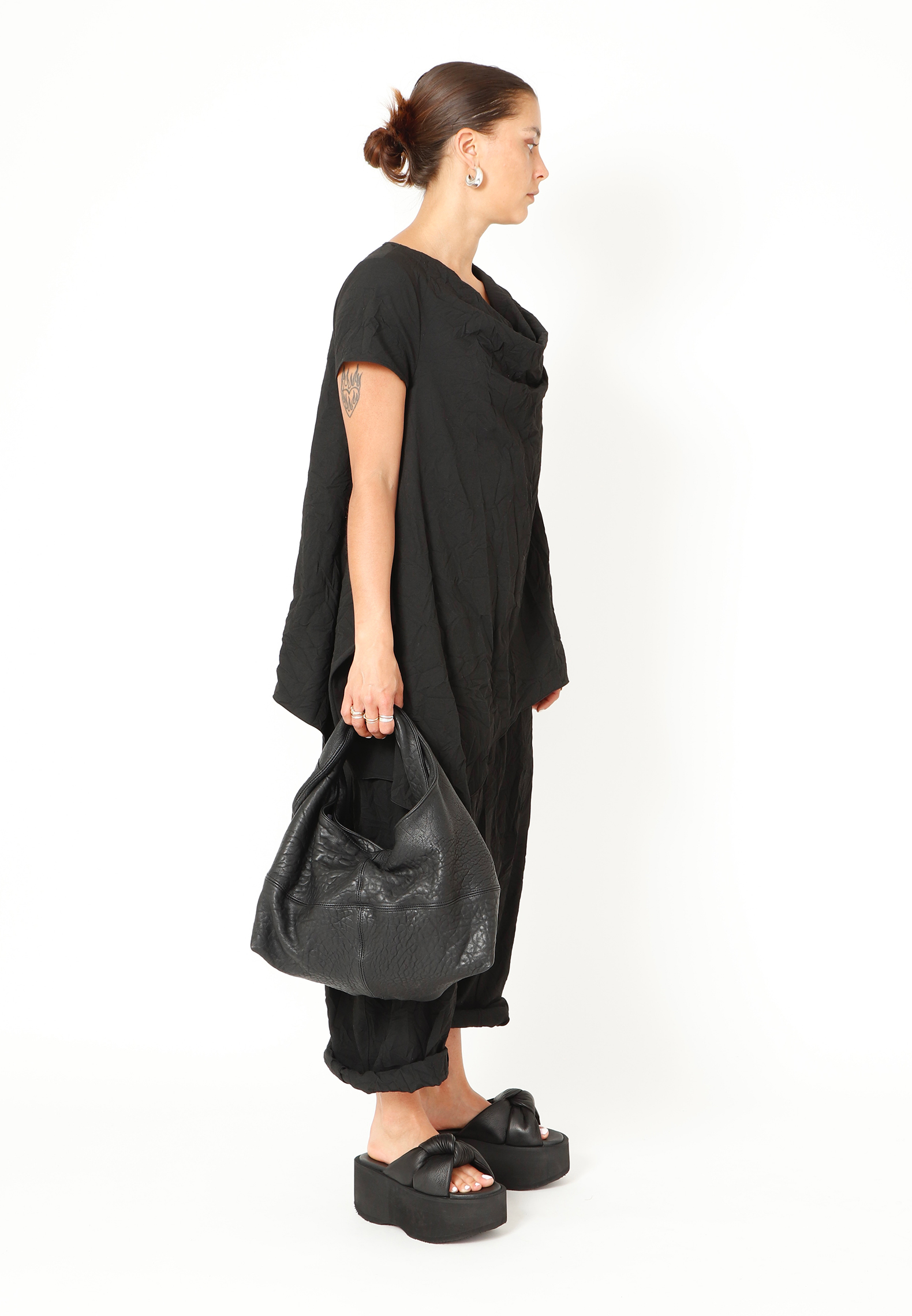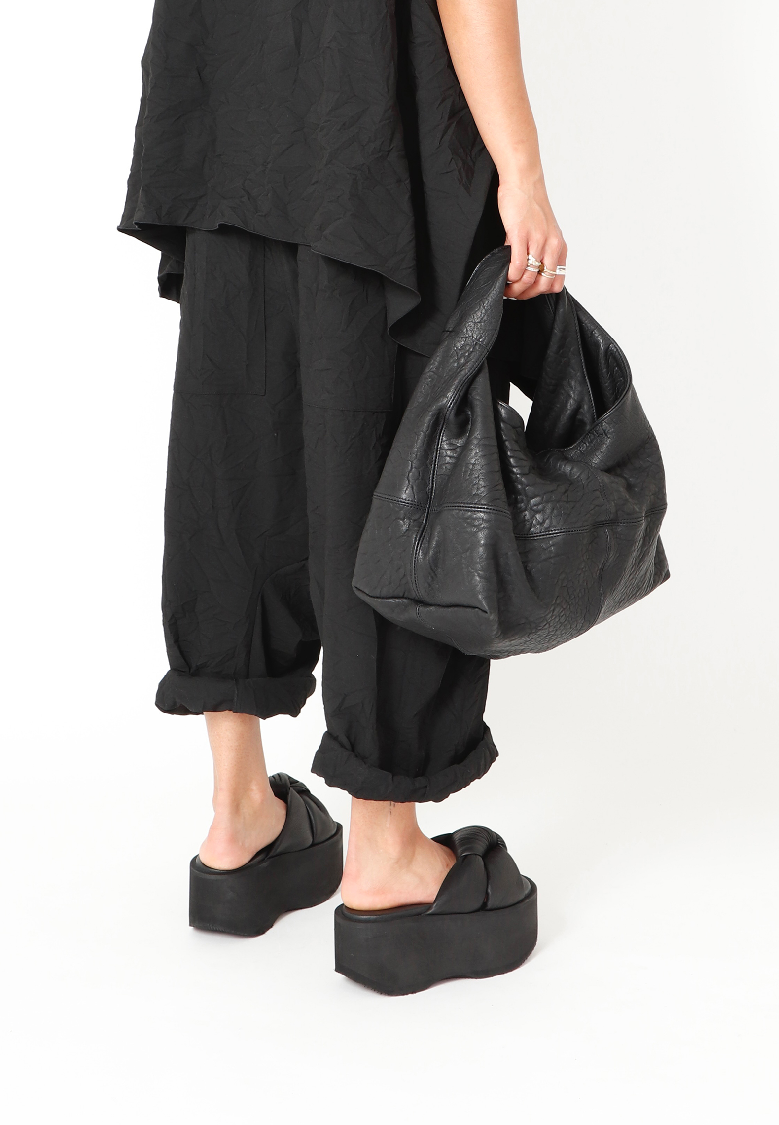 Hånd-/skuldertaske fra Sort Aarhus i lækkert lammeskind med struktur. Tasken har logo i den ene side og knaplukning. Indeni er der to mindre åbne rum samt to større rum med lynlåslukning.