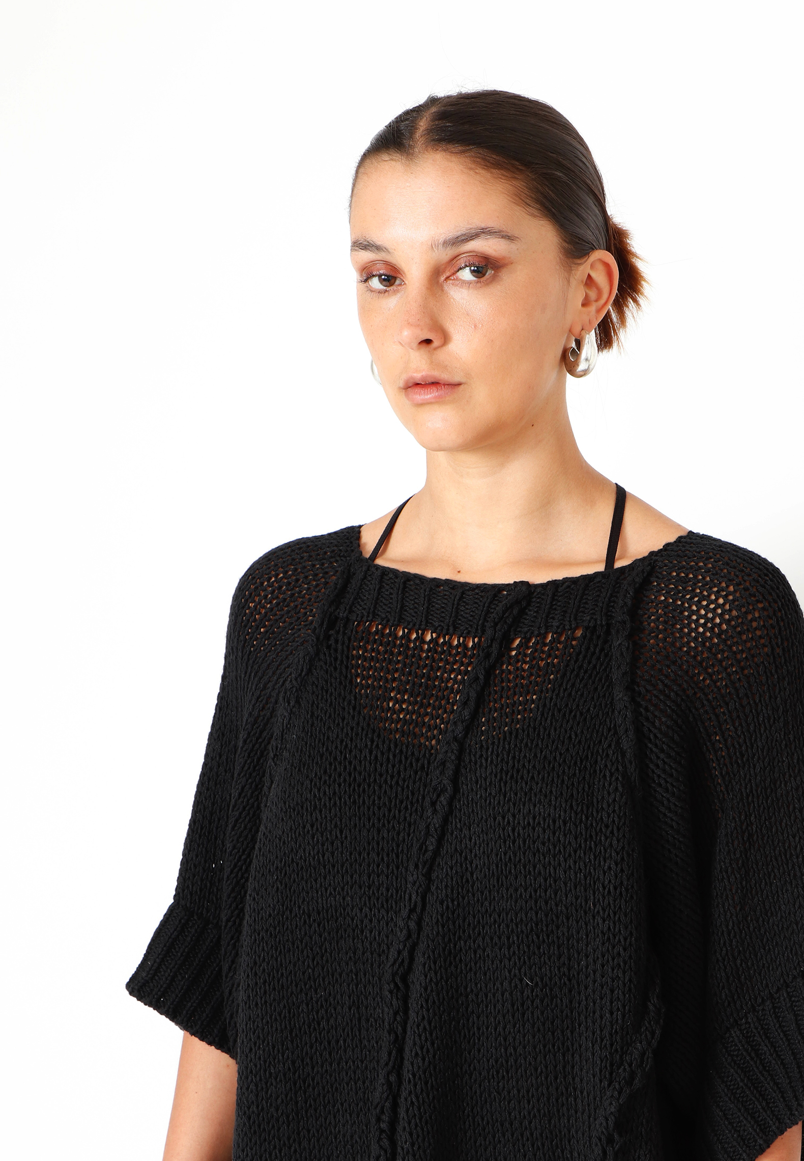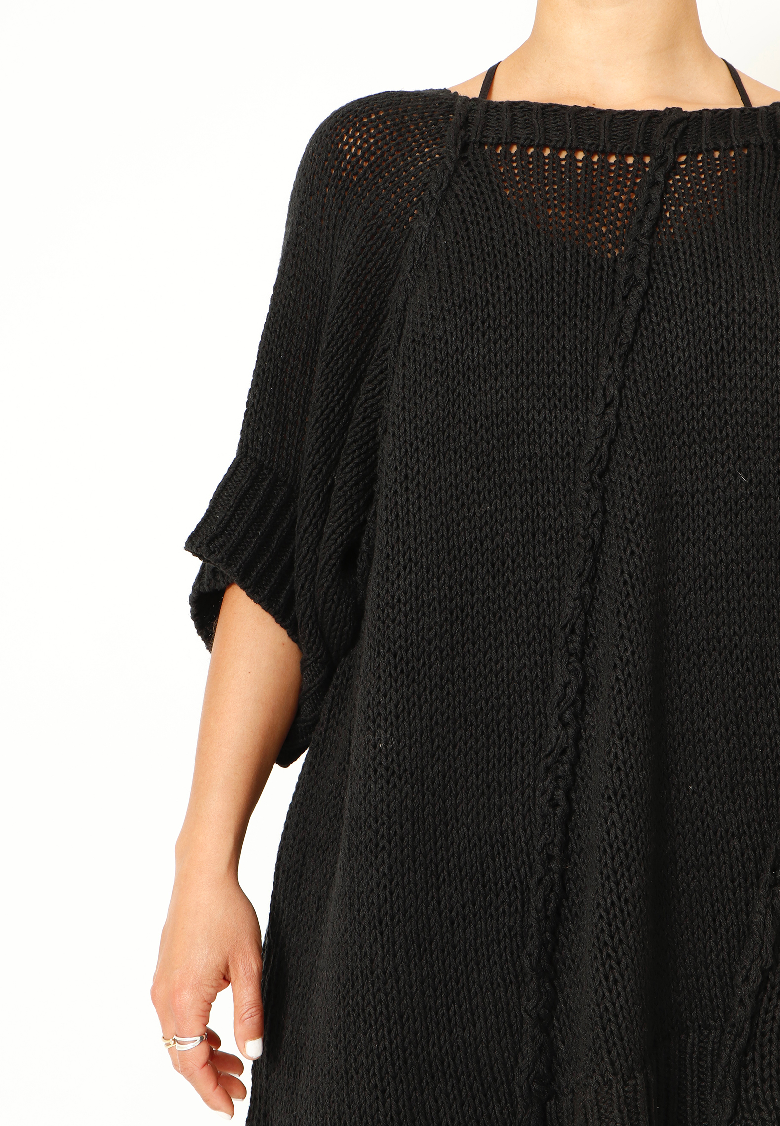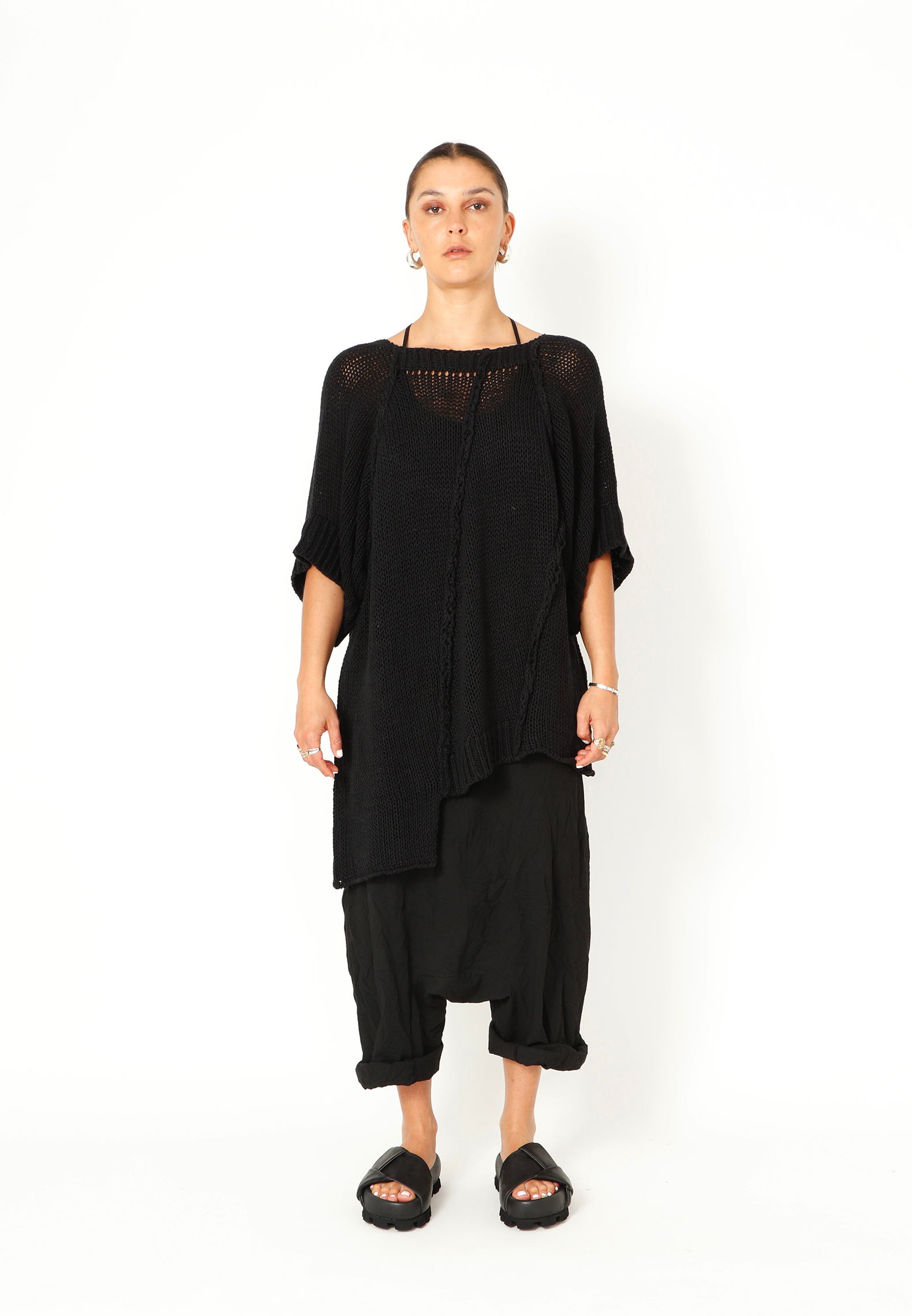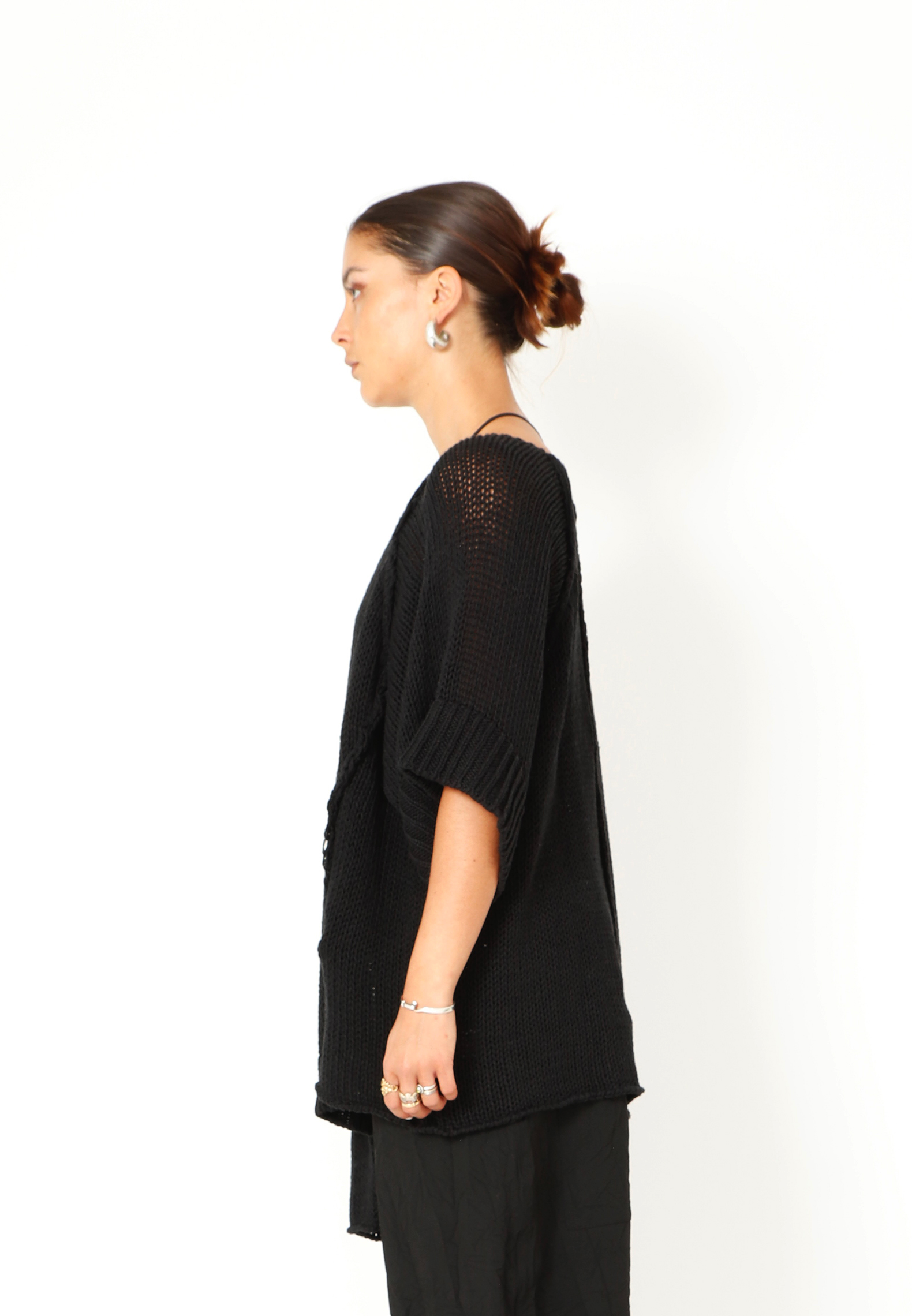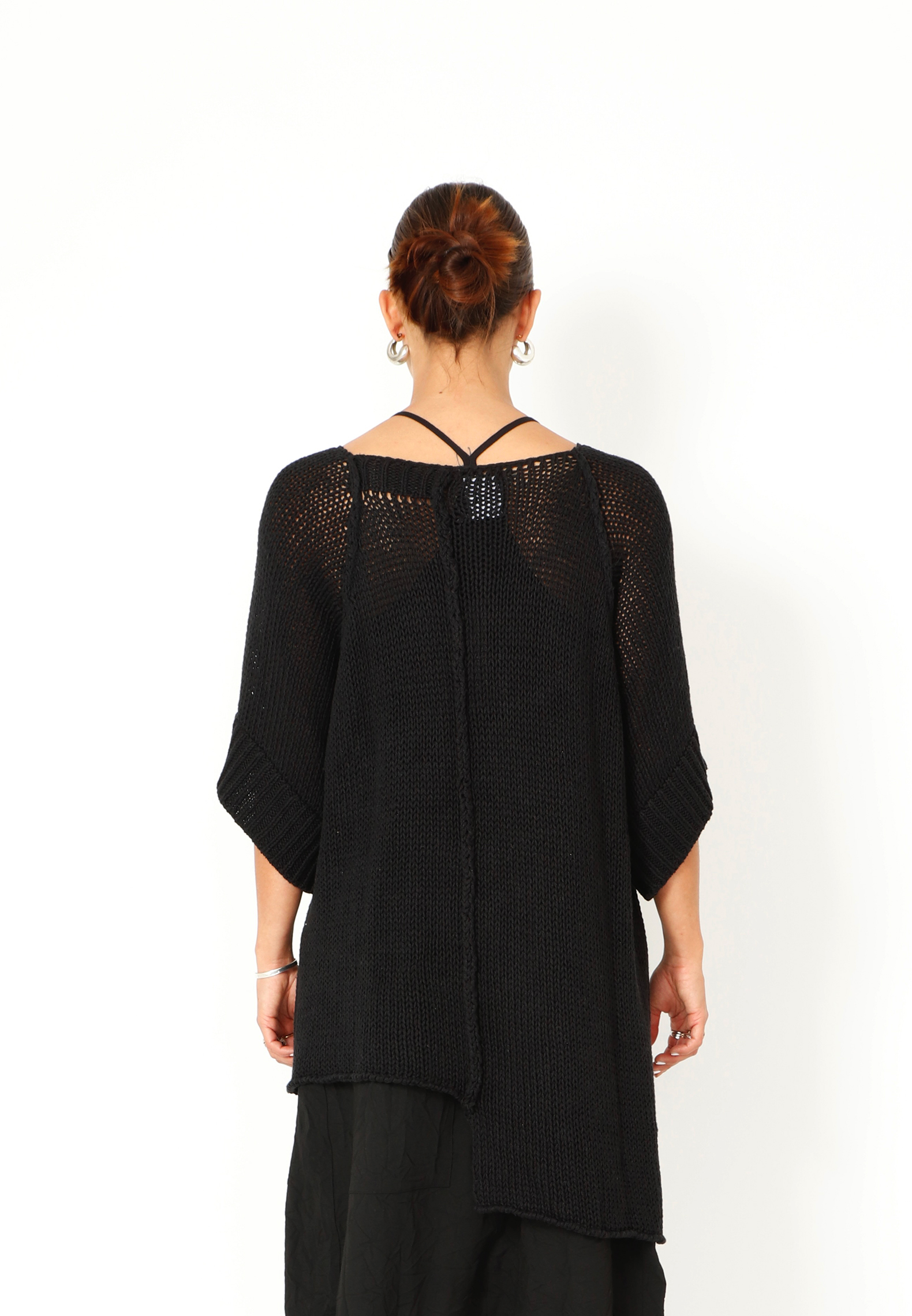 Oversized løst-strikket bluse i en lækker blød blanding af bomuld og hør. Blusen har brede ribkanter ved ærmerne og et asymmetrisk snit forneden. Findes i flere farver.