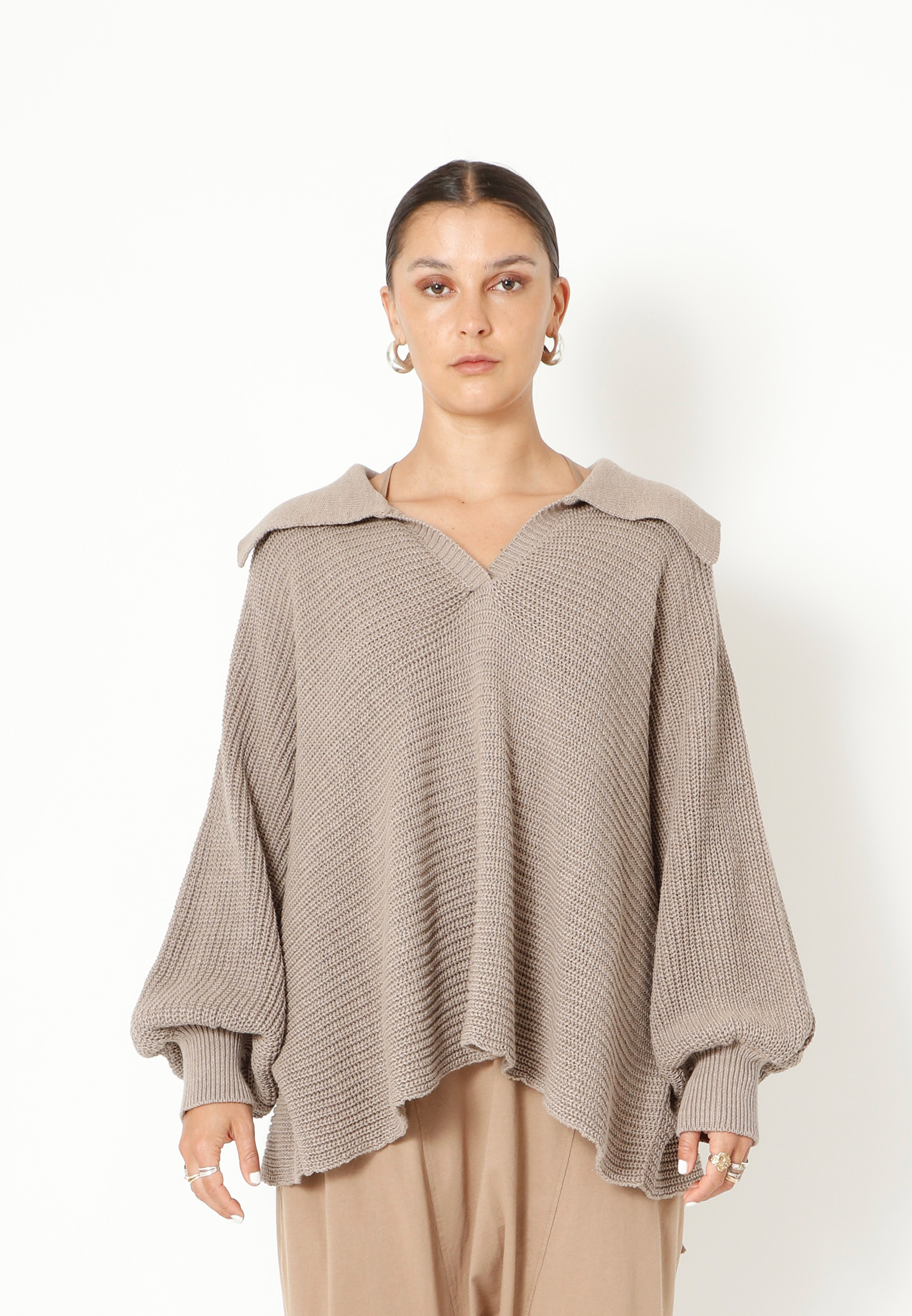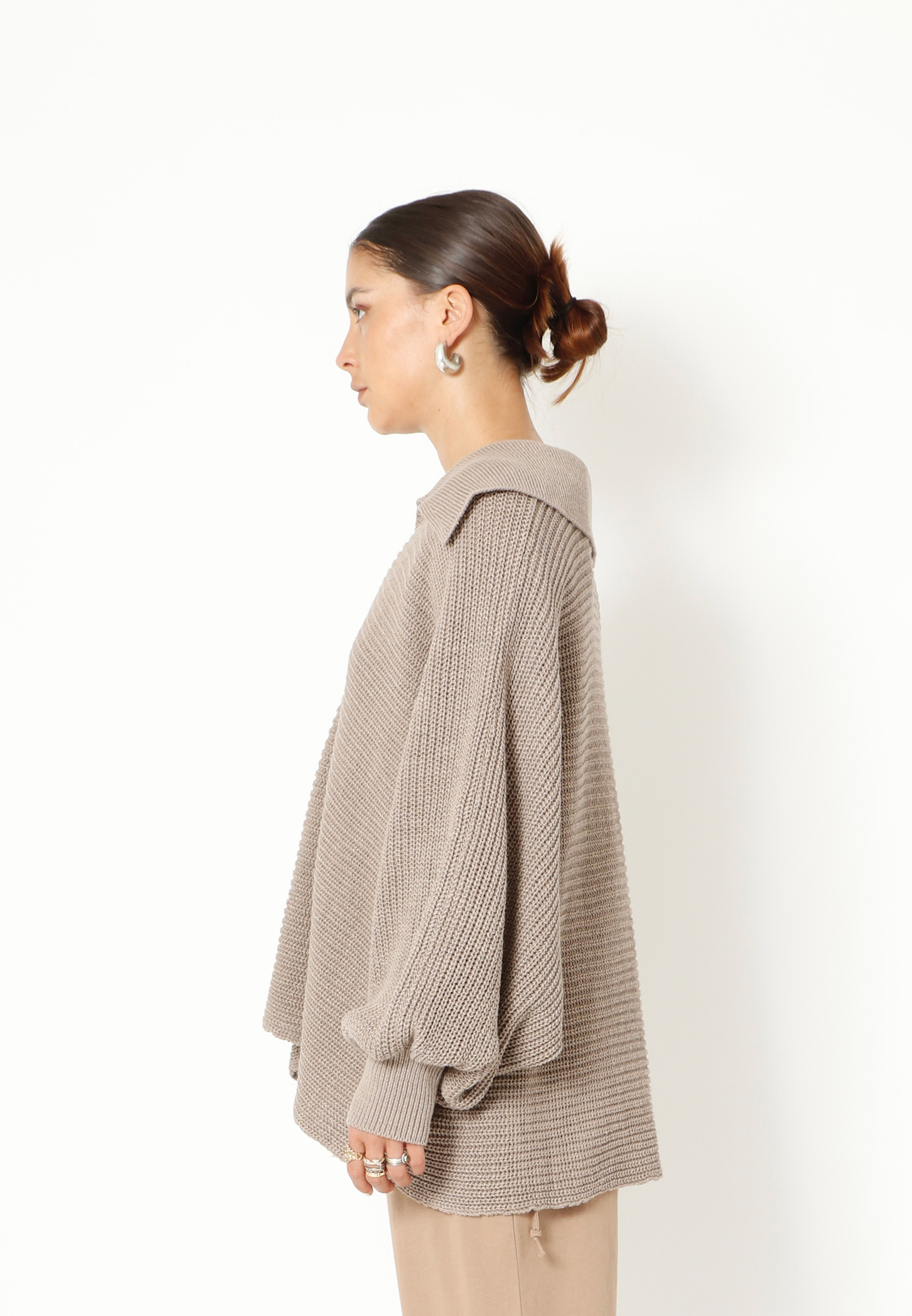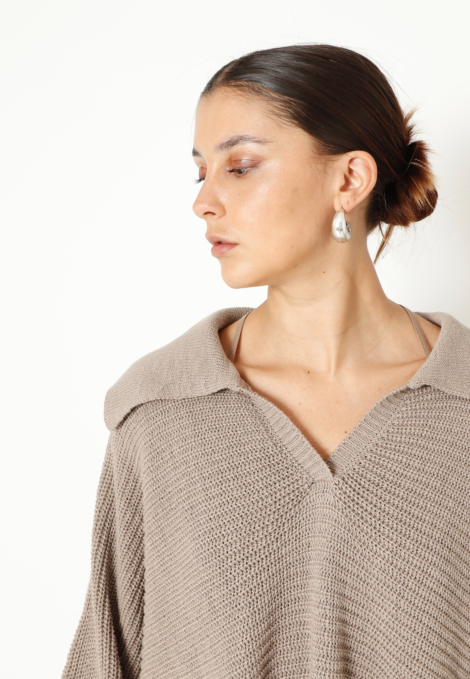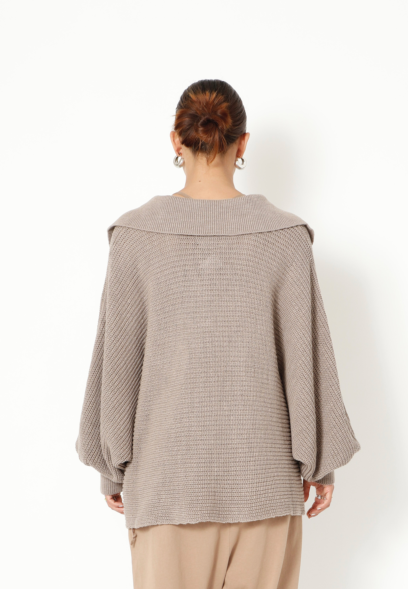 Oversized collared knit sweater with bat-sleeves and a wide rib by the hand. Made in a nice soft mix of cotton and linen. Comes in more colors.