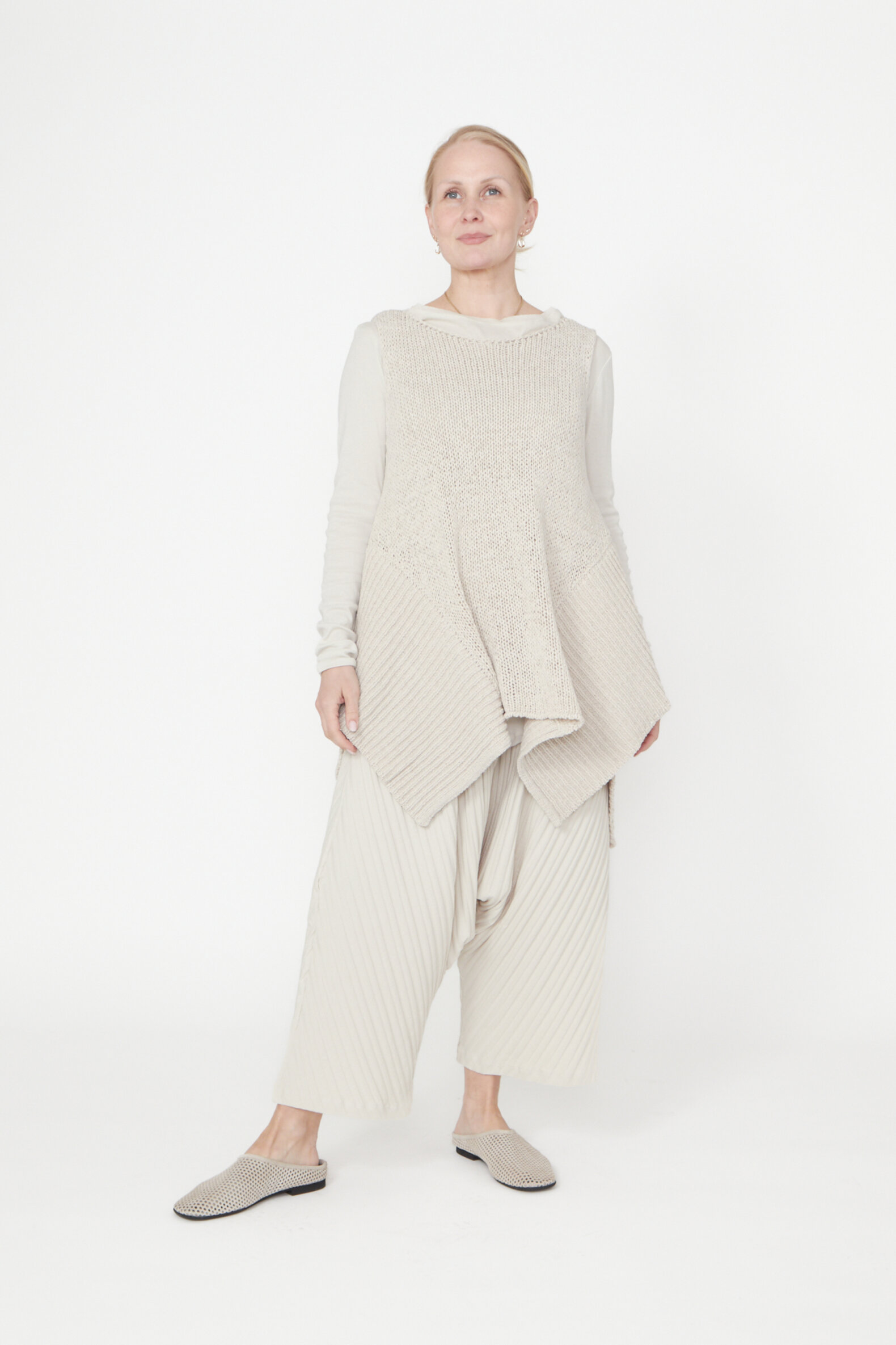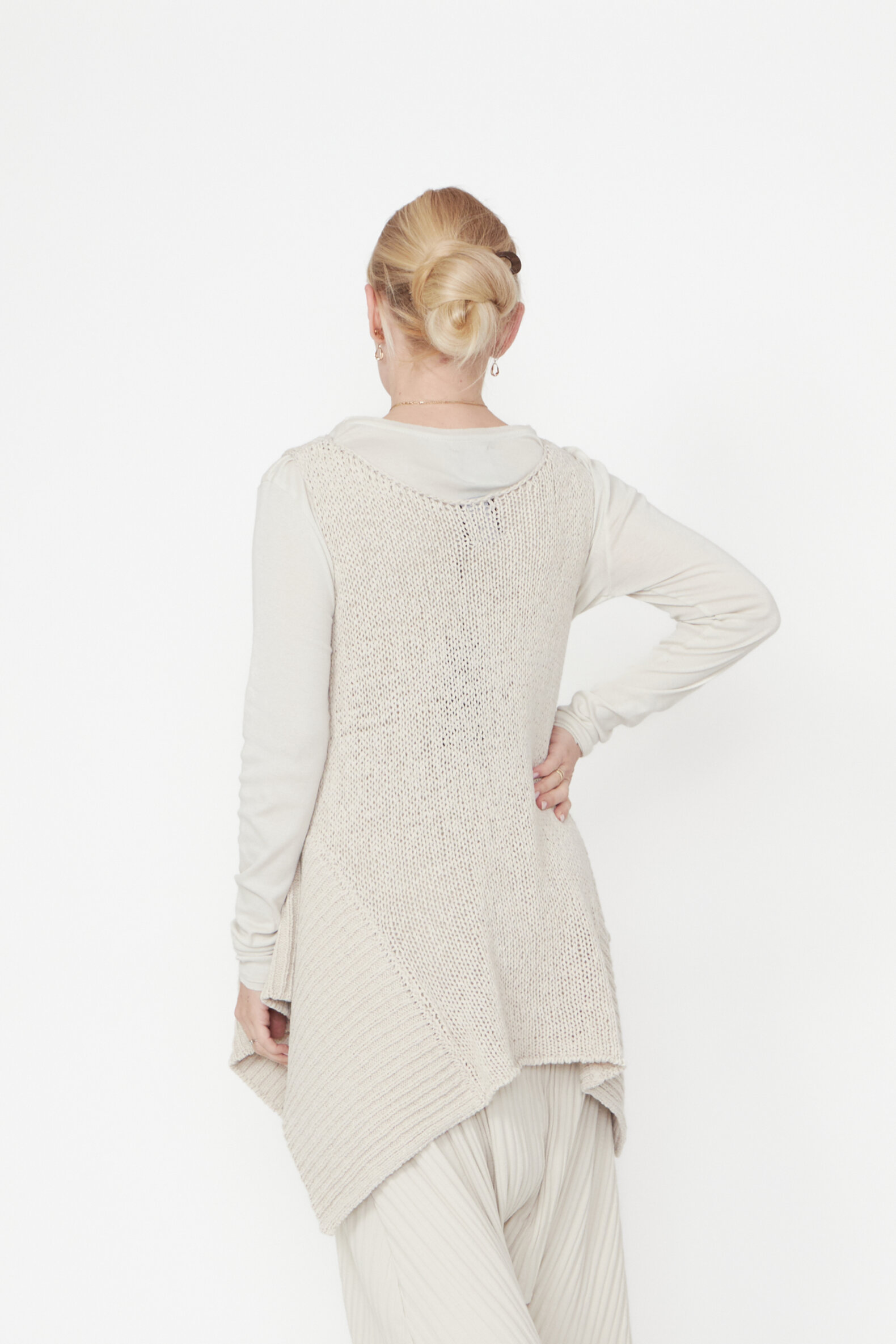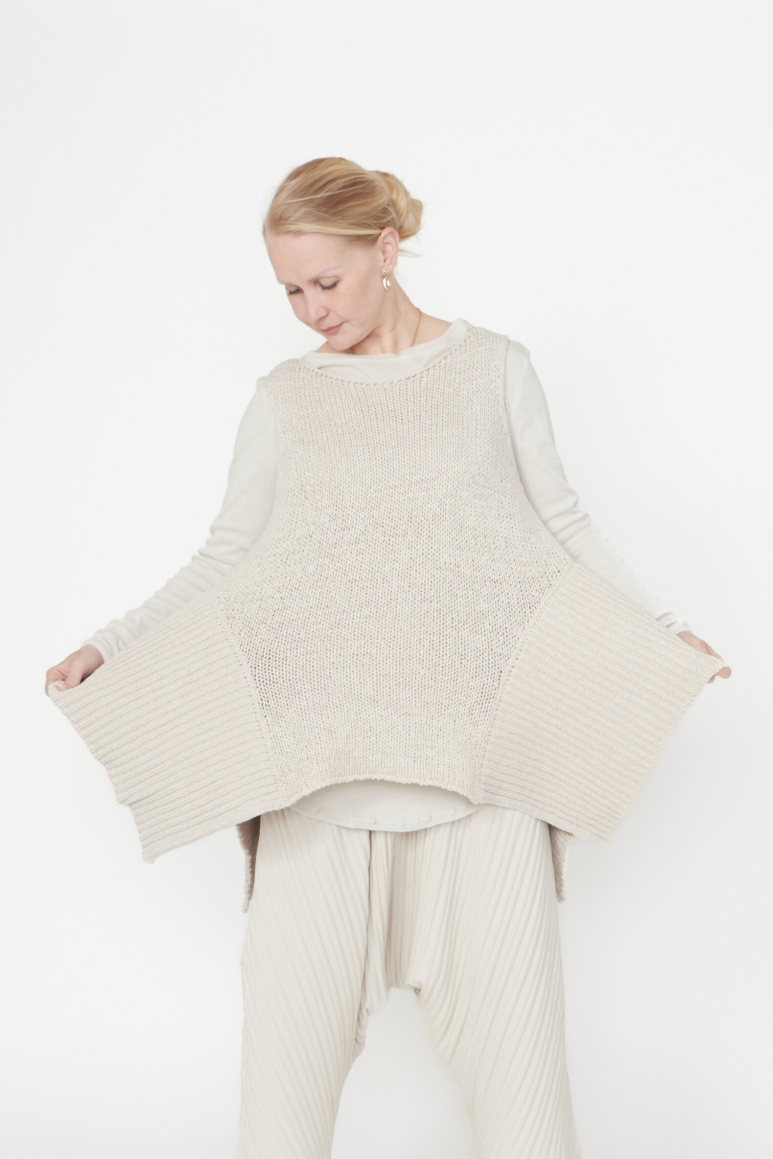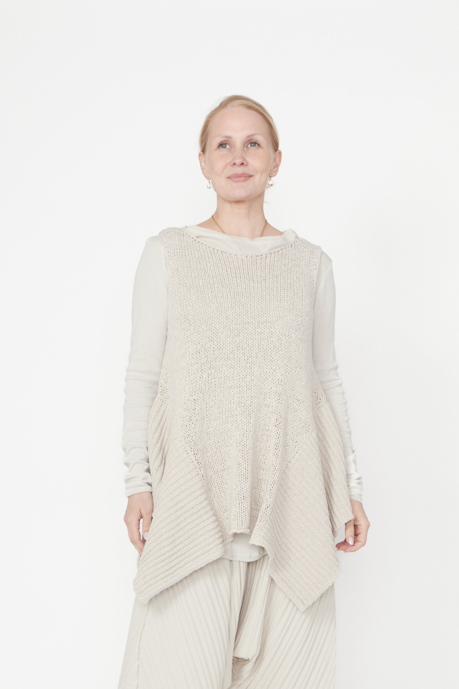 Ærmeløs løst-strikket top lavet i en lækker blød bomuldsblanding. Toppen har brede ribkanter forneden. Findes i flere farver.